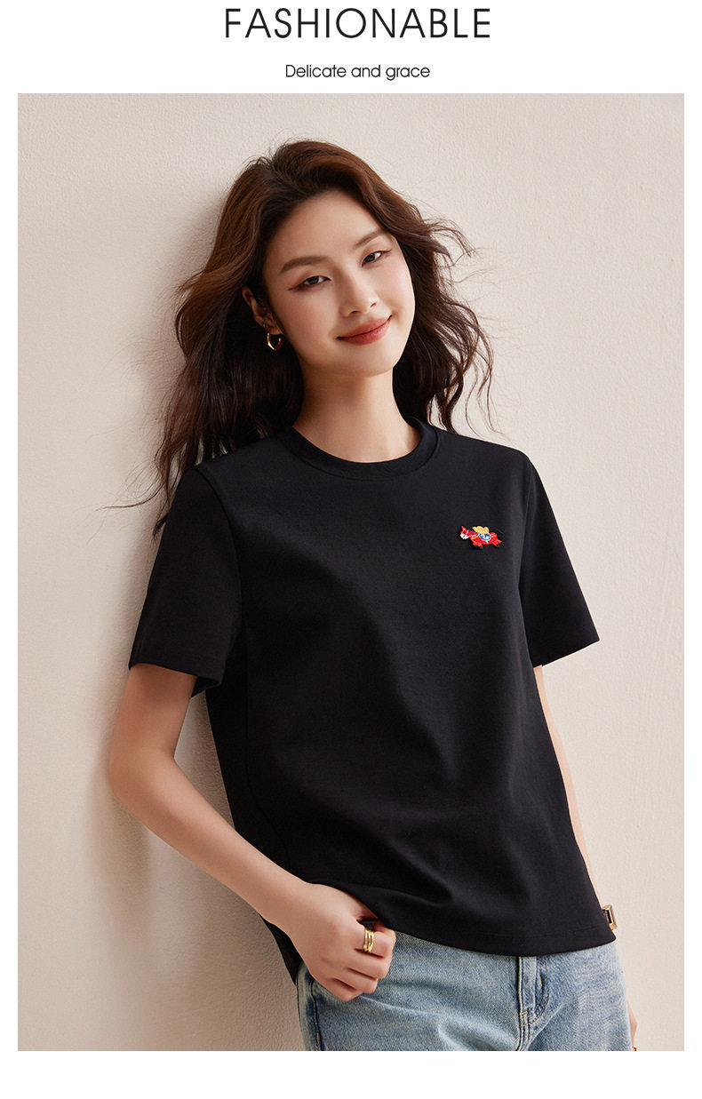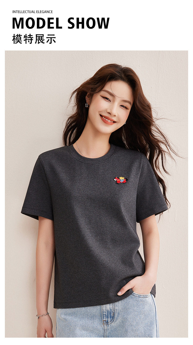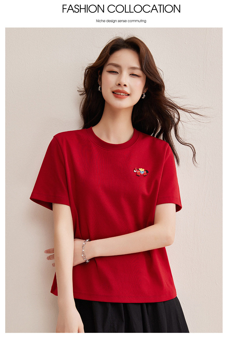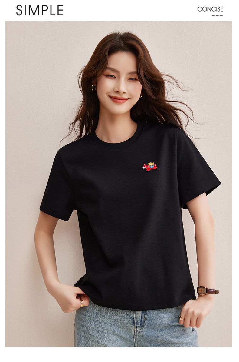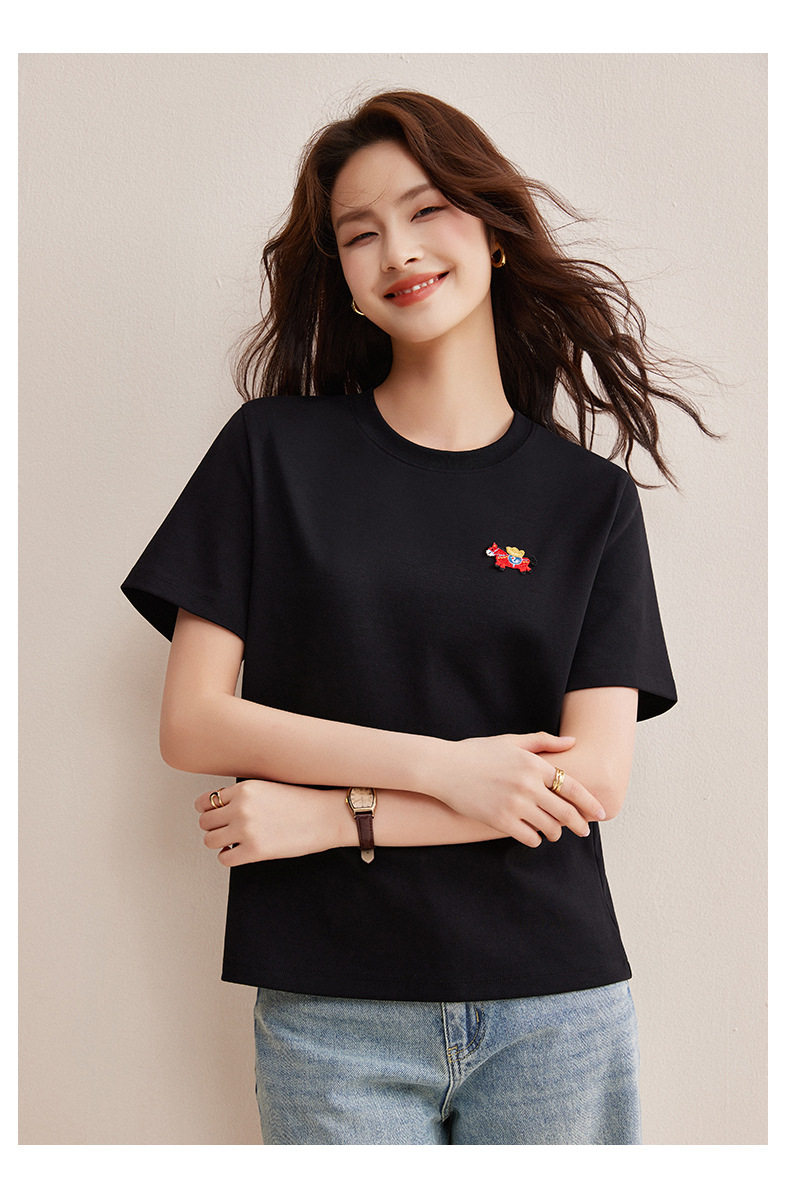 「自j」全新升级【铂金会员109/天猫149/差价40】(03955)洛诗琳小马刺绣纯棉短袖2026春季新款百搭正肩通勤T恤女