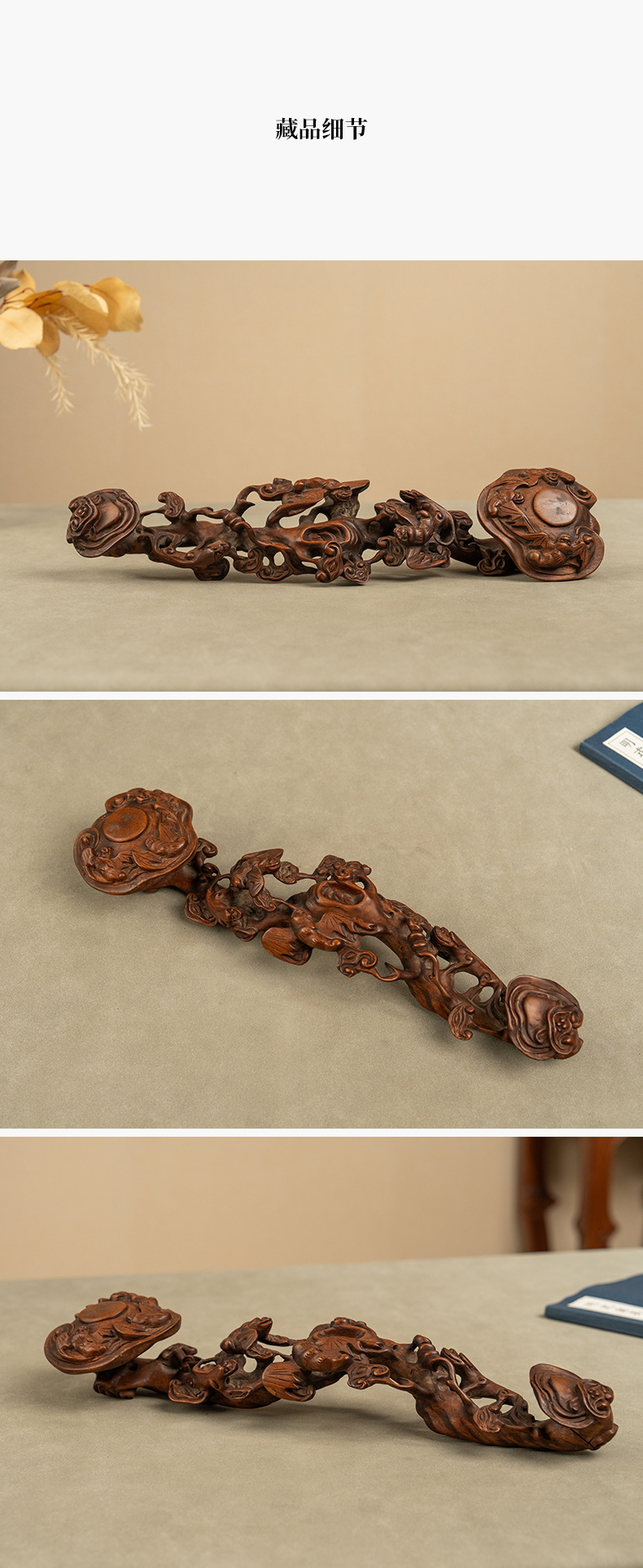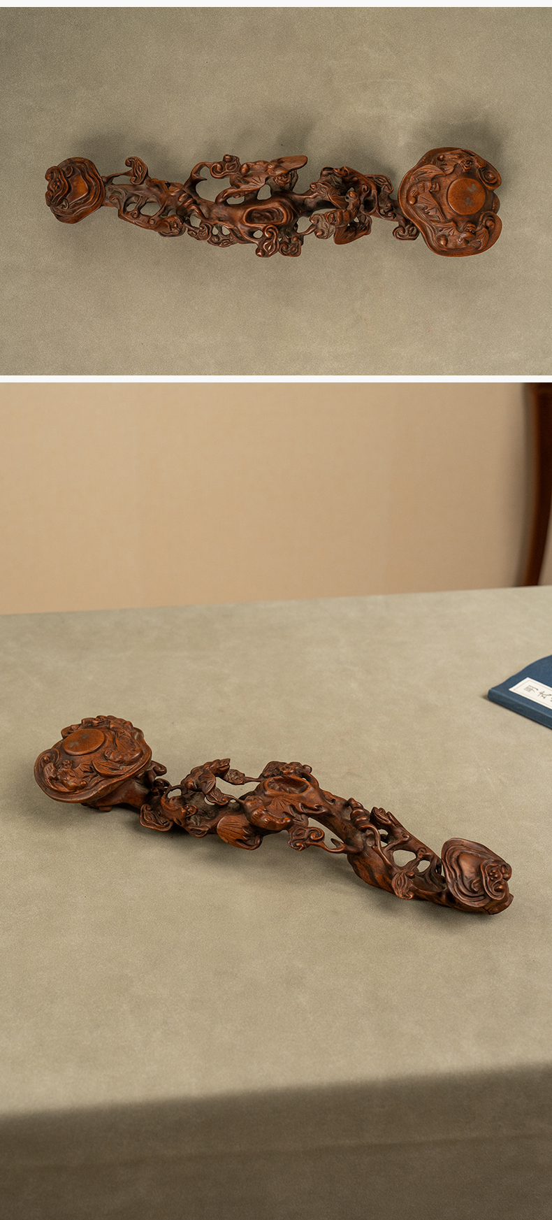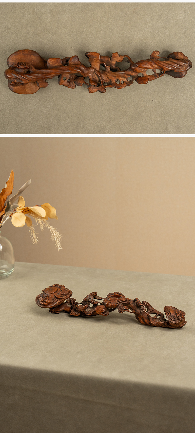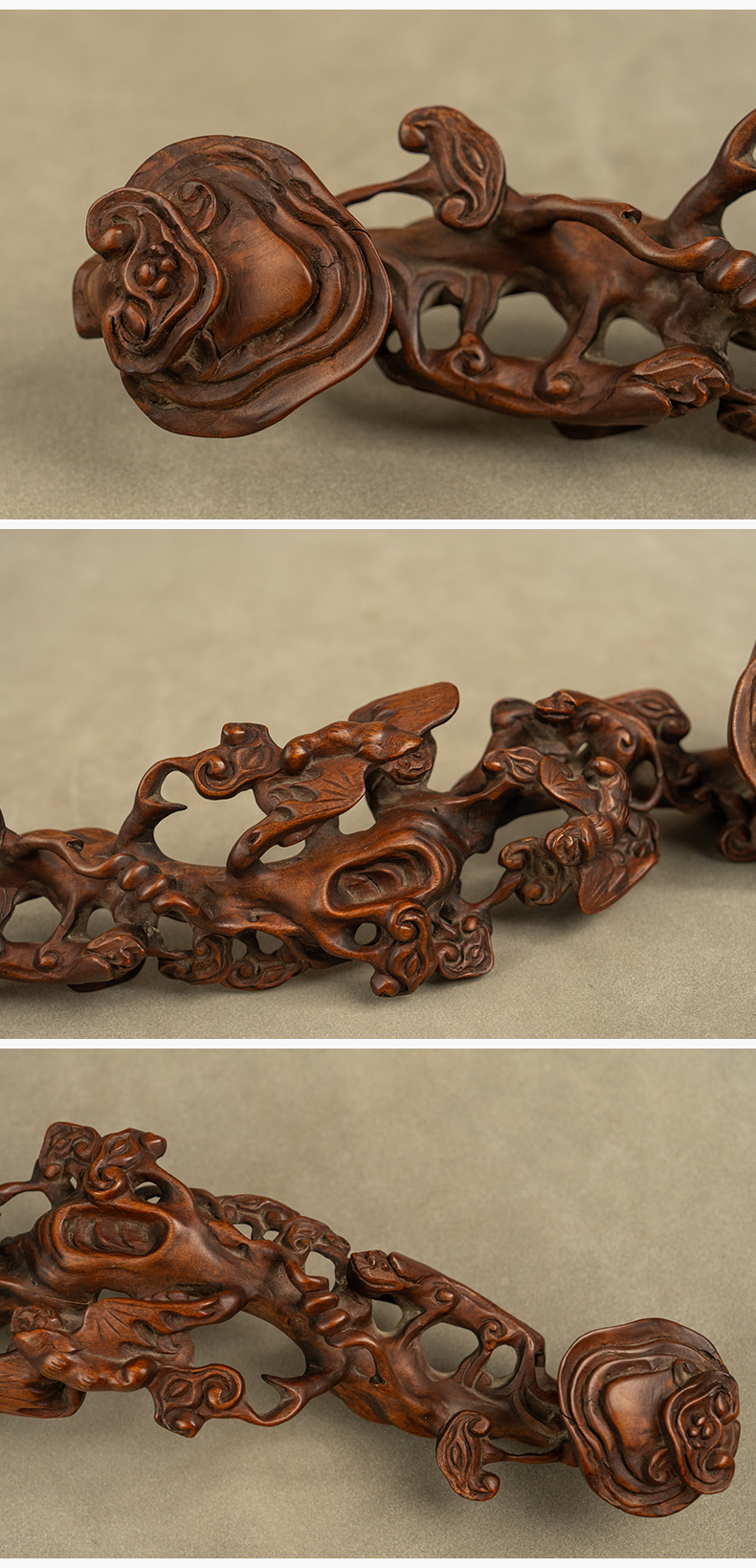 清 黄杨木透雕蝙蝠灵芝如意