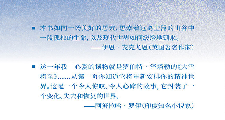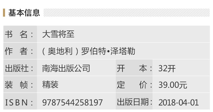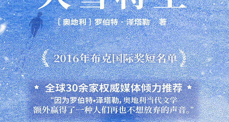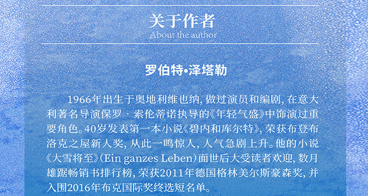 罗伯特·泽塔勒,1966年出生于奥地利维也纳,做过演员和编剧,在意大利导演保罗·索伦蒂诺执导的《年轻气盛》中饰演过重要角色。40岁发表第yi本小说《碧内和库尔特》,荣huo布登布洛克之屋新人奖,从此一鸣惊人,人气急剧上升。他的小说《大雪将至》(EinganzesLeben)面世后大受读者欢迎,数月雄踞畅销书排行榜,荣huo2011年德国格林美尔斯豪森奖,并入围2016年布克奖终选短名单。