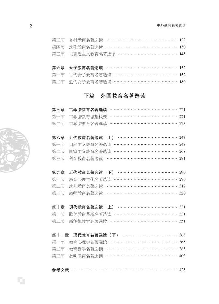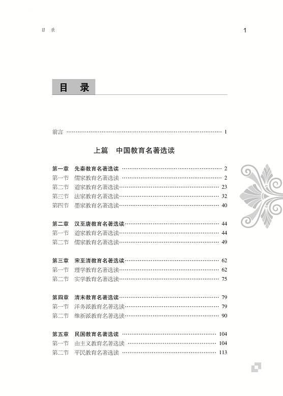 全书分为中国教育名著选读和外国教育名著选读上下两编,每编根据历史时序大致分为古代、近代和现代三个时期,以章节形式呈现,共十一章。各章首先以“教育思想概要”开始,梳理各时期教育思想的发展源流、代表人物、核心主张、历史地位和影响等;然后对每种思想中最具代表性的人物及其代表作品进行导读,具体导读分为两部分,一是作者和作品简介,二是原文节选,并进行“释读”。