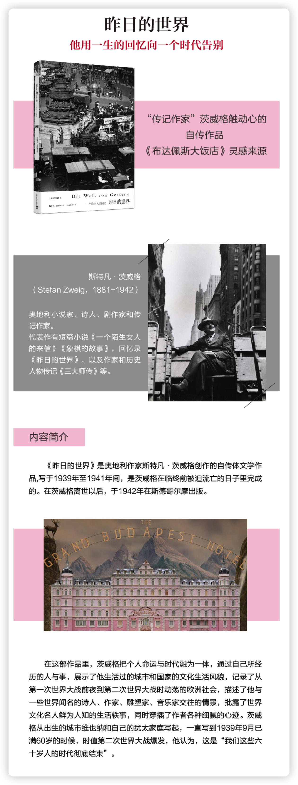 在阅读《昨日的世界》的过程中,我被书中如此多被遮蔽的事实震惊和触动。茨威格书中有许多对自己生活片段的描述,有一些我们也用在了电影中。在读到《昨日的世界》之前,我们其实对他生活的时代所知甚少。――韦斯.安德森,《布达佩斯大饭店》导演
