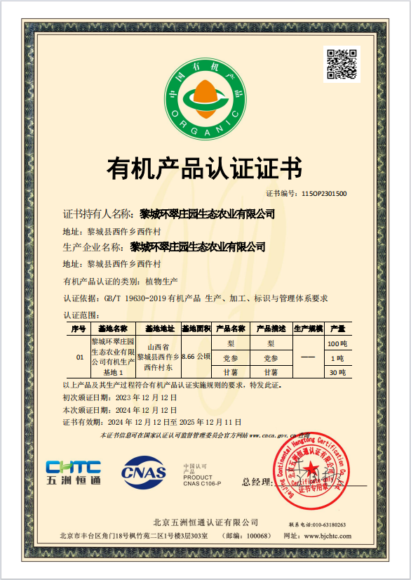 张大哥的果园的部分产品也做了有机认证,有机证书如下