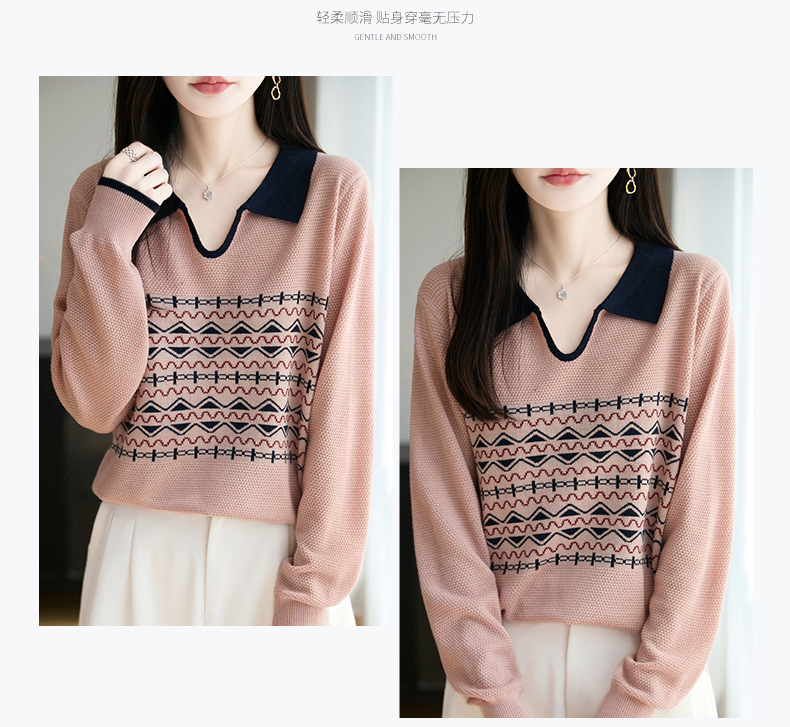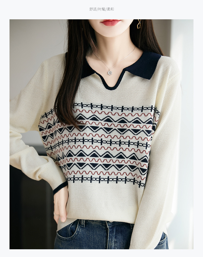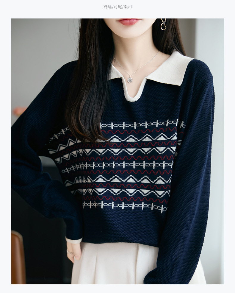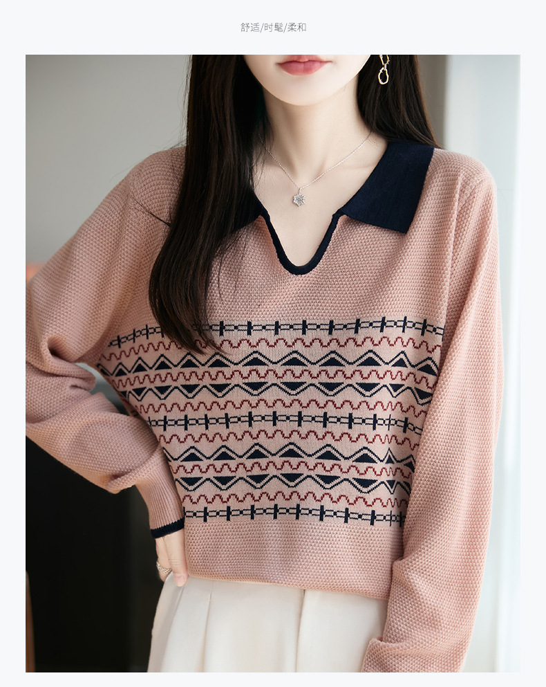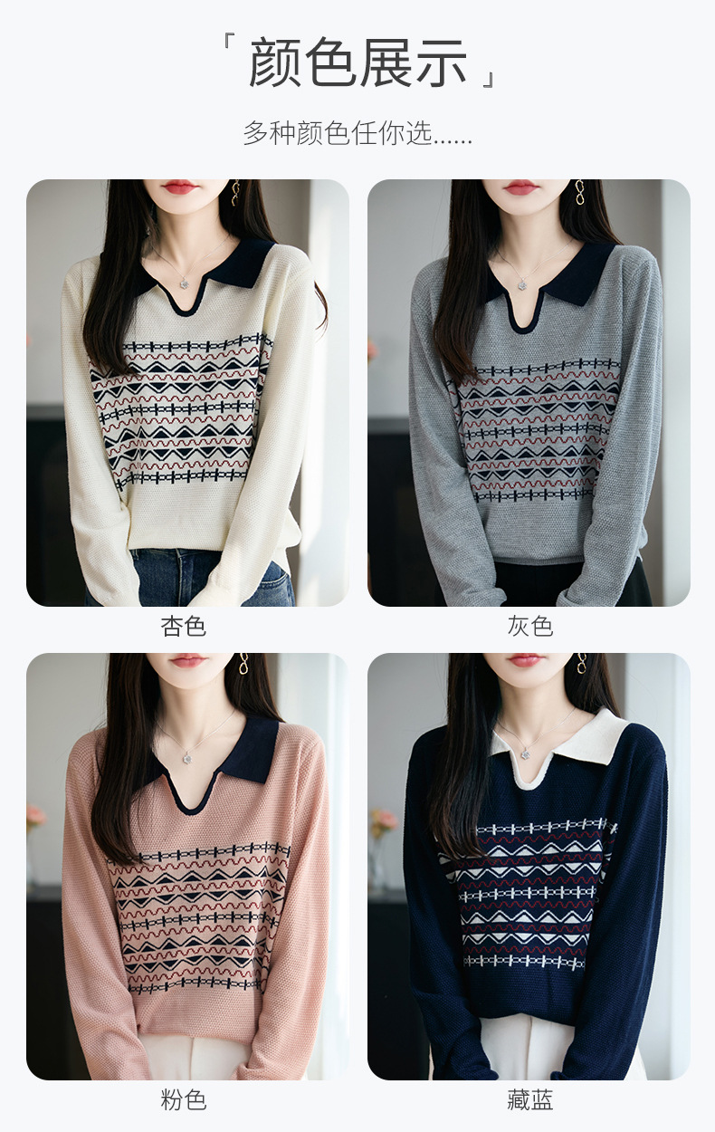 LSX8775 2025年秋季新款撞色polo领提花针织衫女 复古风长袖百搭时尚毛衣
