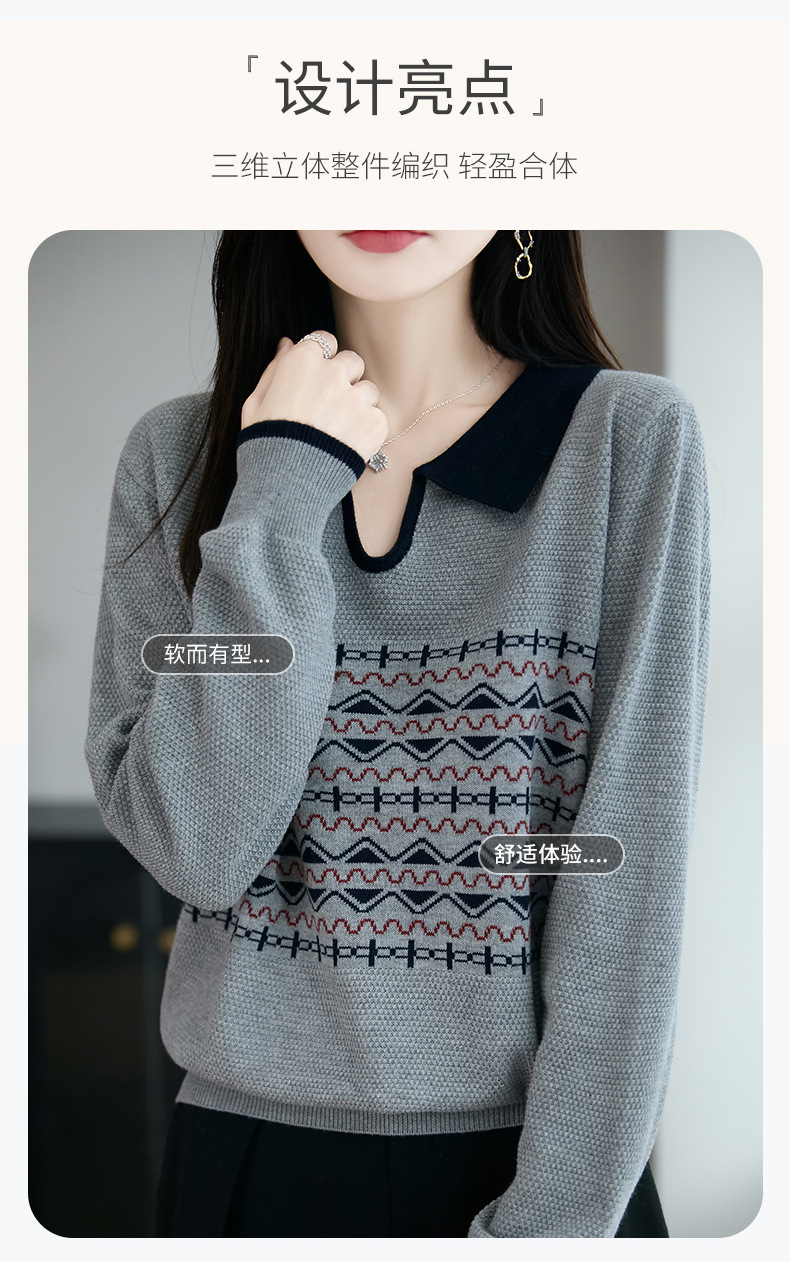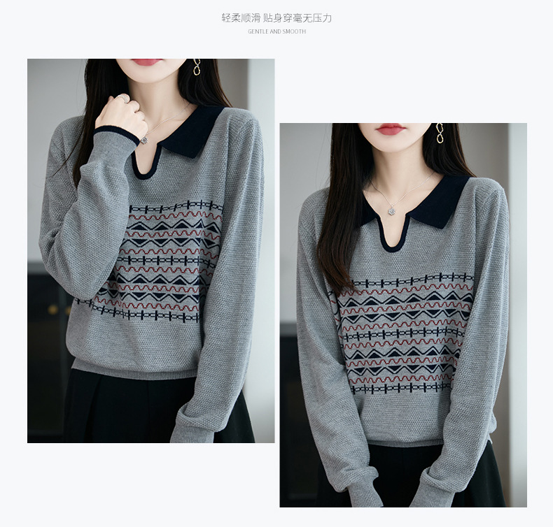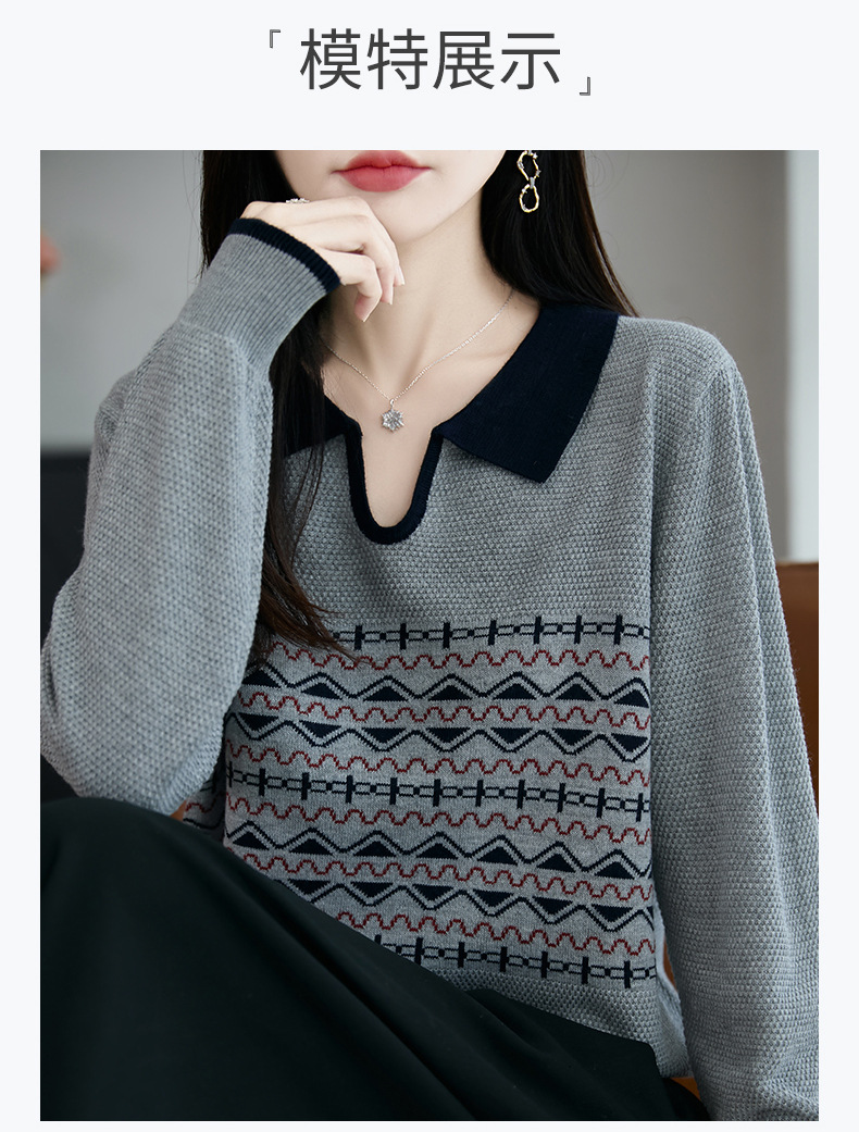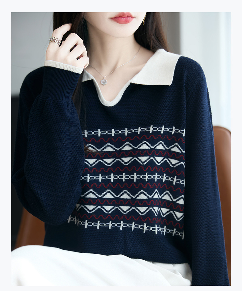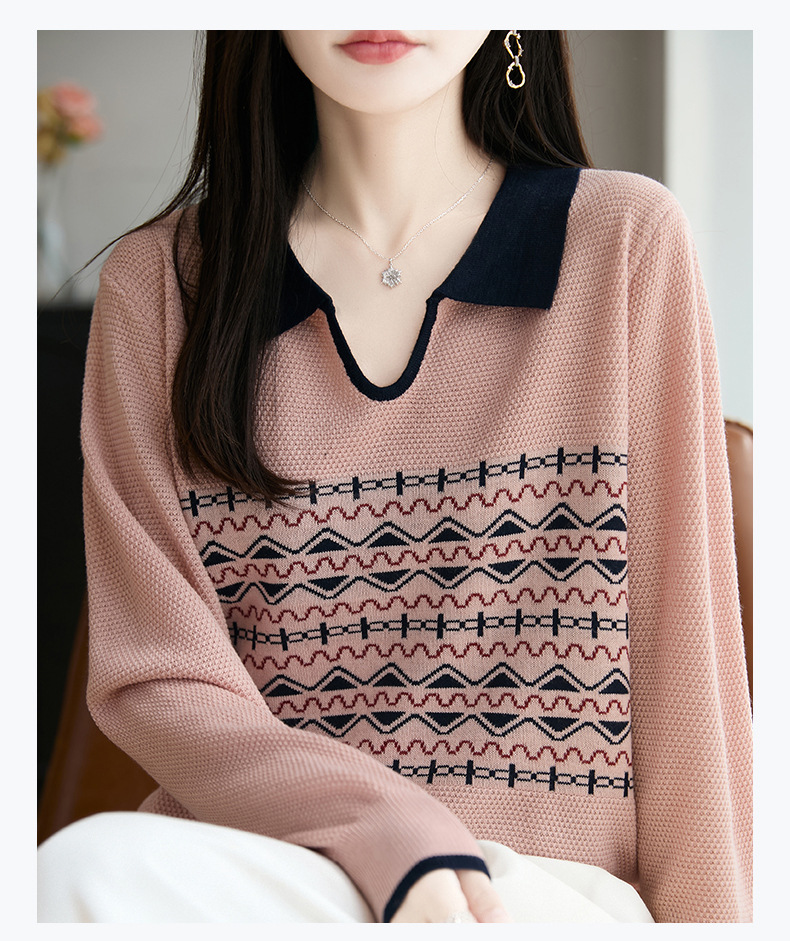 LSX8775 2025年秋季新款撞色polo领提花针织衫女 复古风长袖百搭时尚毛衣