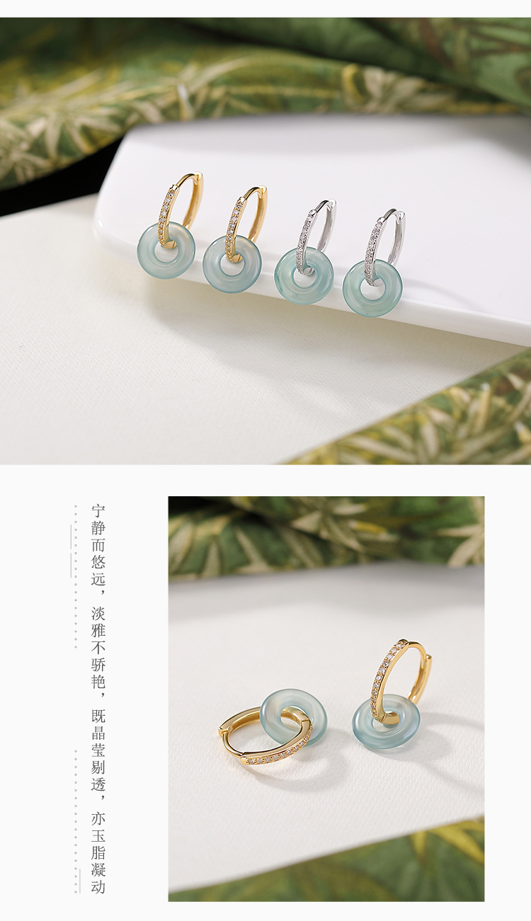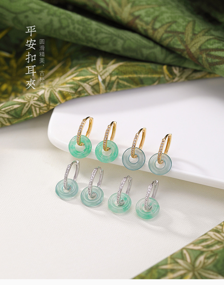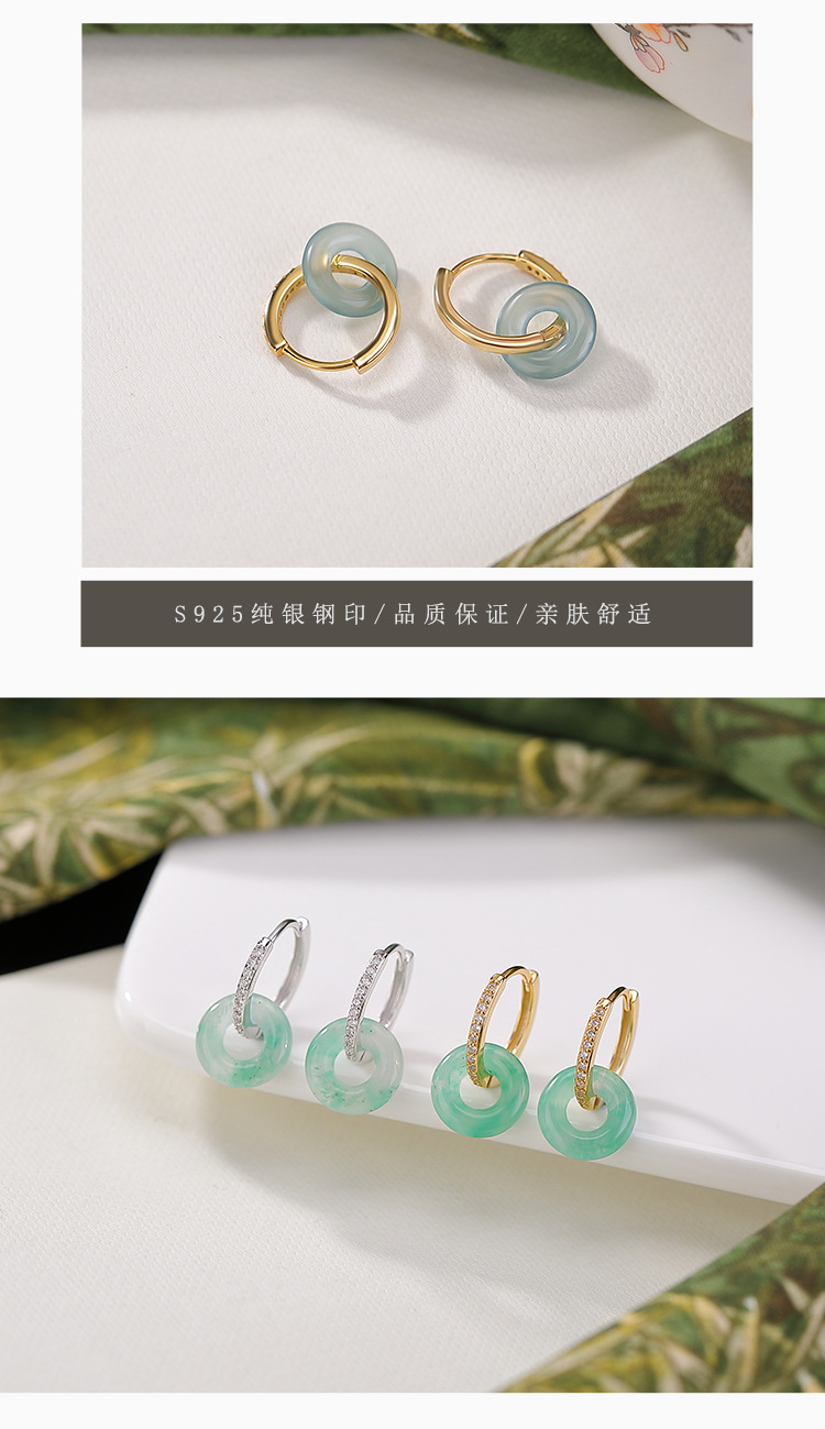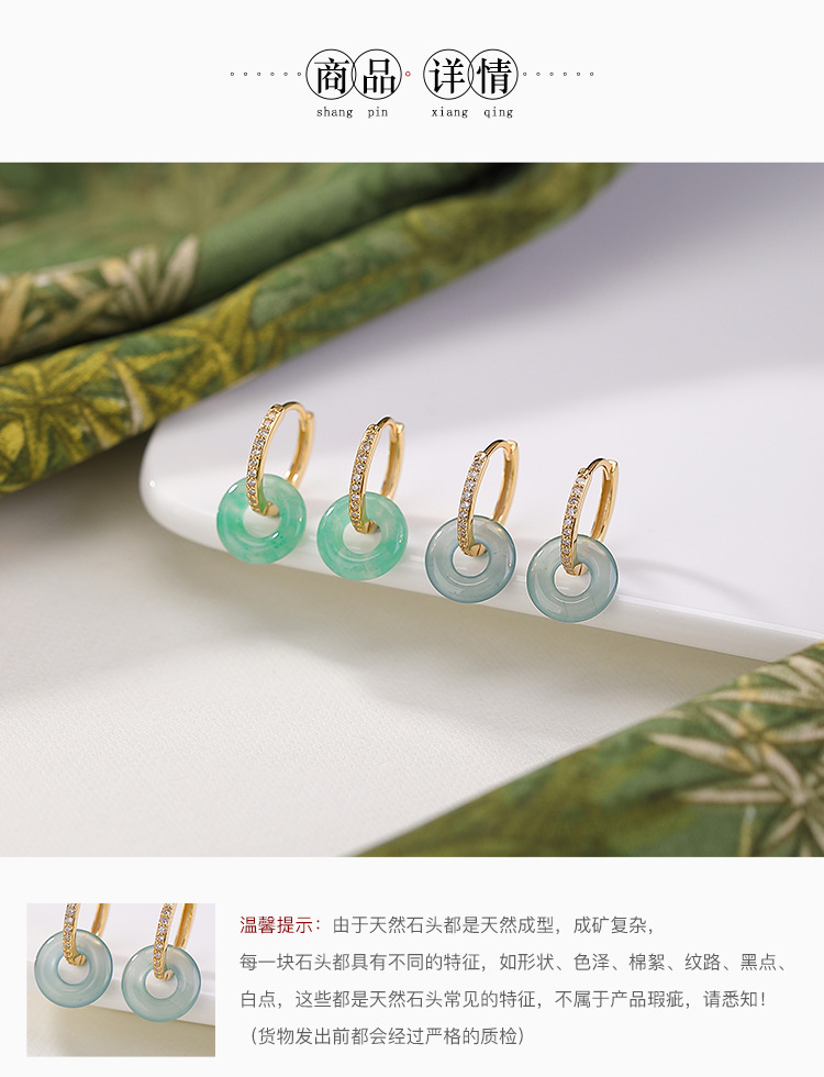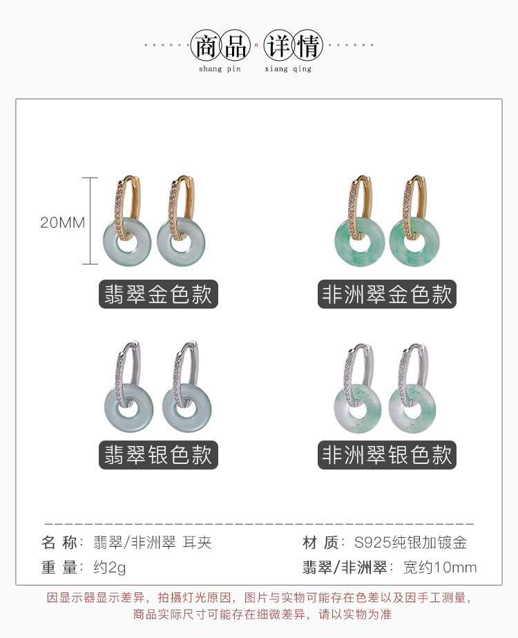 蓝水翡翠S925非洲翠纯银镀金,平安扣圆圈银耳夹简约耳饰CW-869