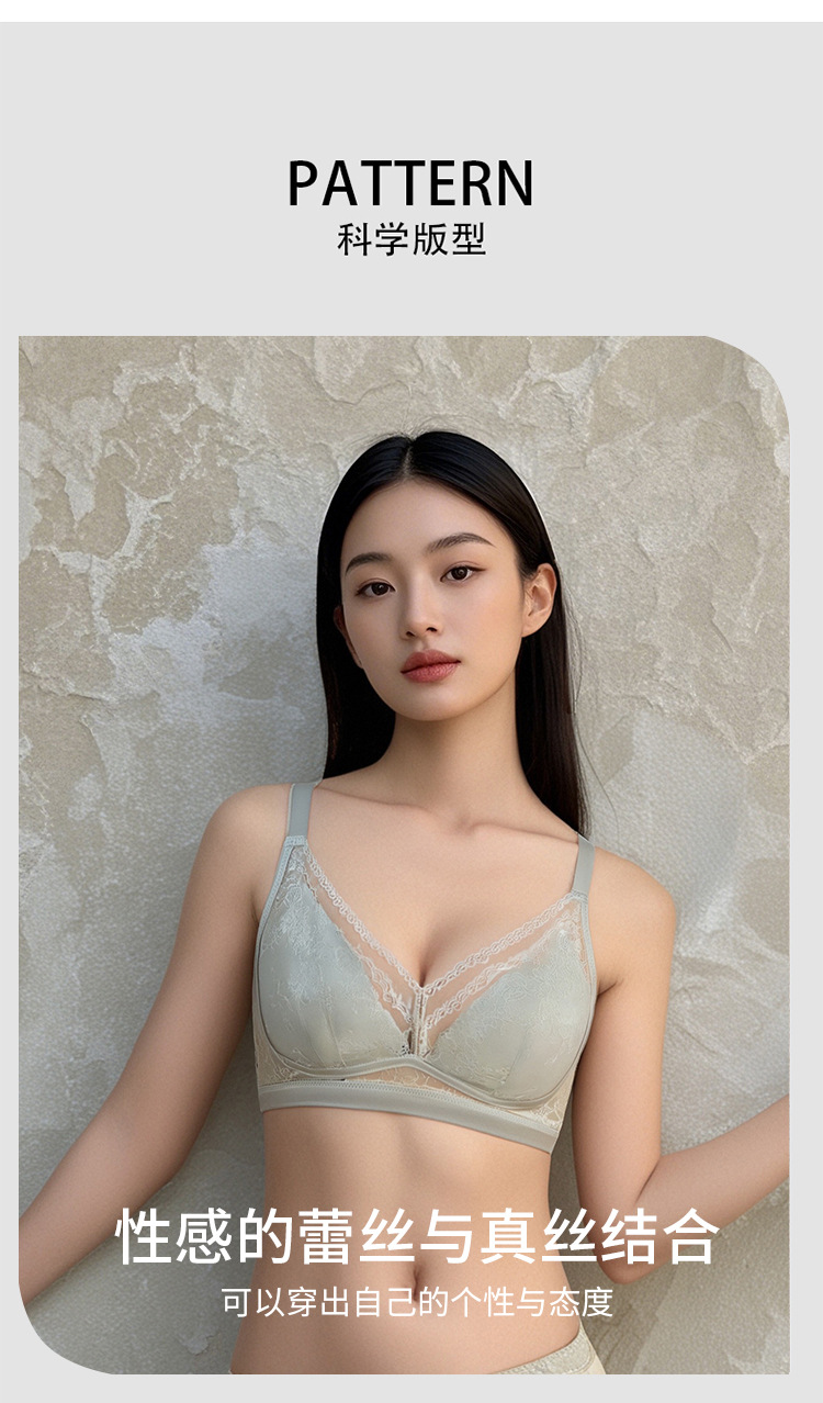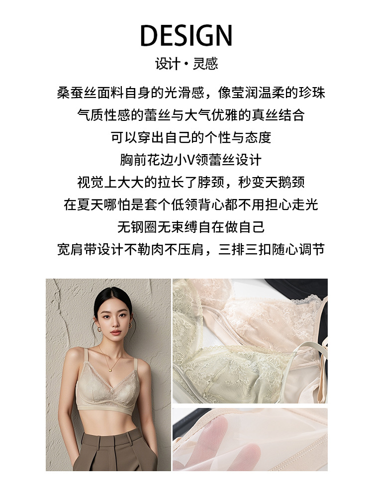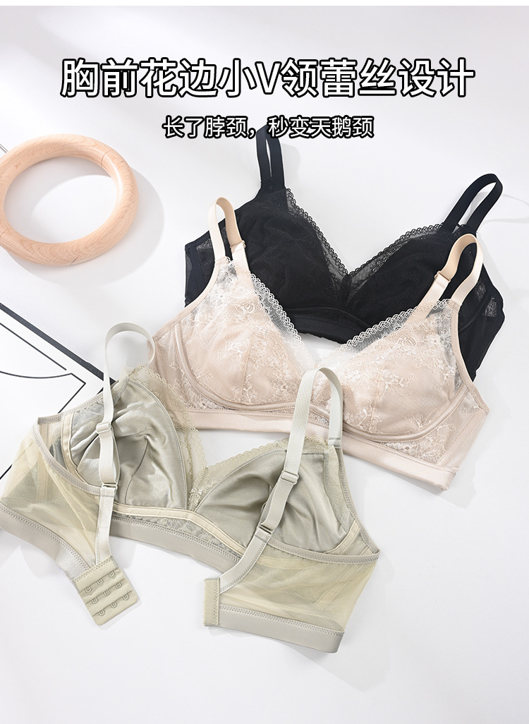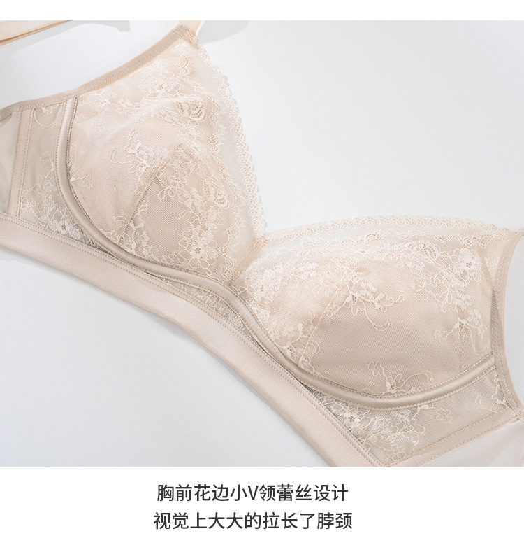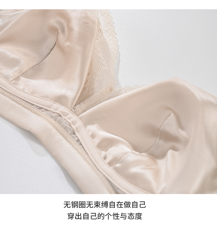 真丝无钢圈呼吸感内衣 桑蚕丝蕾丝花边小V领聚拢收副乳文胸TG02S264