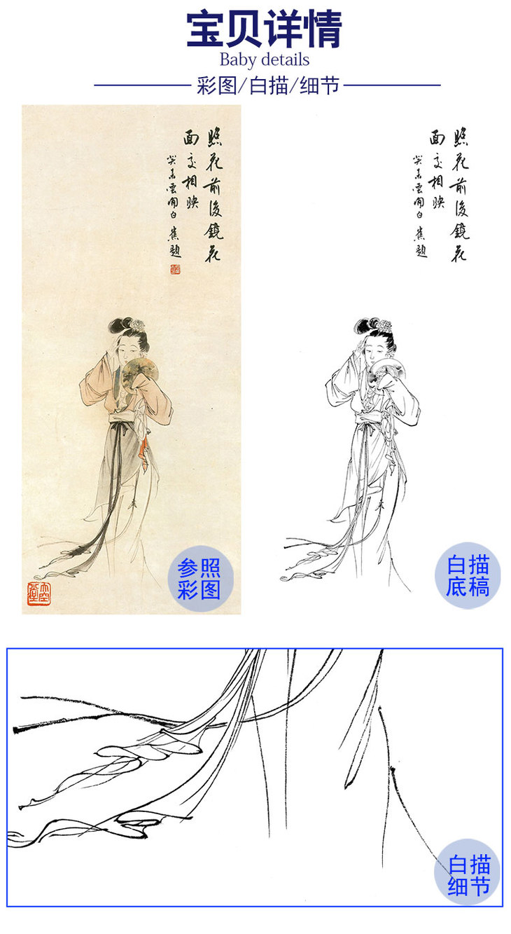 胡也佛竖幅工笔传统仕女人物白描底稿-仕女照镜-HY22