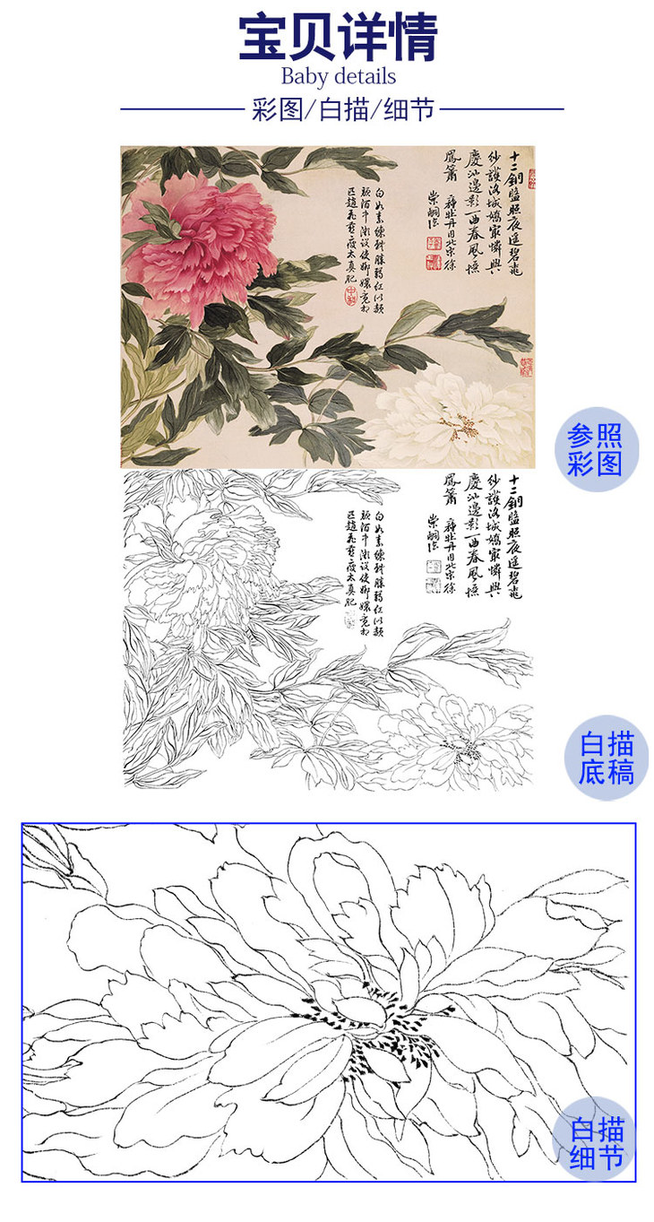竖幅工笔花鸟白描底稿-周中耀-牡丹-春华-FV01
