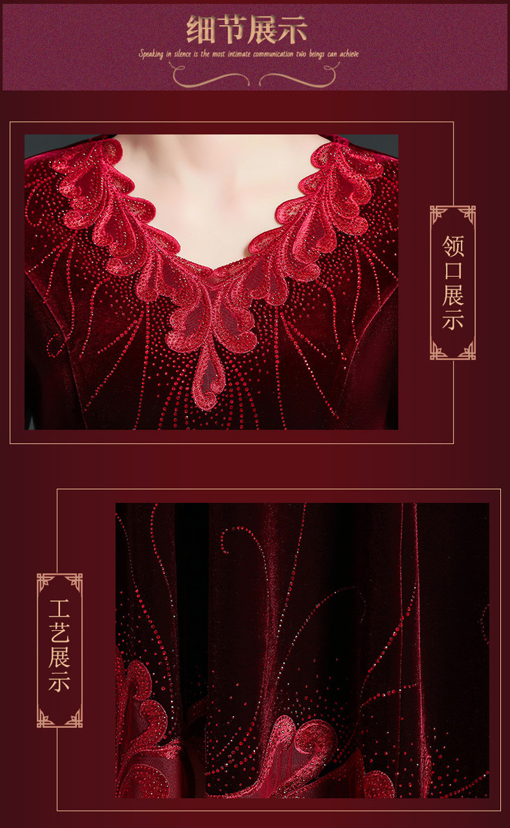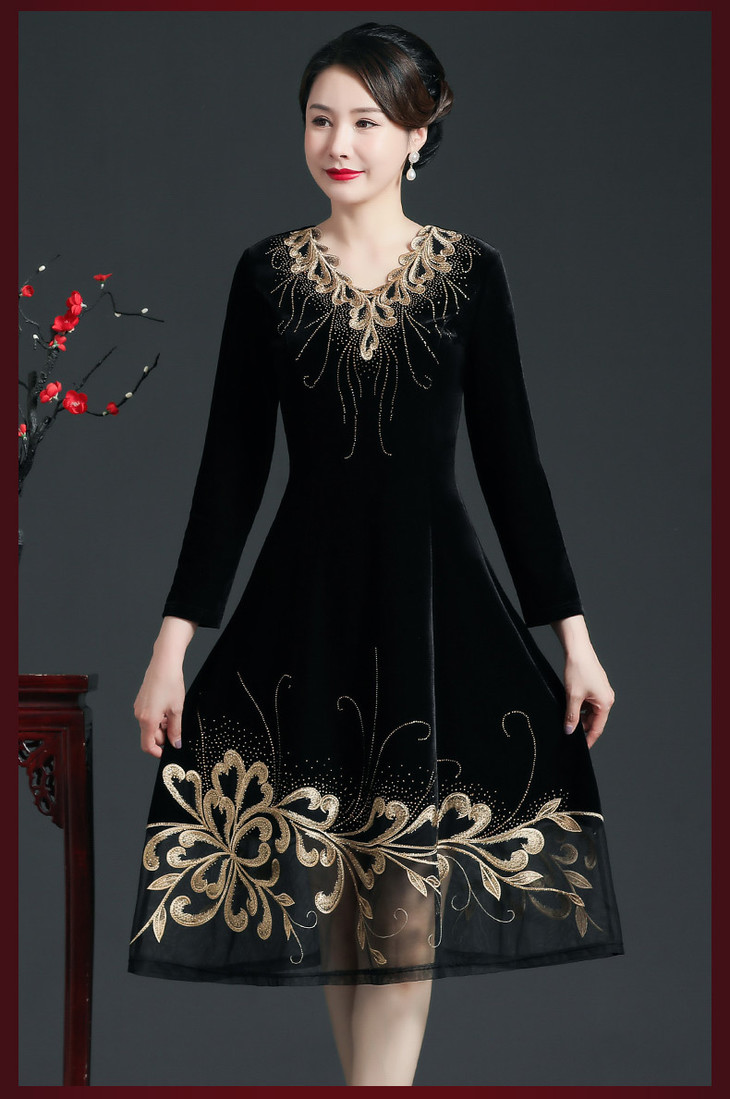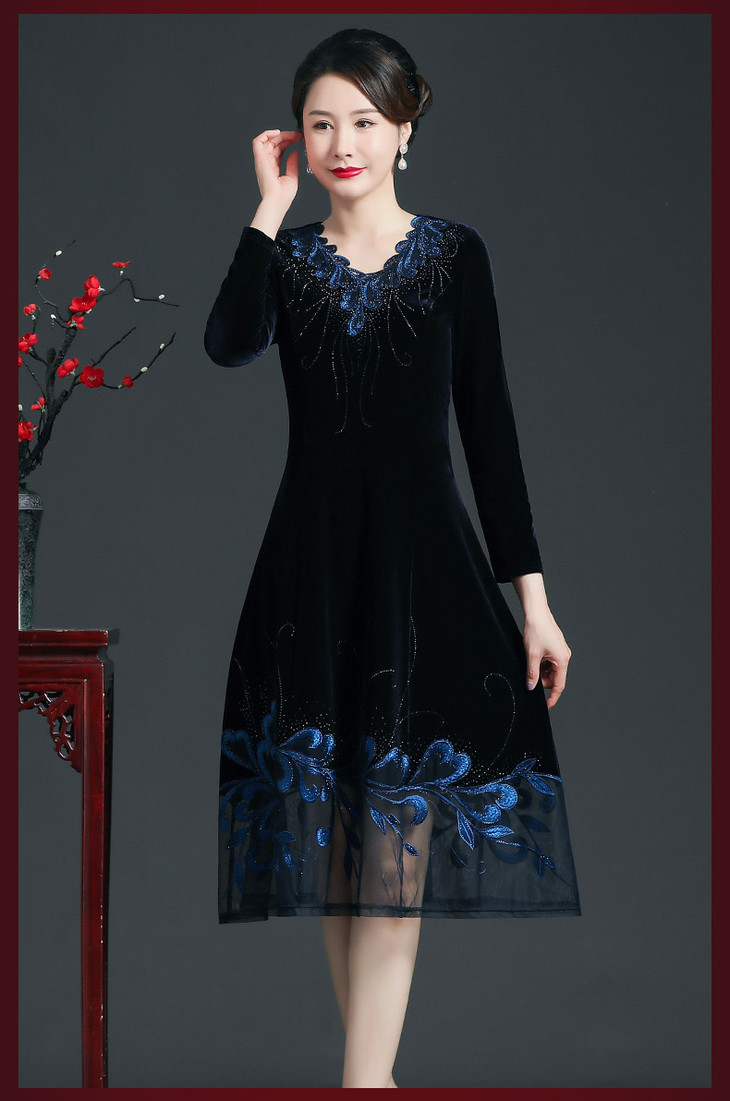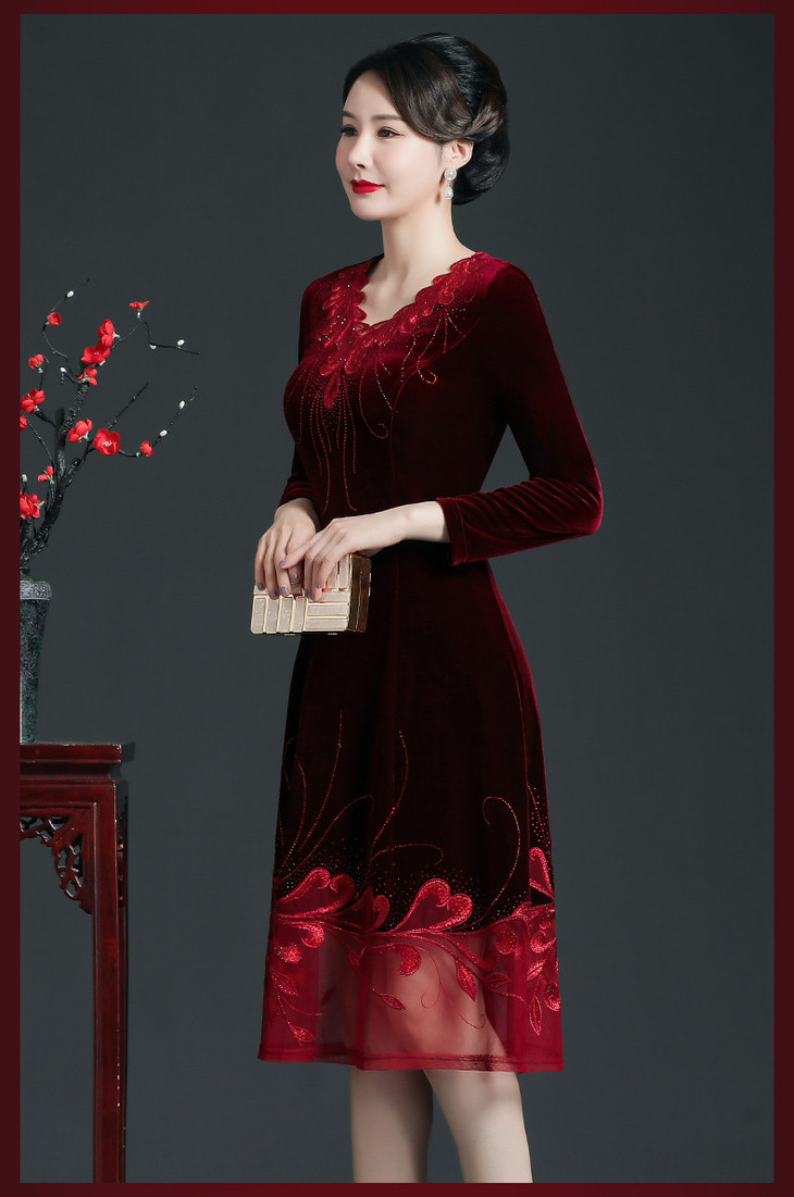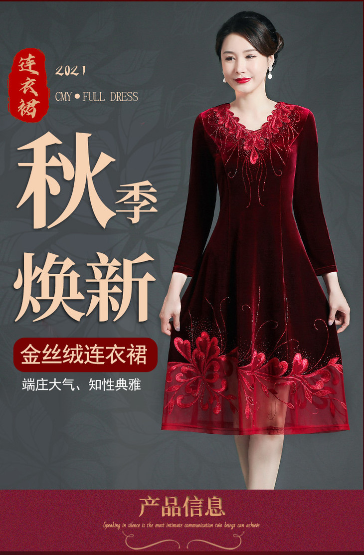 CMY69281新款优雅气质修身V领长袖拼接蕾丝刺绣中长款金丝绒连衣裙