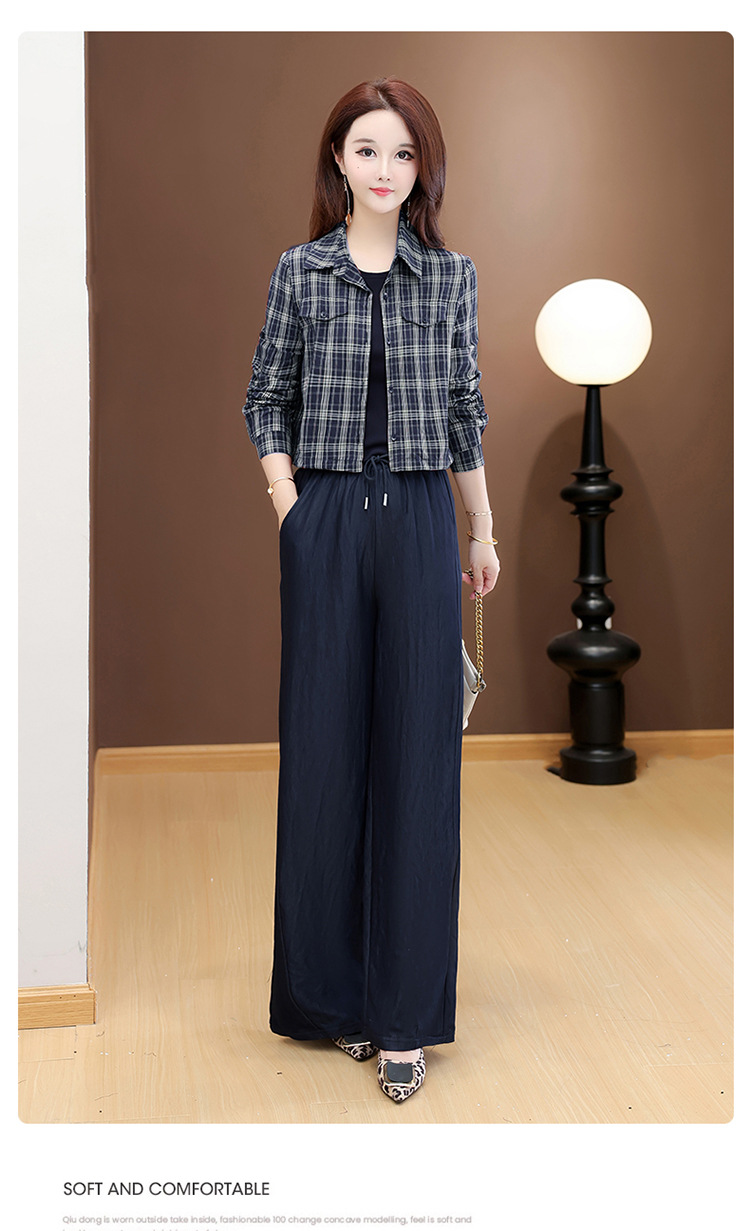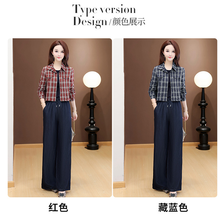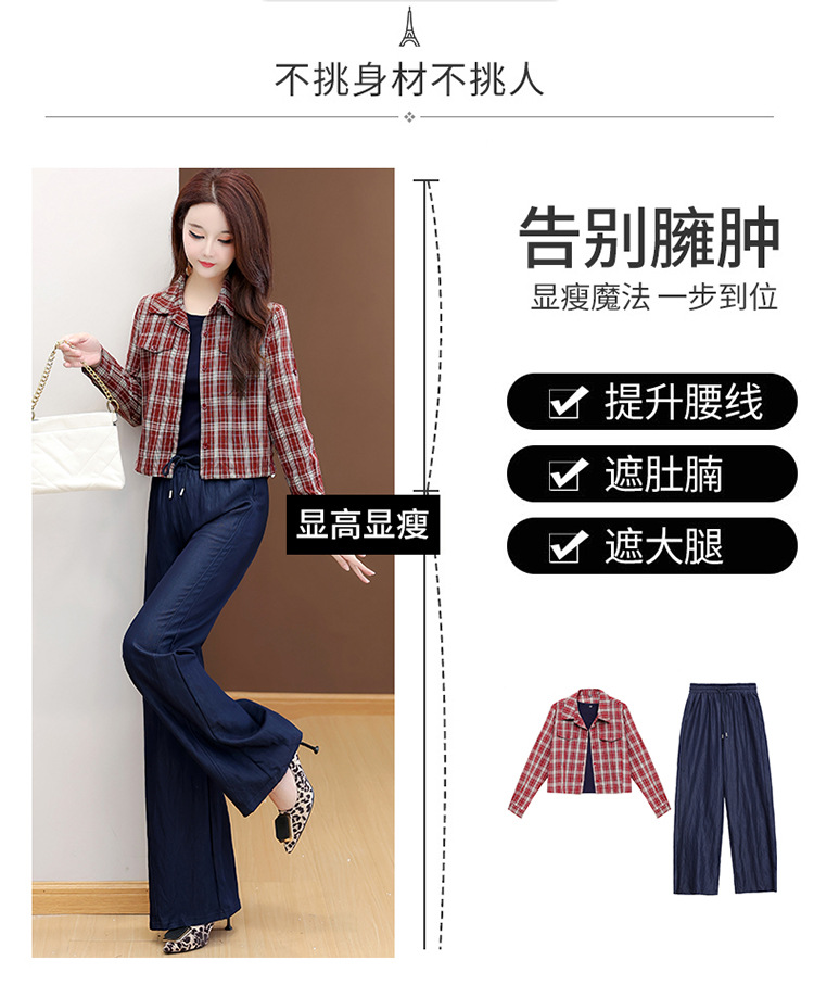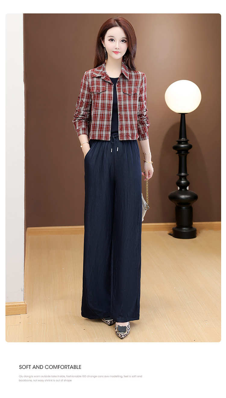 QYM 53B254-Y优雅三件套背心+格纹短款衬衫+高腰直筒阔腿裤套装