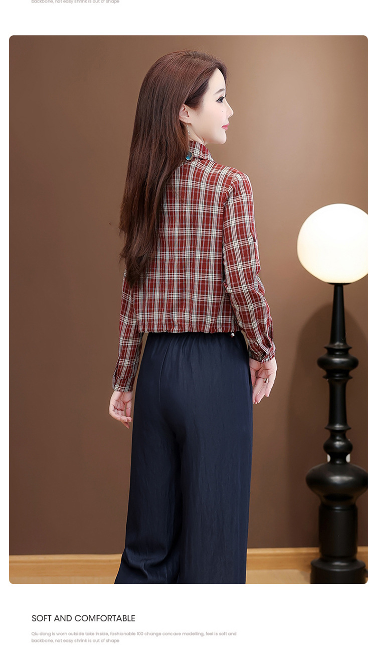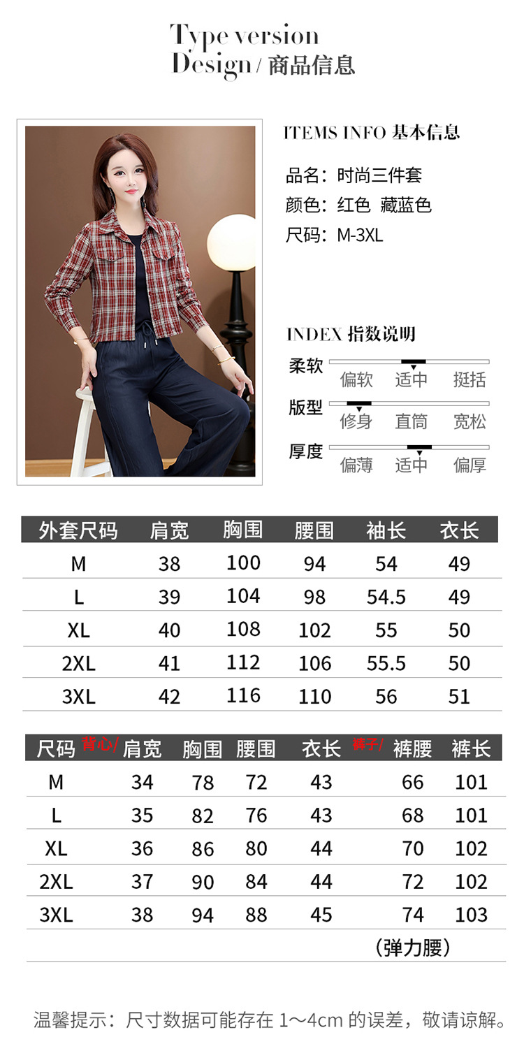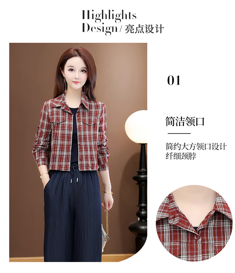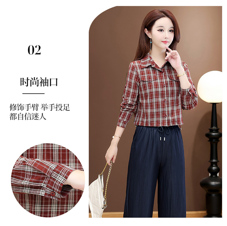 QYM 53B254-Y优雅三件套背心+格纹短款衬衫+高腰直筒阔腿裤套装