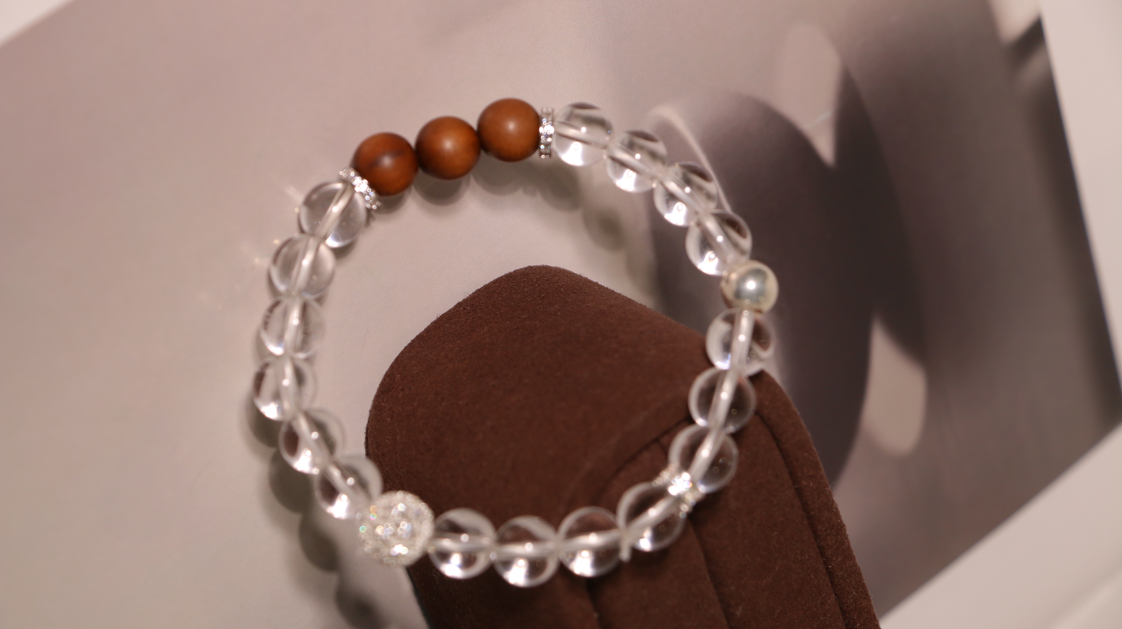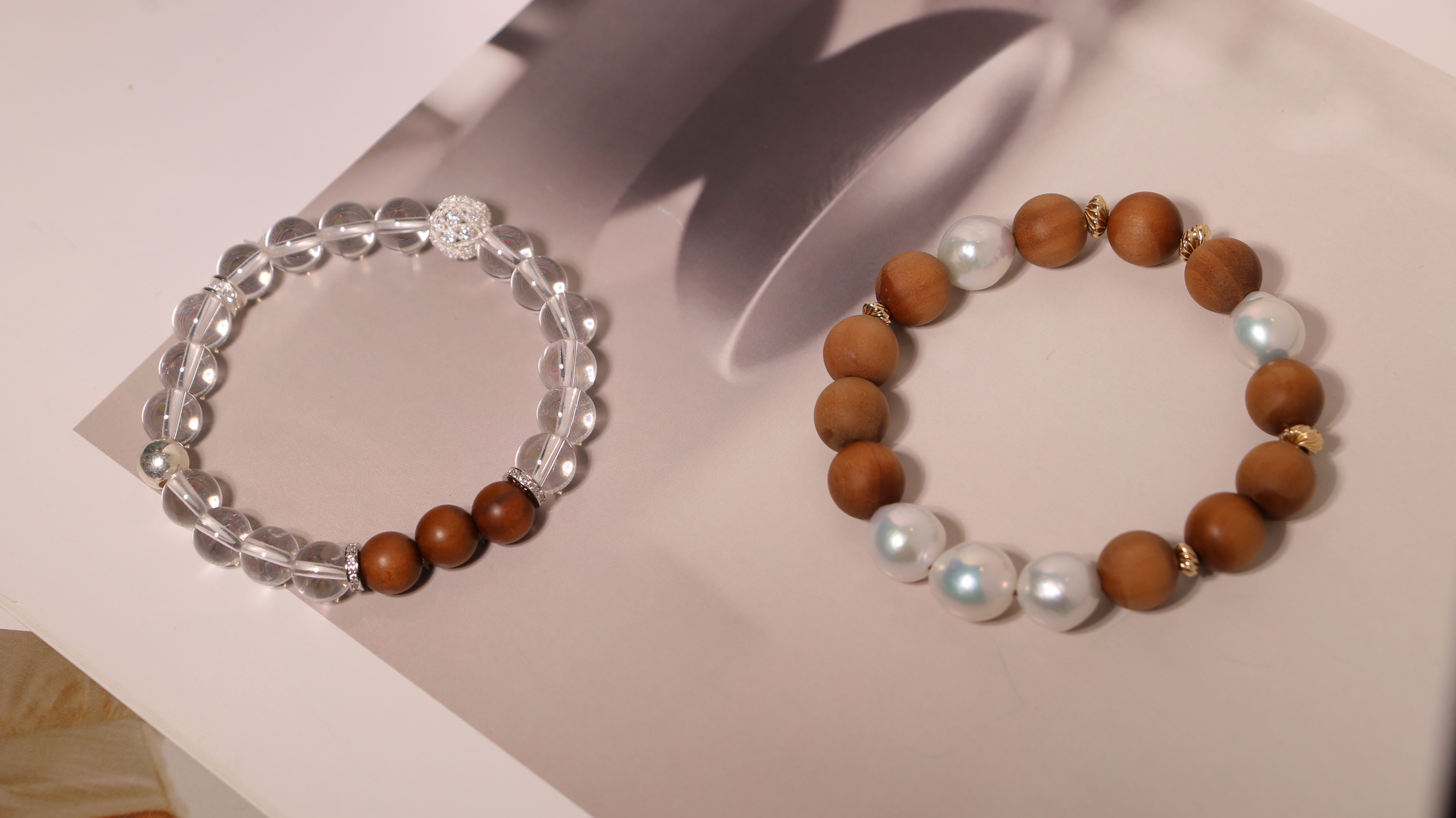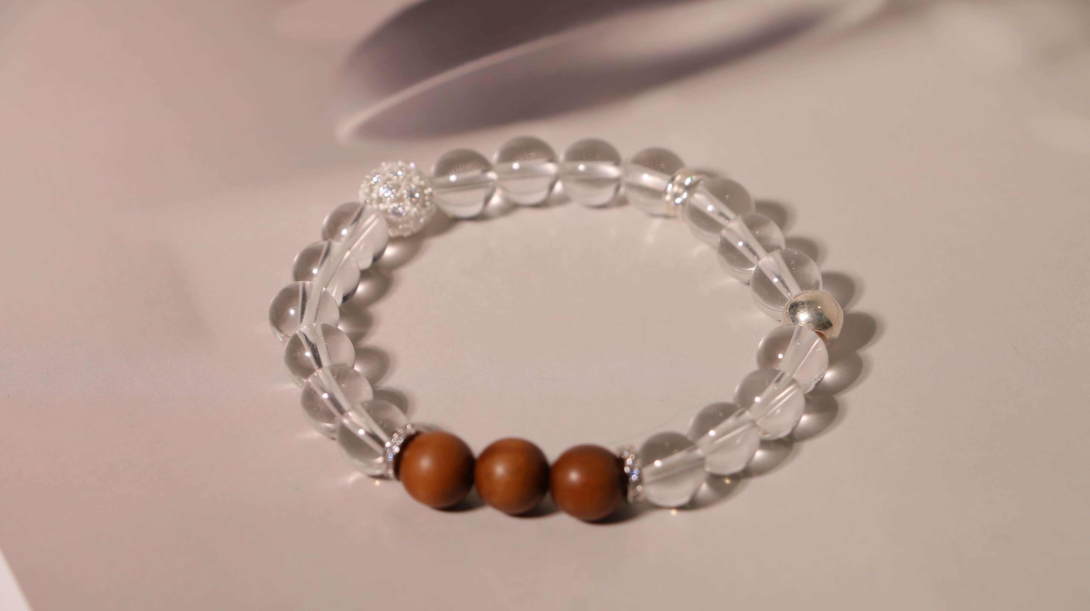 约8mm白水晶/檀香,白水晶剔透如晨露,折射着每一寸阳光,以无色之姿,承载万般能量,净化负磁场;檀香木质温润中藏着大地深处的呼吸,涤净心尘喧嚣。