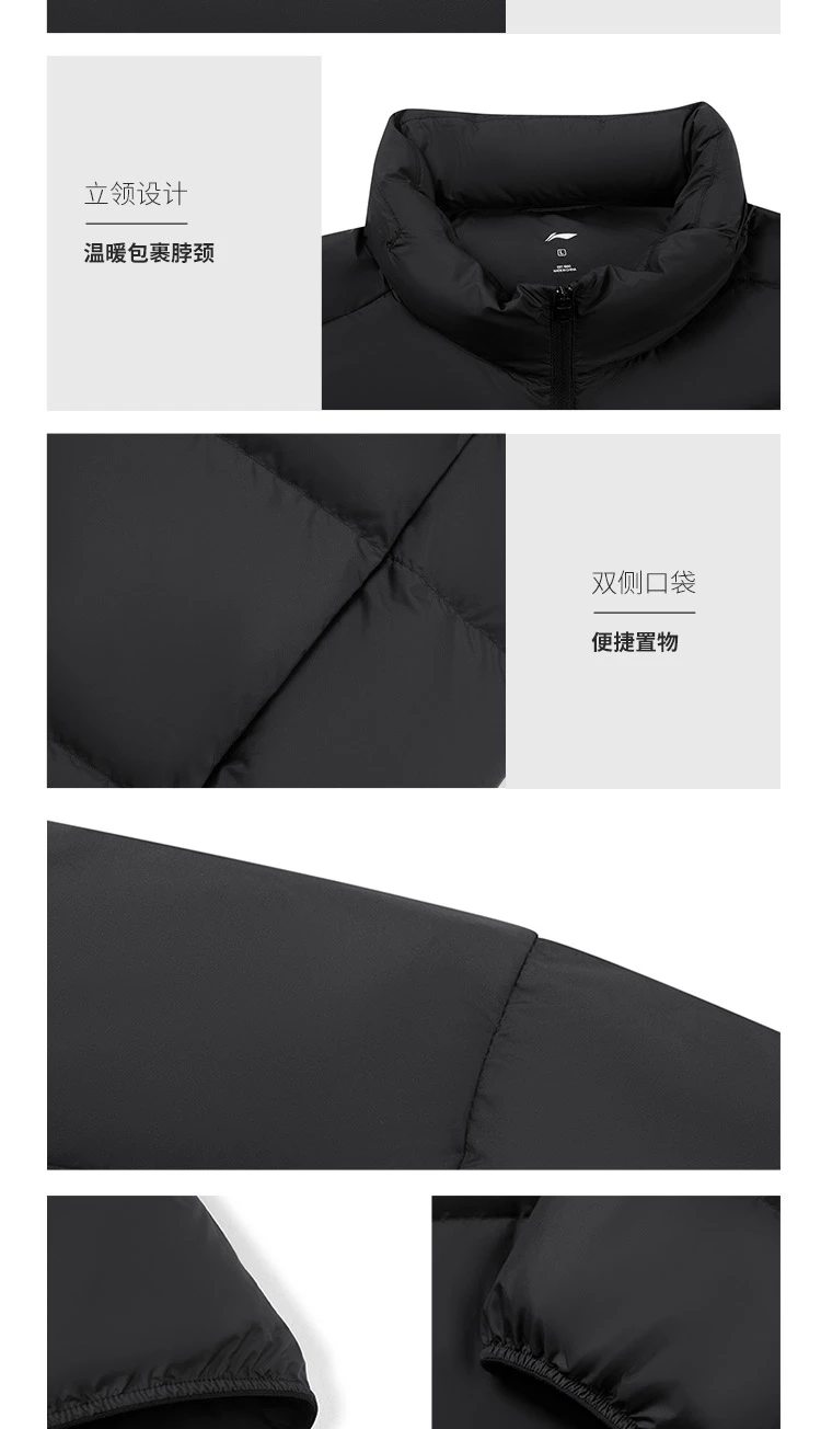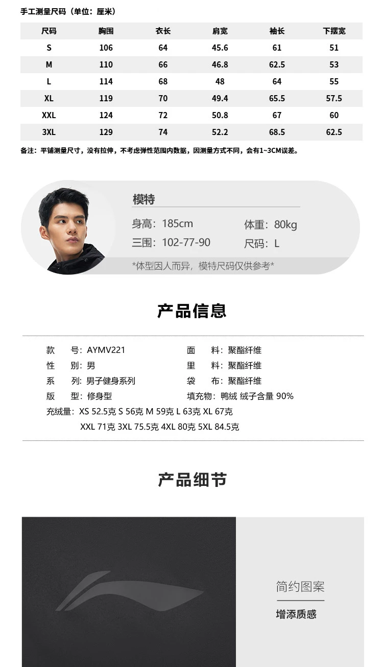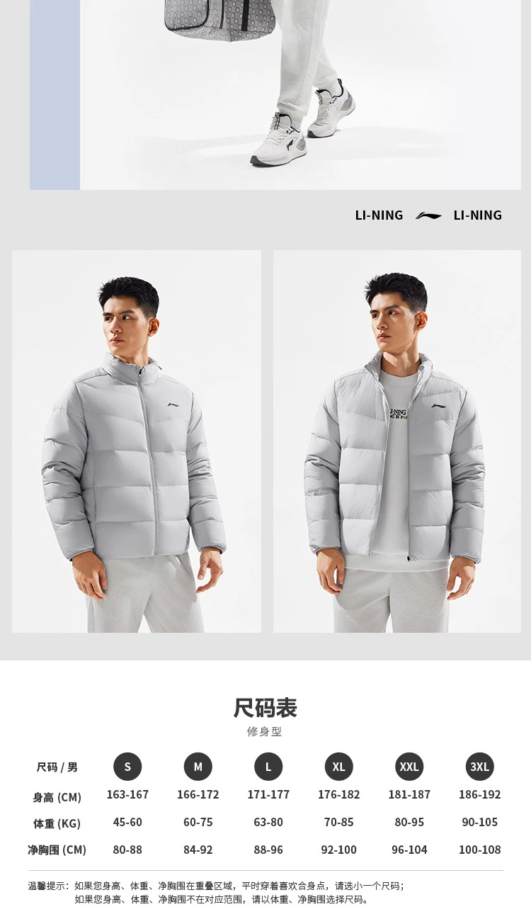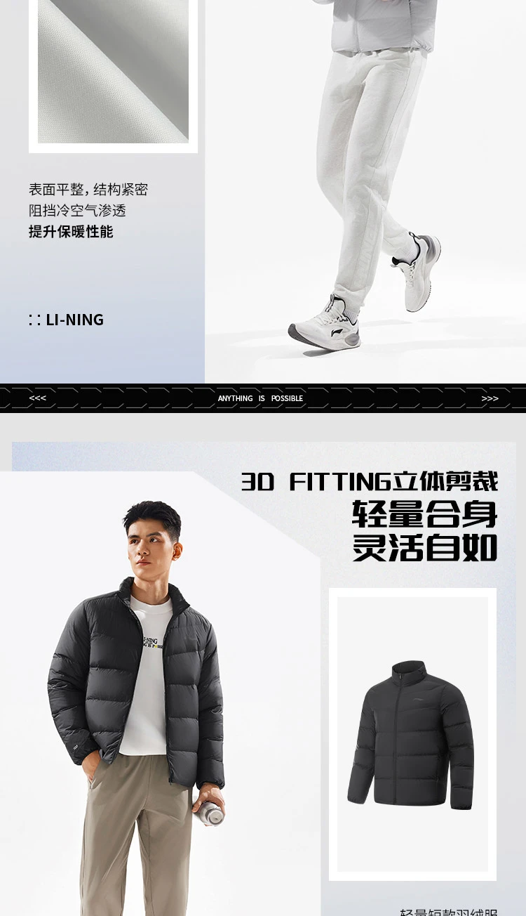 李宁男子立体裁剪修身90%鸭绒短羽绒服AYMV221