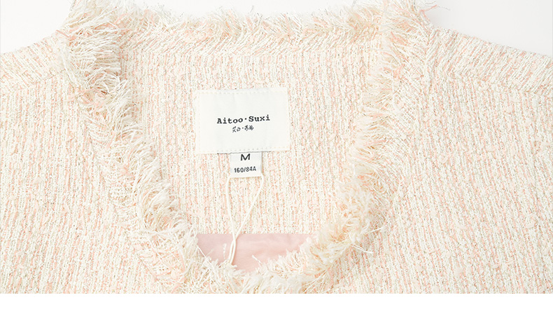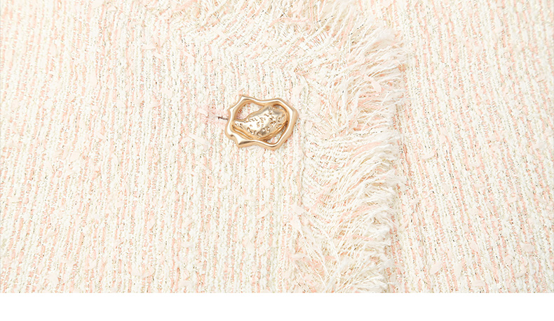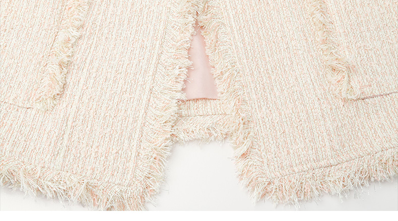 核心卖点:白色肌理面料、圆领设计、短袖版型、单排扣、小香风、显瘦显高
