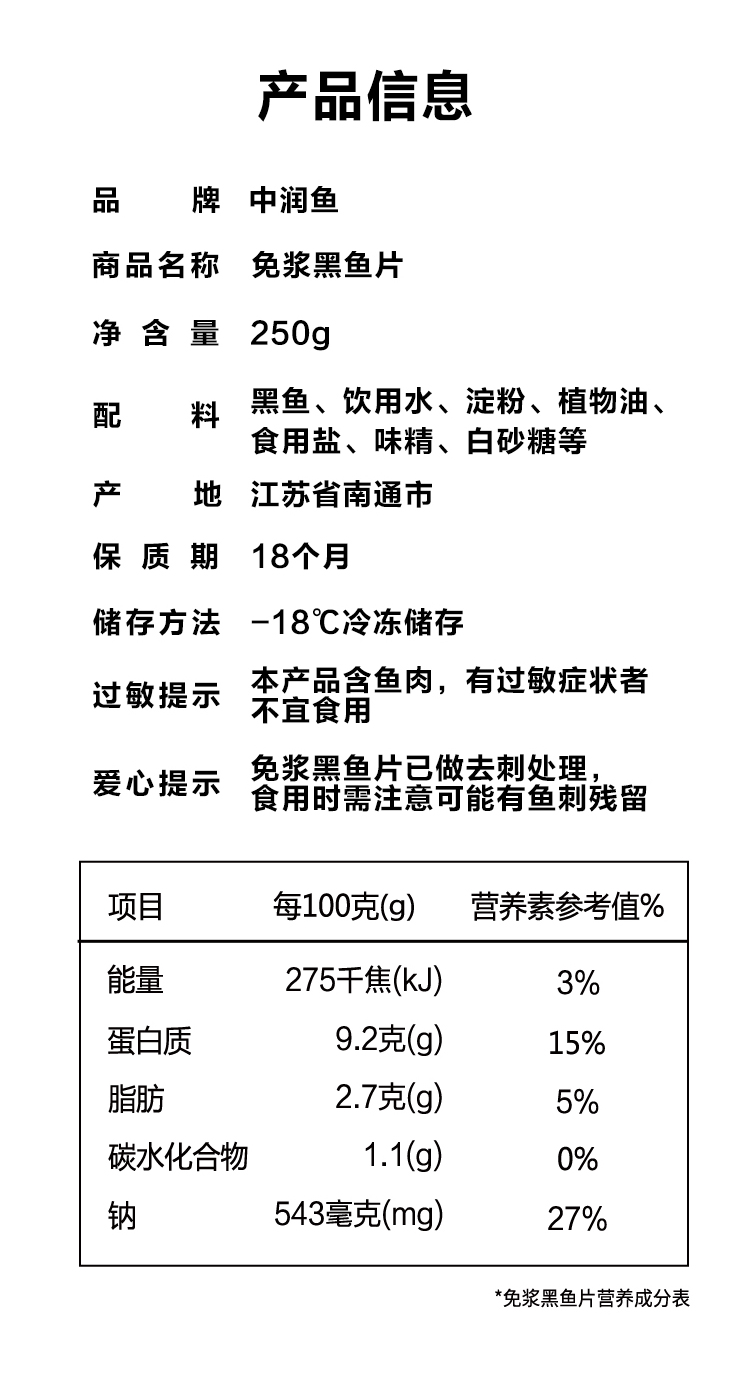 中润鱼 黑鱼片250g/包 共6包