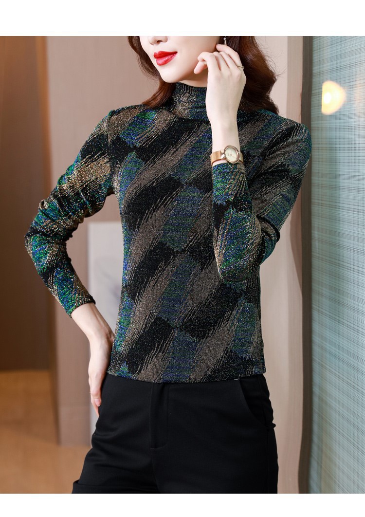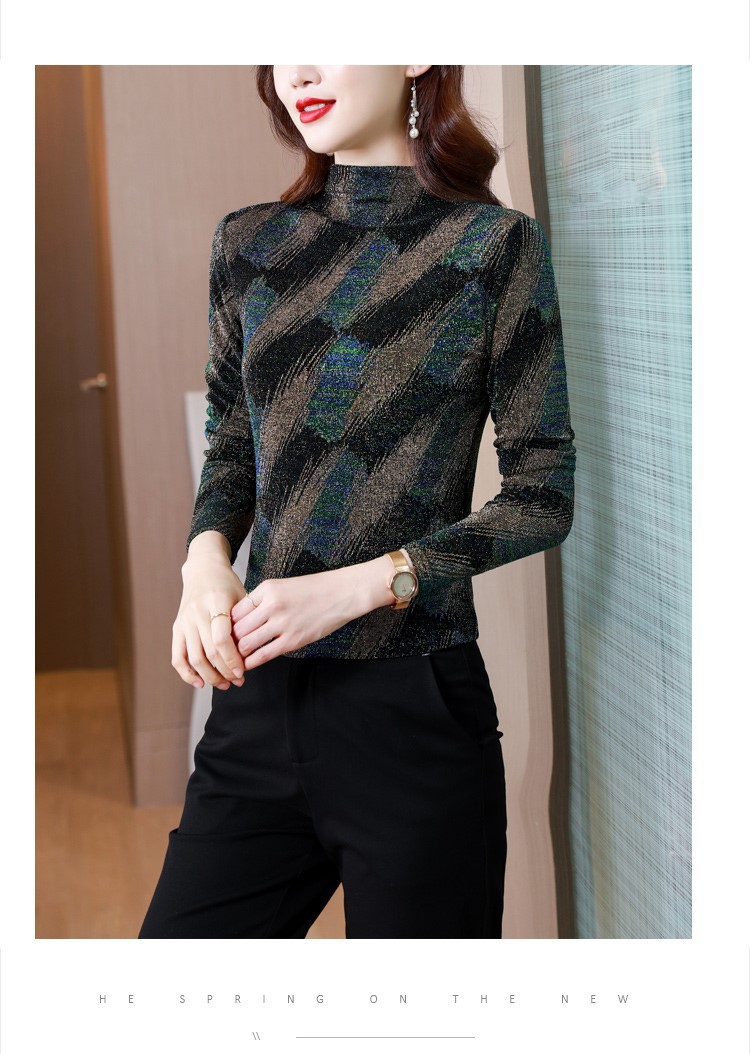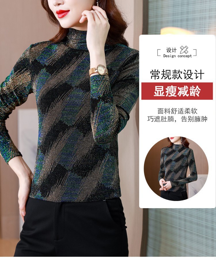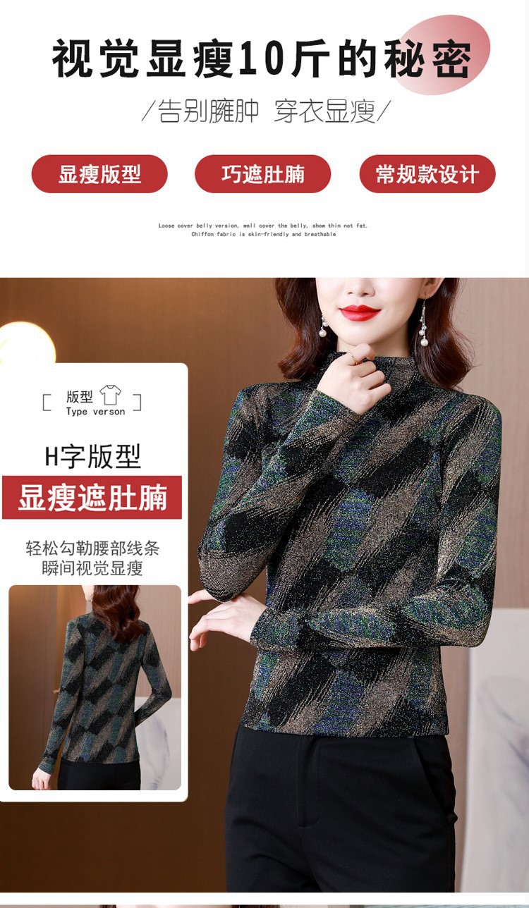 时尚洋气,长袖高领网纱t恤女烫金定位花打底衫上衣KQL-A55F0902