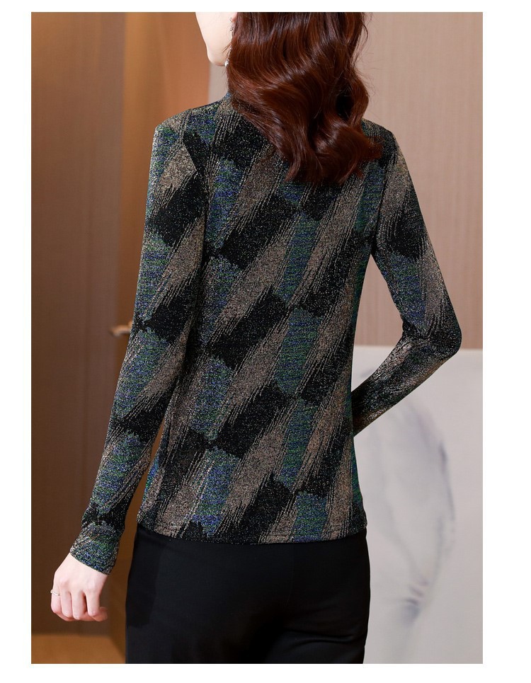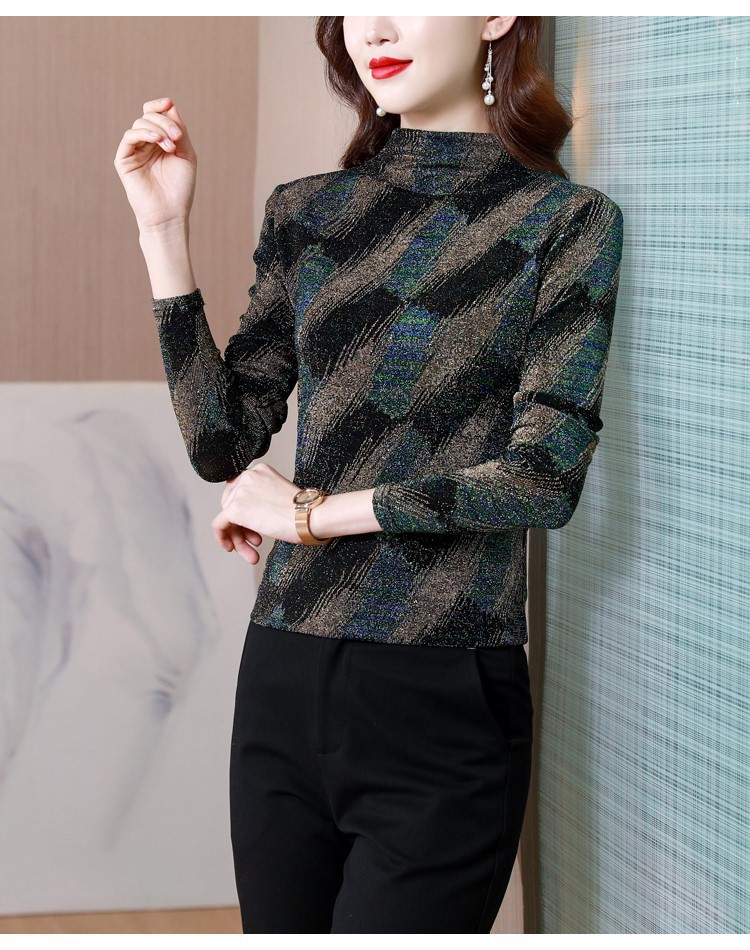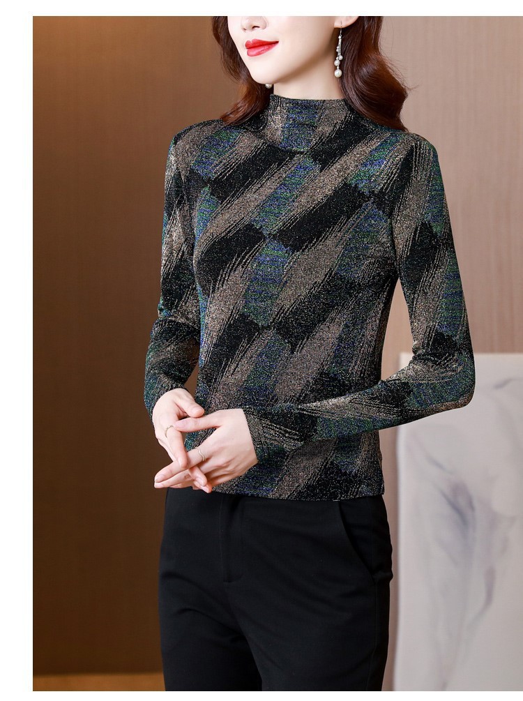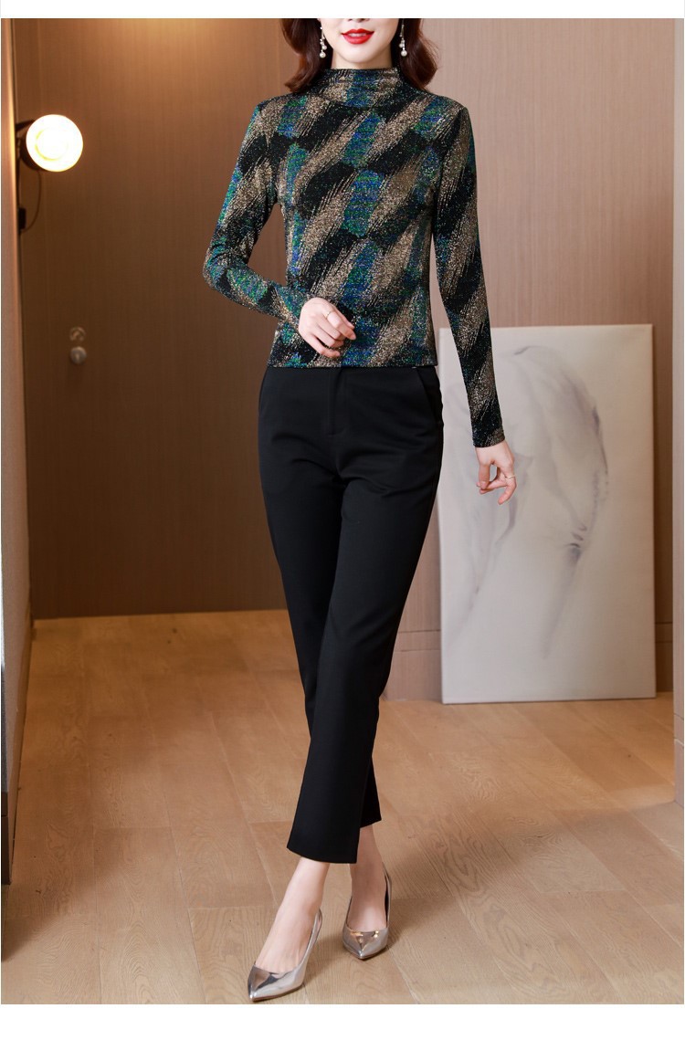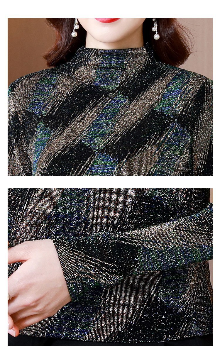 时尚洋气,长袖高领网纱t恤女烫金定位花打底衫上衣KQL-A55F0902