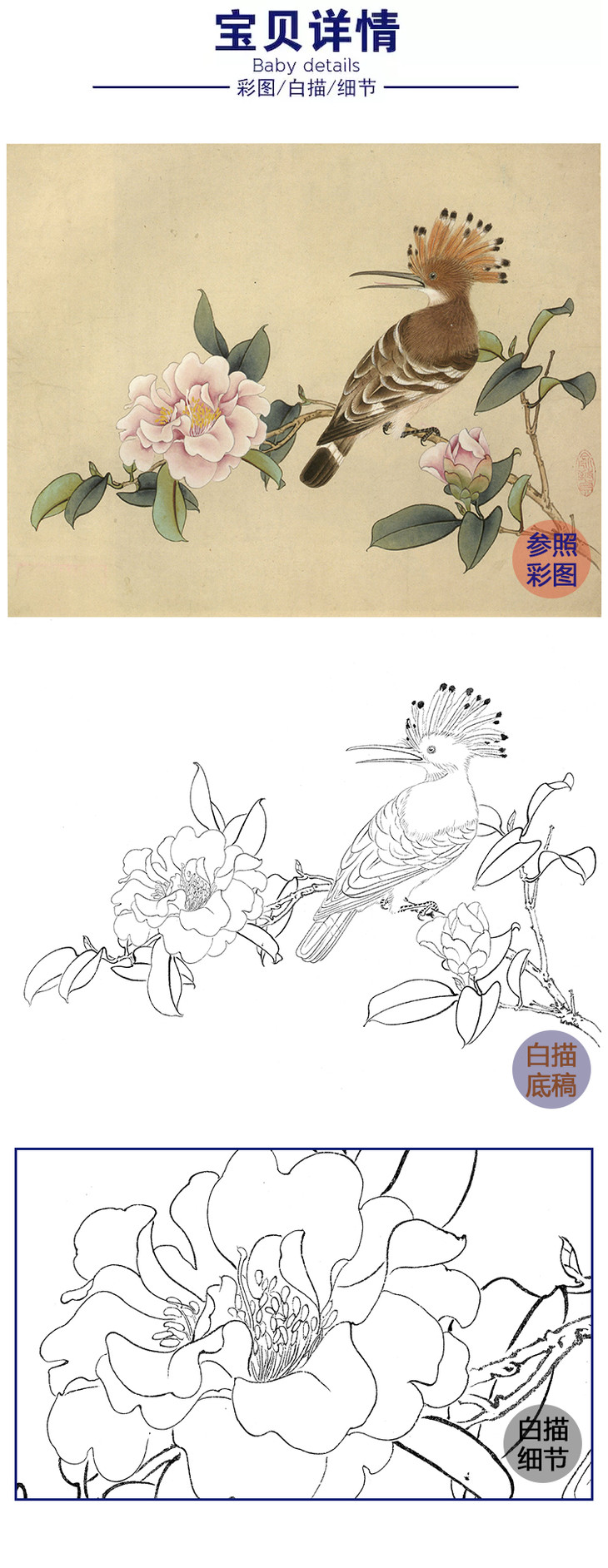 俞致贞工笔花鸟白描底稿-啄木鸟山茶花《戴胜山茶》-斗方小品册页-JV18