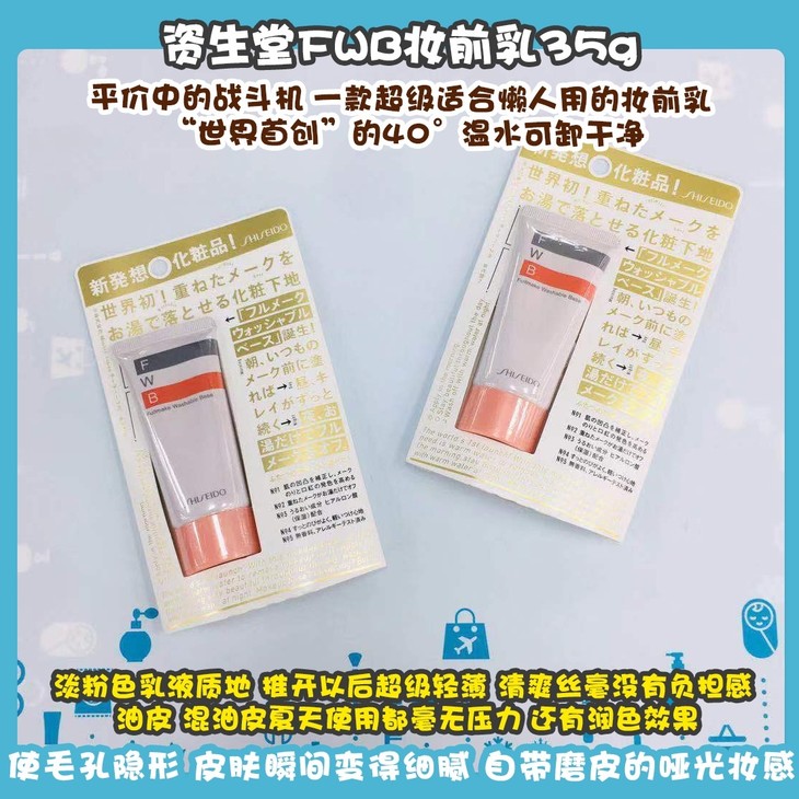 資生堂FWB妝前乳35g👍平价中的战斗机🚁,一款超级适合懒人用的妆前乳,“世界首创”的40°温水可卸干净,无需卸妆产品☘,淡粉色乳液质地,推开以后超级轻薄,清爽💫,丝毫没有负担感。油皮、混油皮夏天使用都毫无压力🍃。还有润色效果,但不能代替粉底液的遮瑕度💭,但能使毛孔隐形,皮肤瞬间变得细腻,👉自带磨皮的哑光妆感,没有添加香精,成分温和安全。