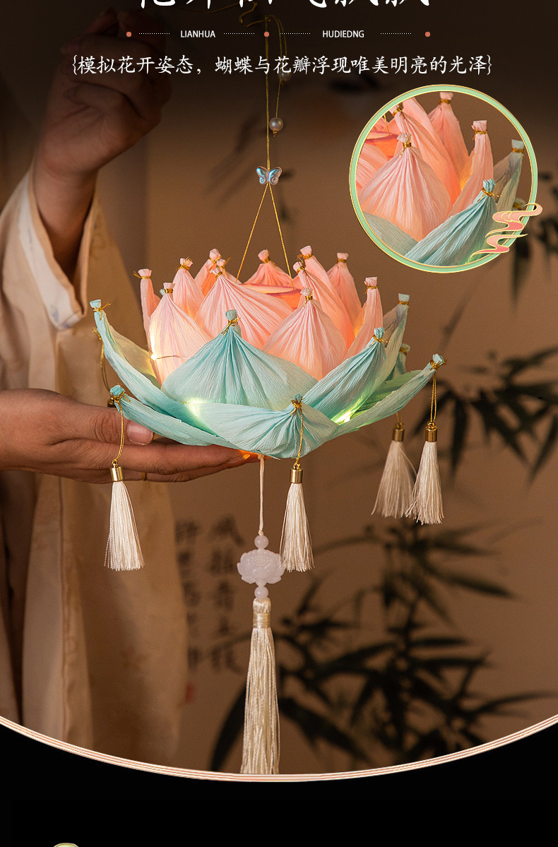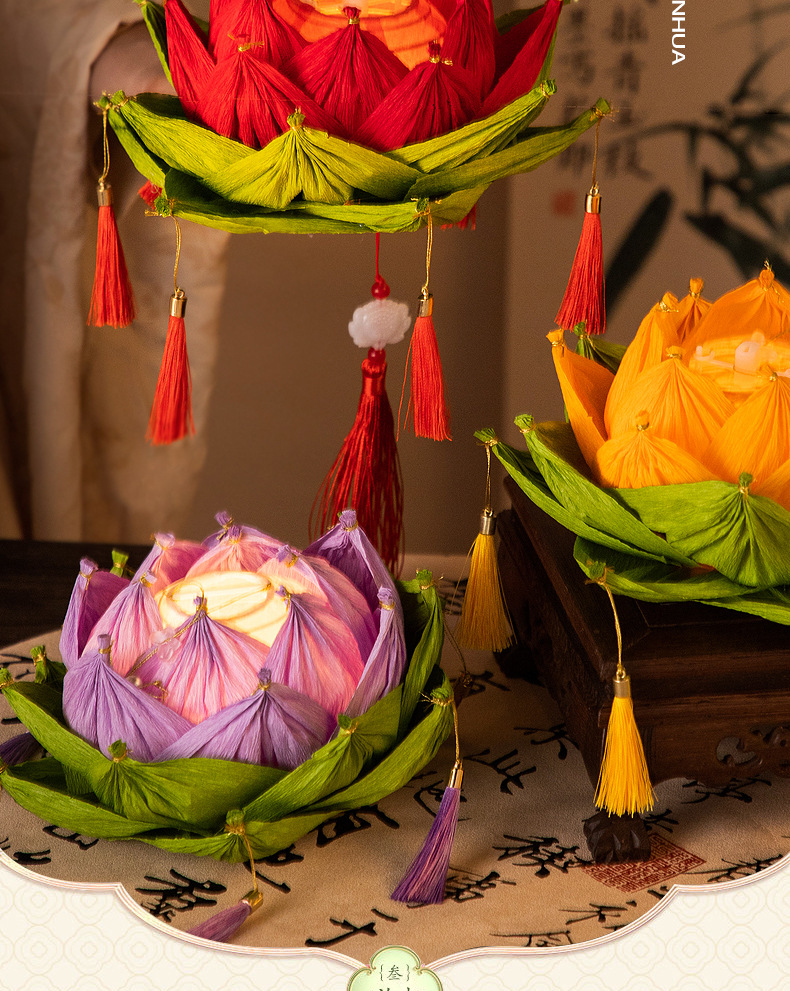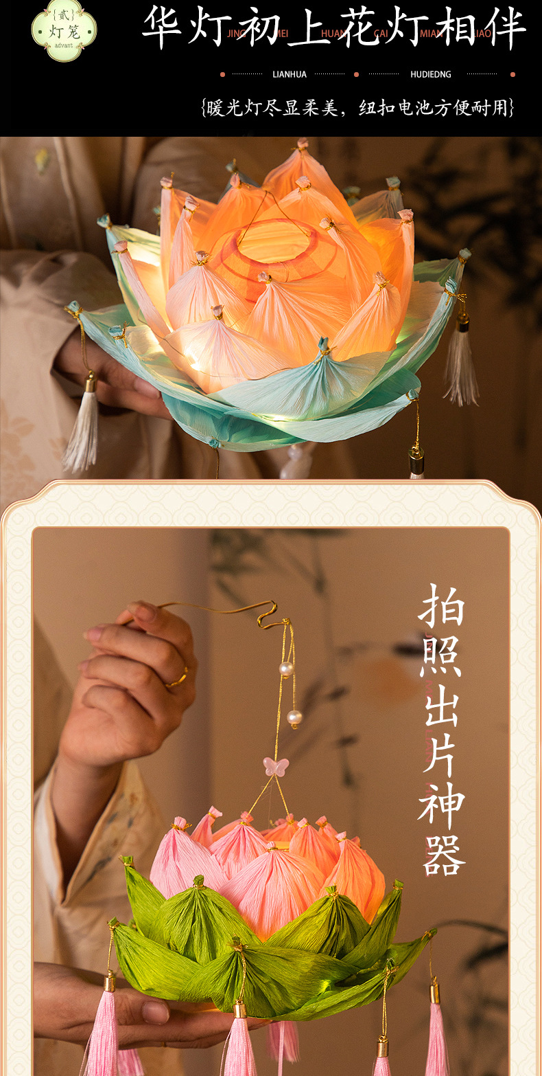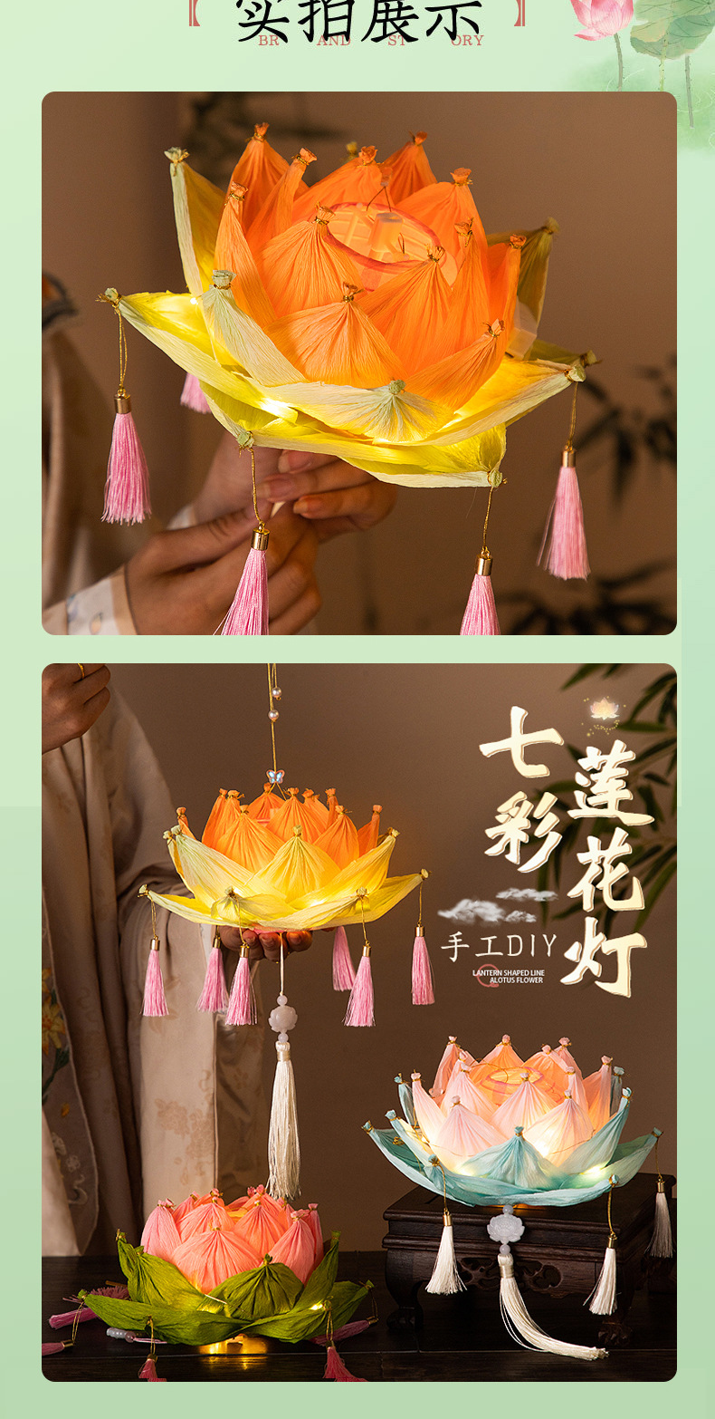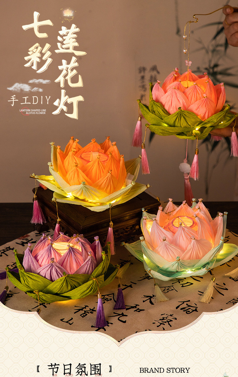【中秋灯笼!七彩莲花灯~】中秋节莲花灯 荷花灯diy材料包 手工提发光 古风纸灯笼 宫灯小礼物品-QQ