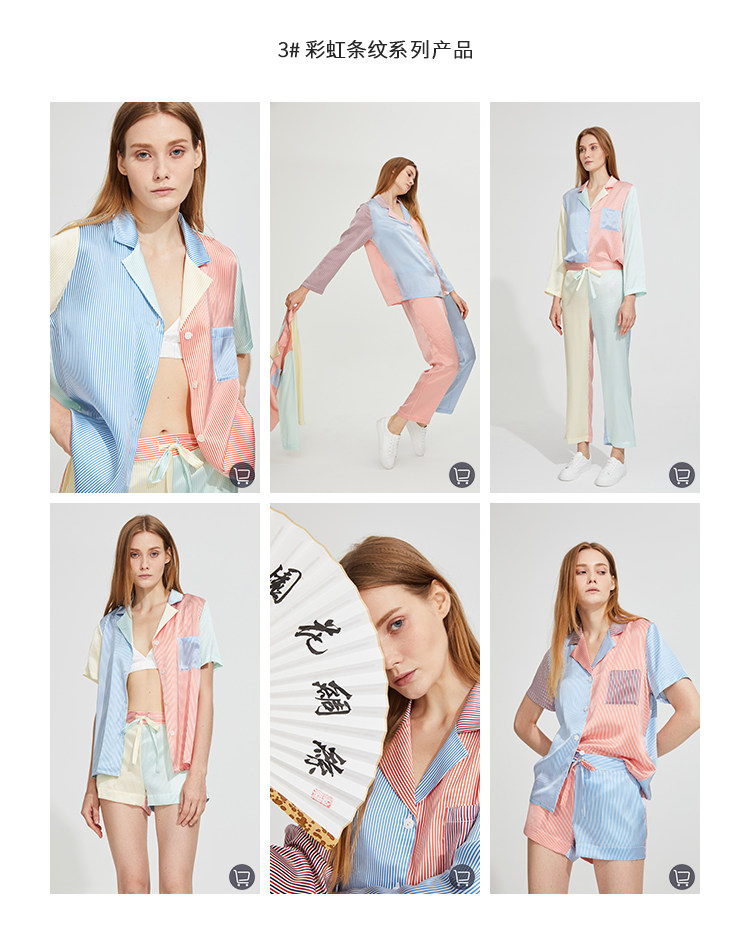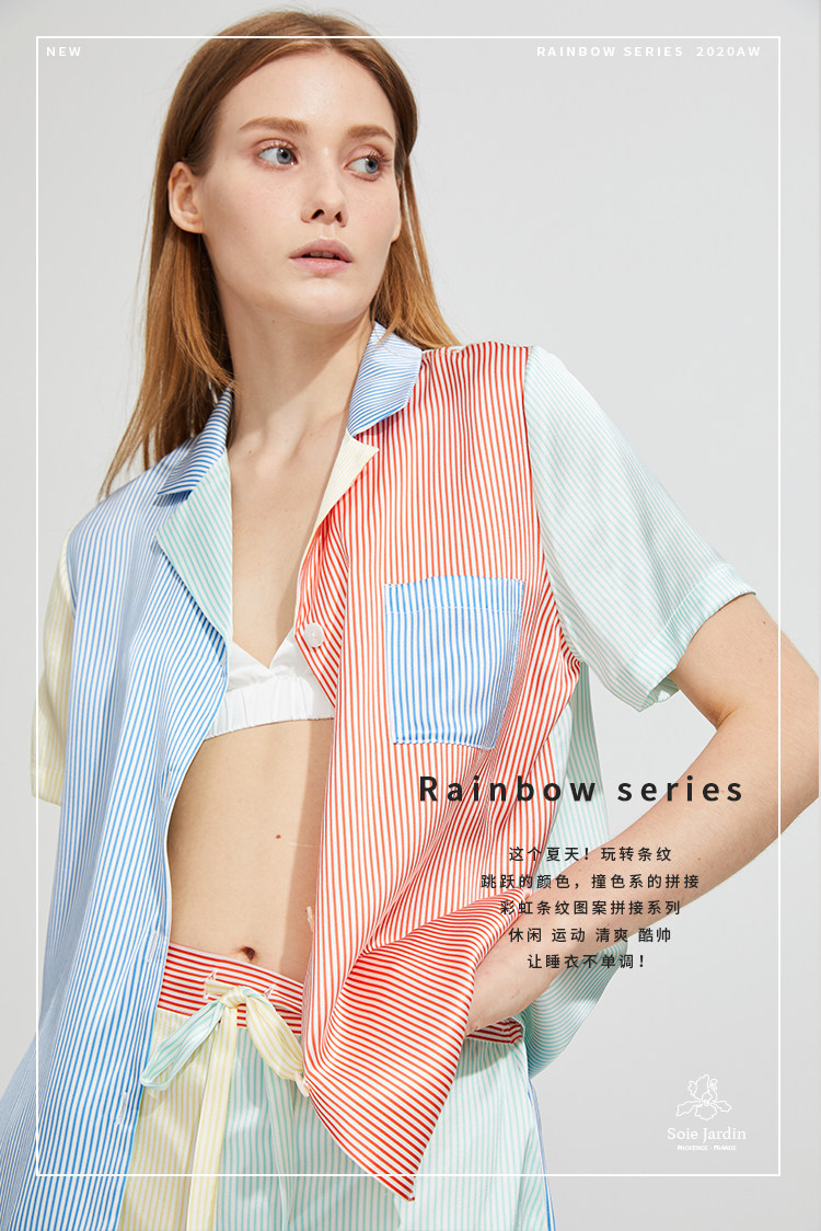 南法SJD/soie jardin3#彩色条纹桑蚕丝睡衣两件套短袖短裤印花拼接家居服 S302TD98