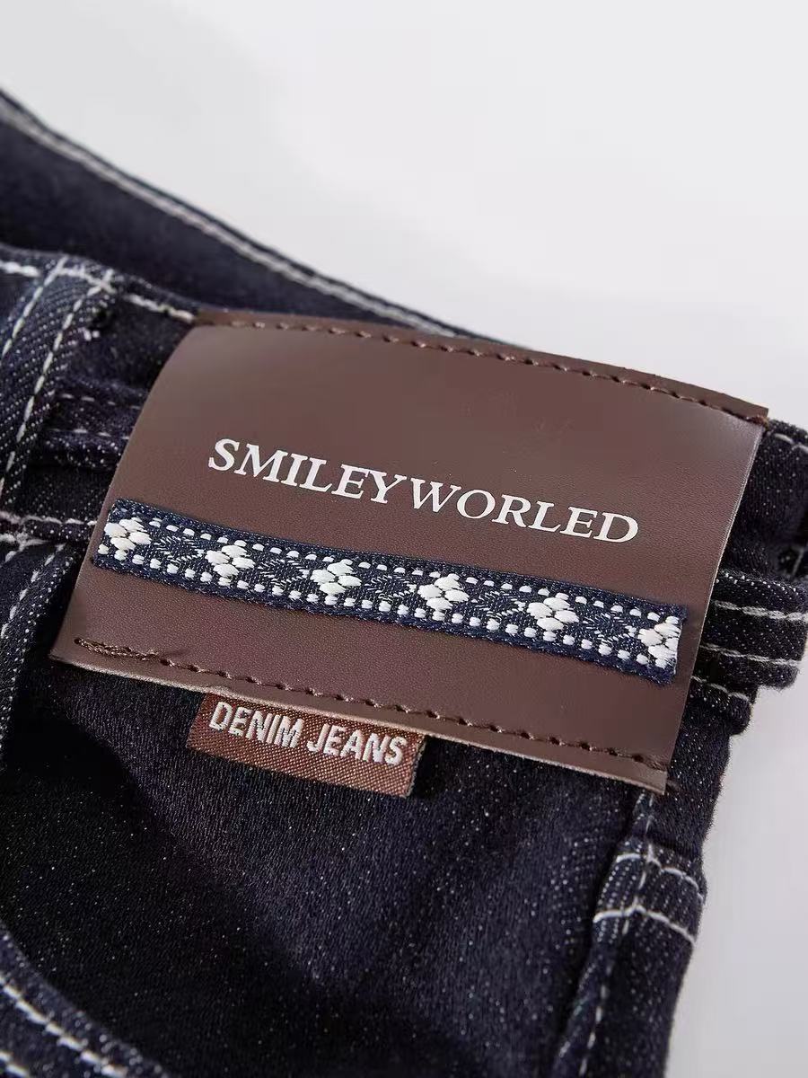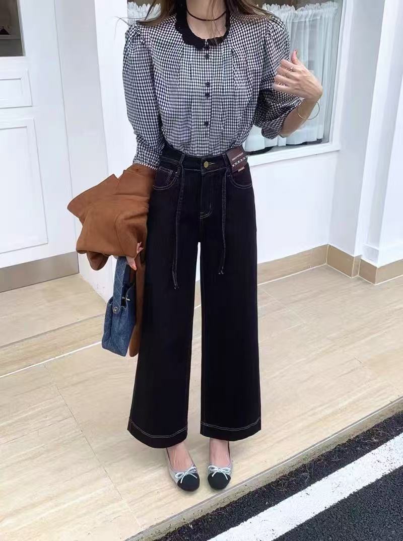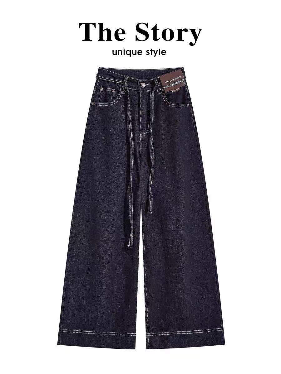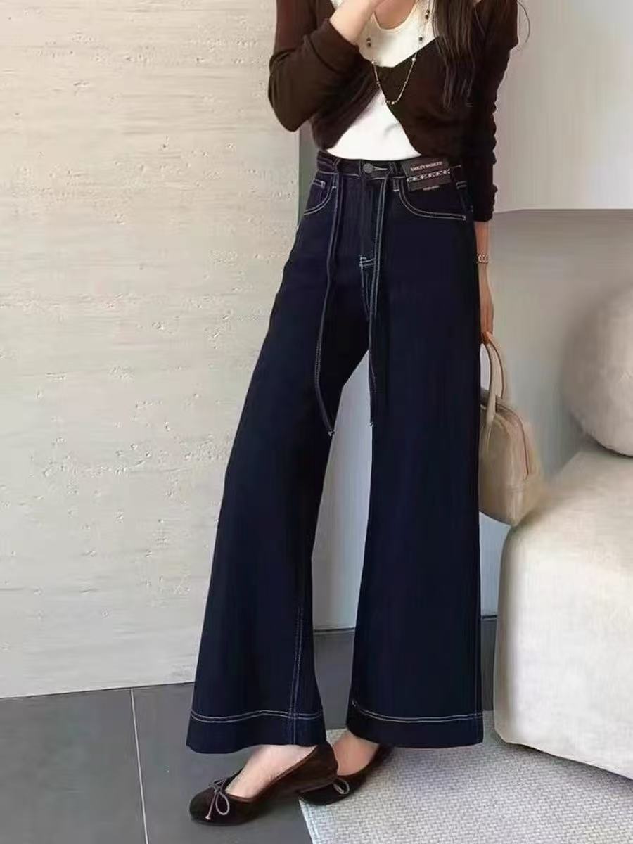 【牛仔裤】(小个子款)7758高弹力丹宁蓝腰绳牛仔裤直筒裤-喜出