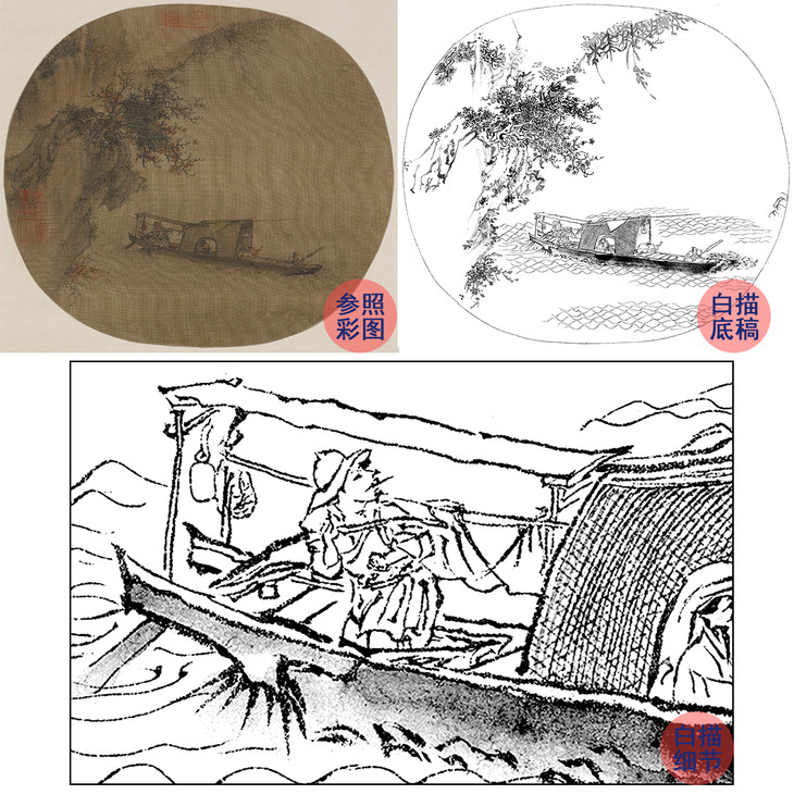 宋画山水人物小品白描底稿-王诜-《东坡赤壁图》-多种白描尺寸可选 -GS01