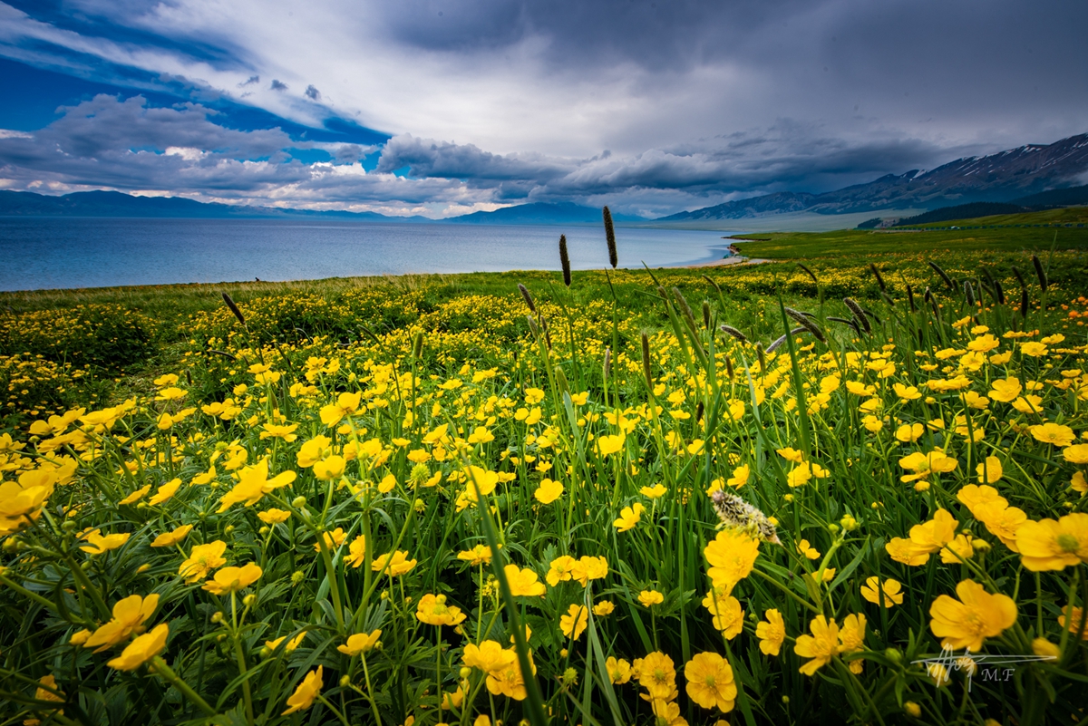 洁白的雪山、湛蓝的湖水、艳丽的鲜花