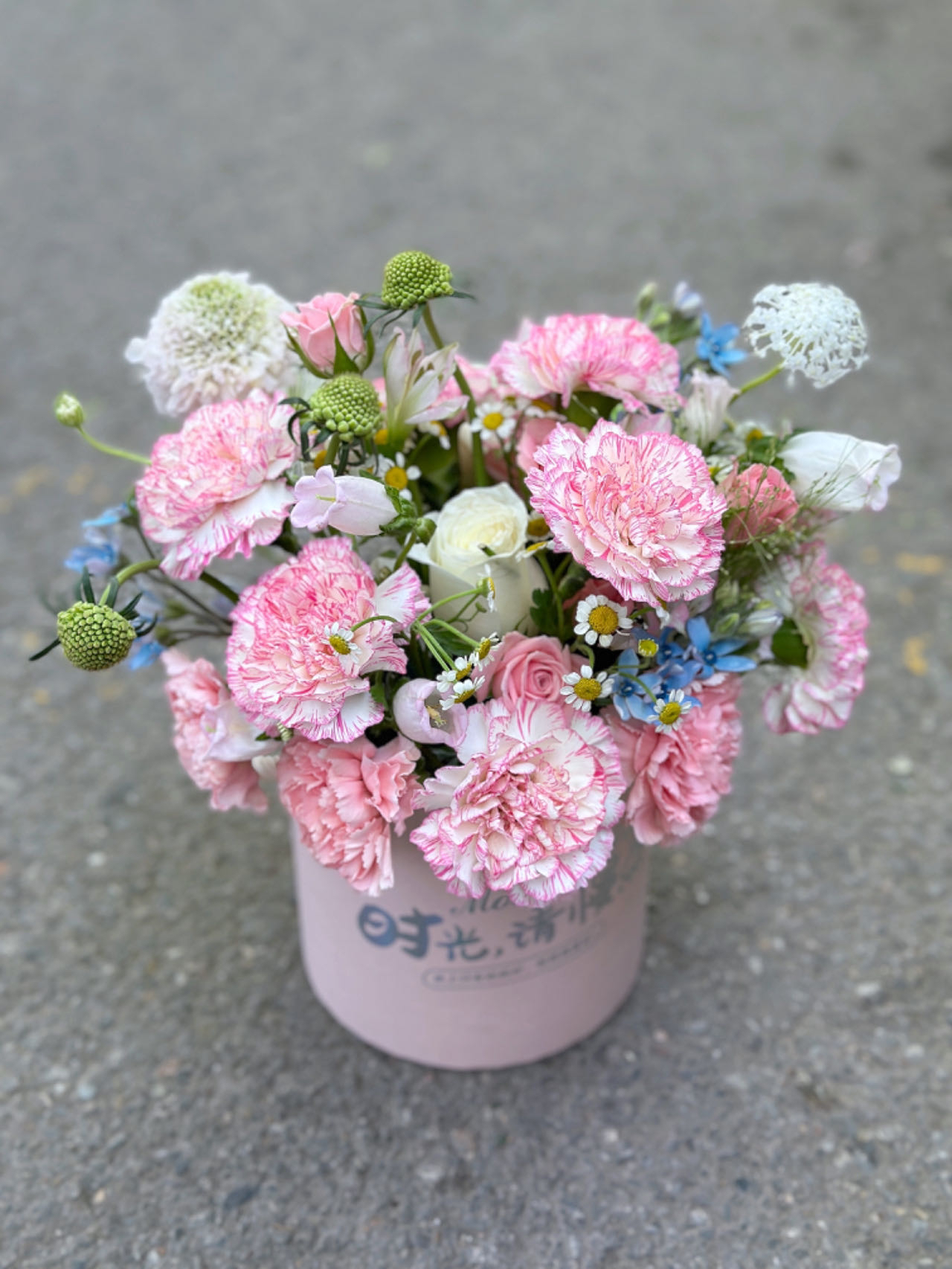 香槟玫瑰加蓝星花 插花泥花束