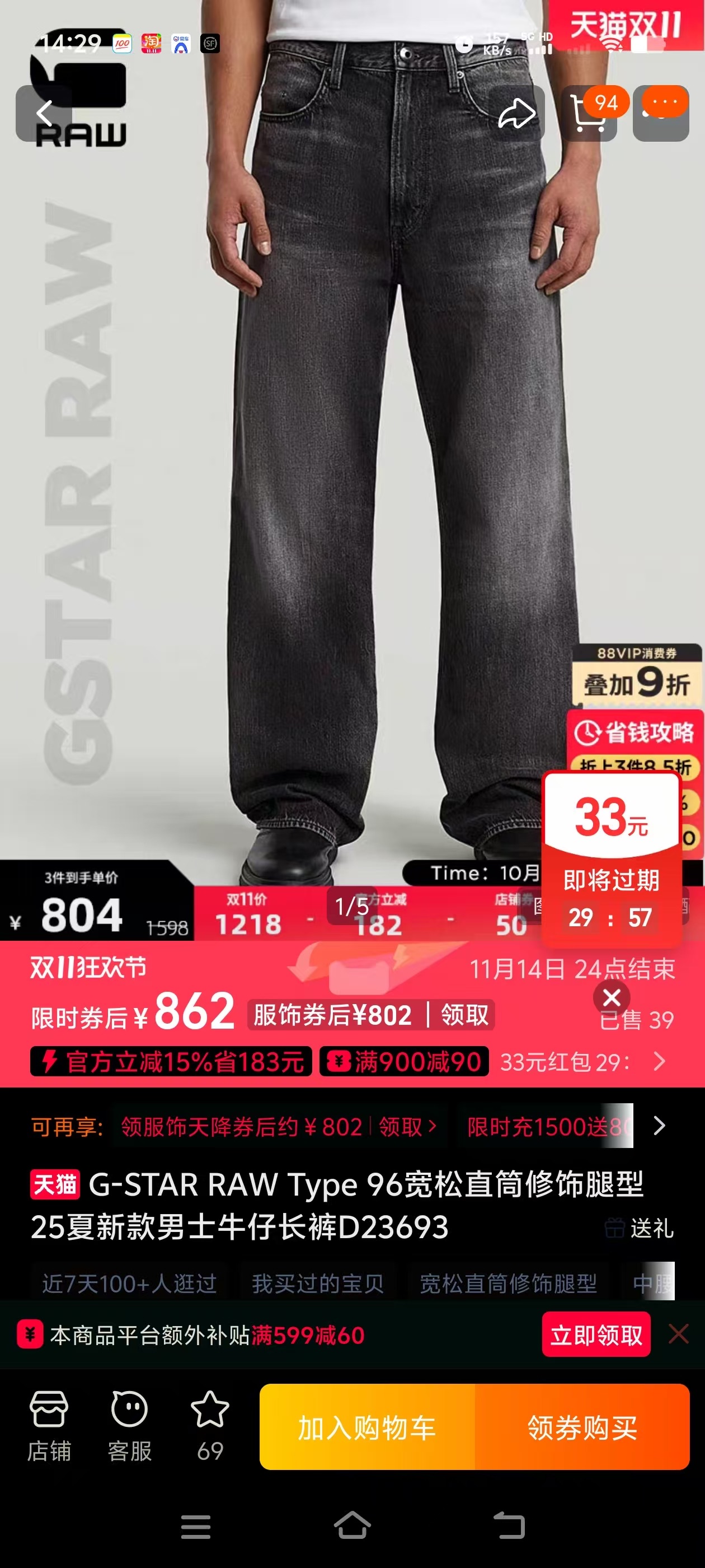 G-STAR RAW Type 96宽松直筒修饰腿型25夏新款男士牛仔长裤D23693