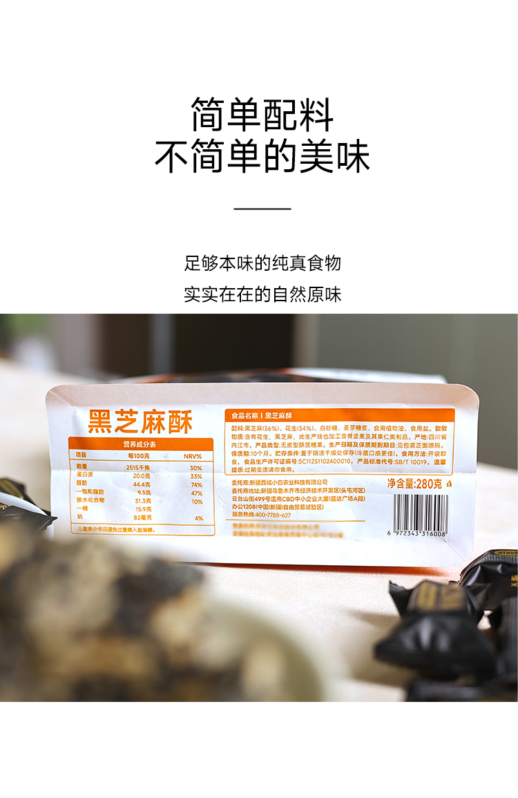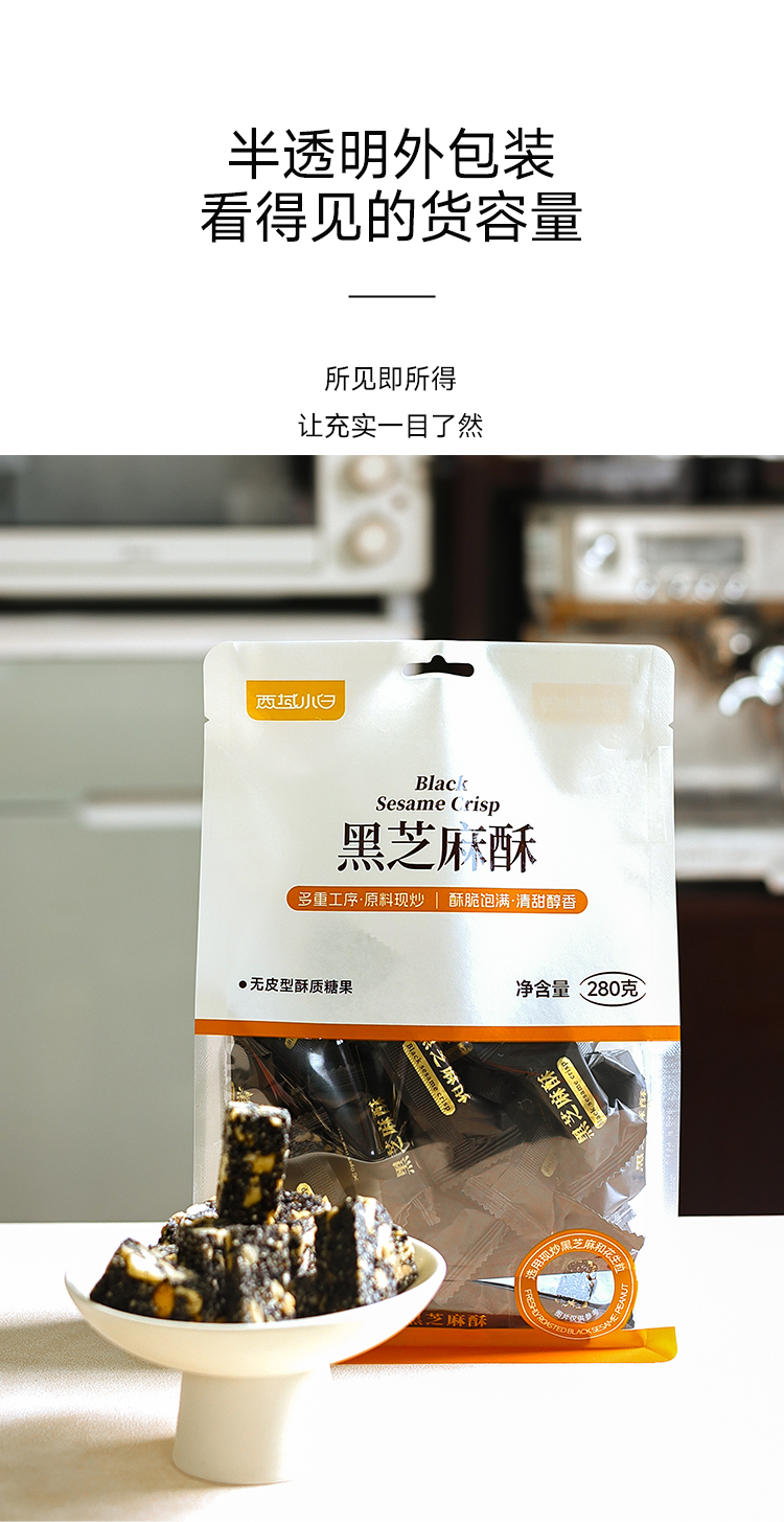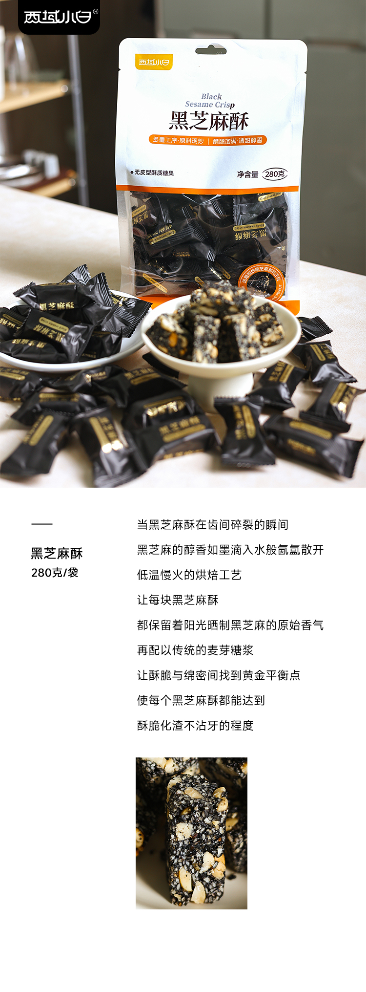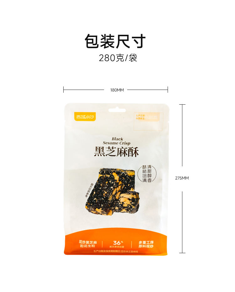 【产品名称】:黑芝麻酥【规格】:280g*2袋【产地】:四川省内江市【发货快递】:圆通/中通/韵达,随机发货不接受指定快递【不发货区域】:青海、宁夏、新疆、西藏、港澳台