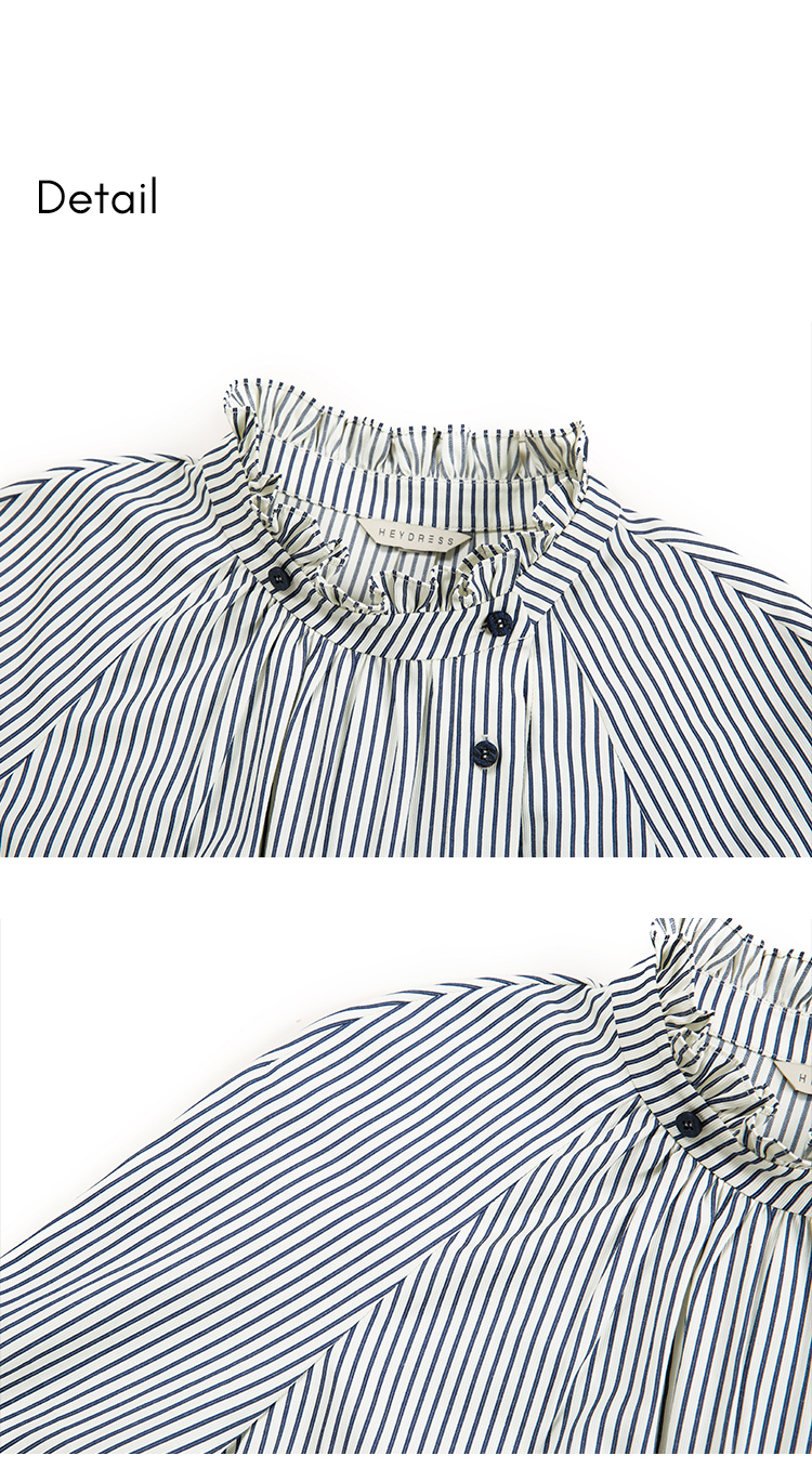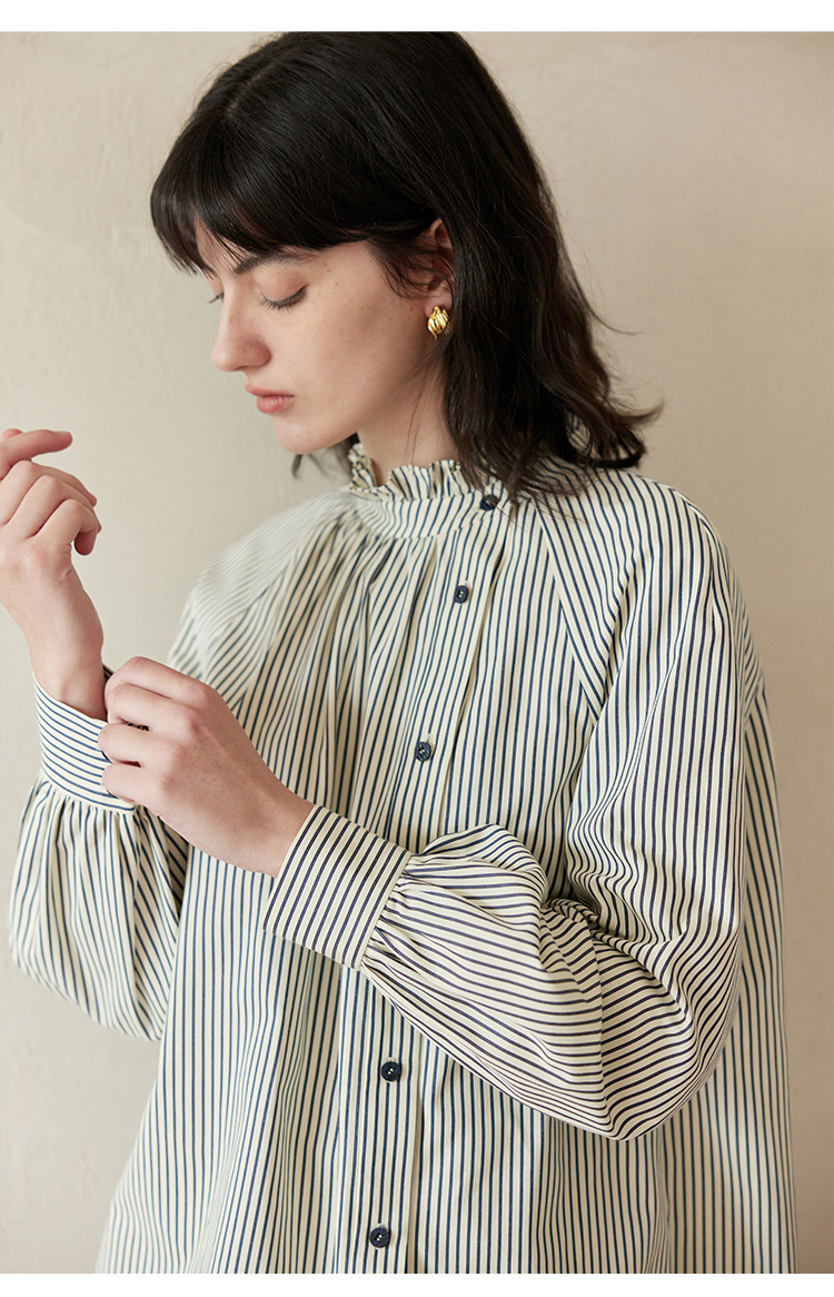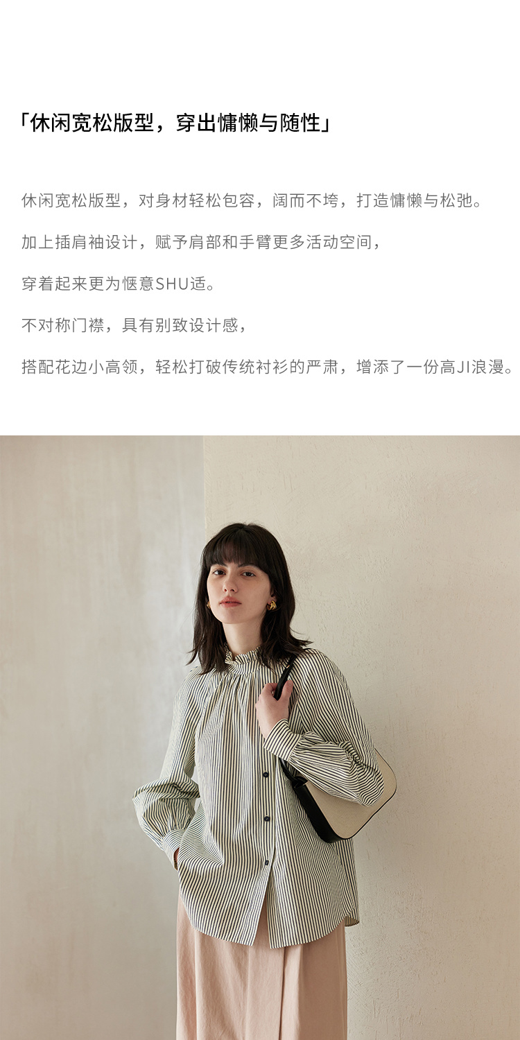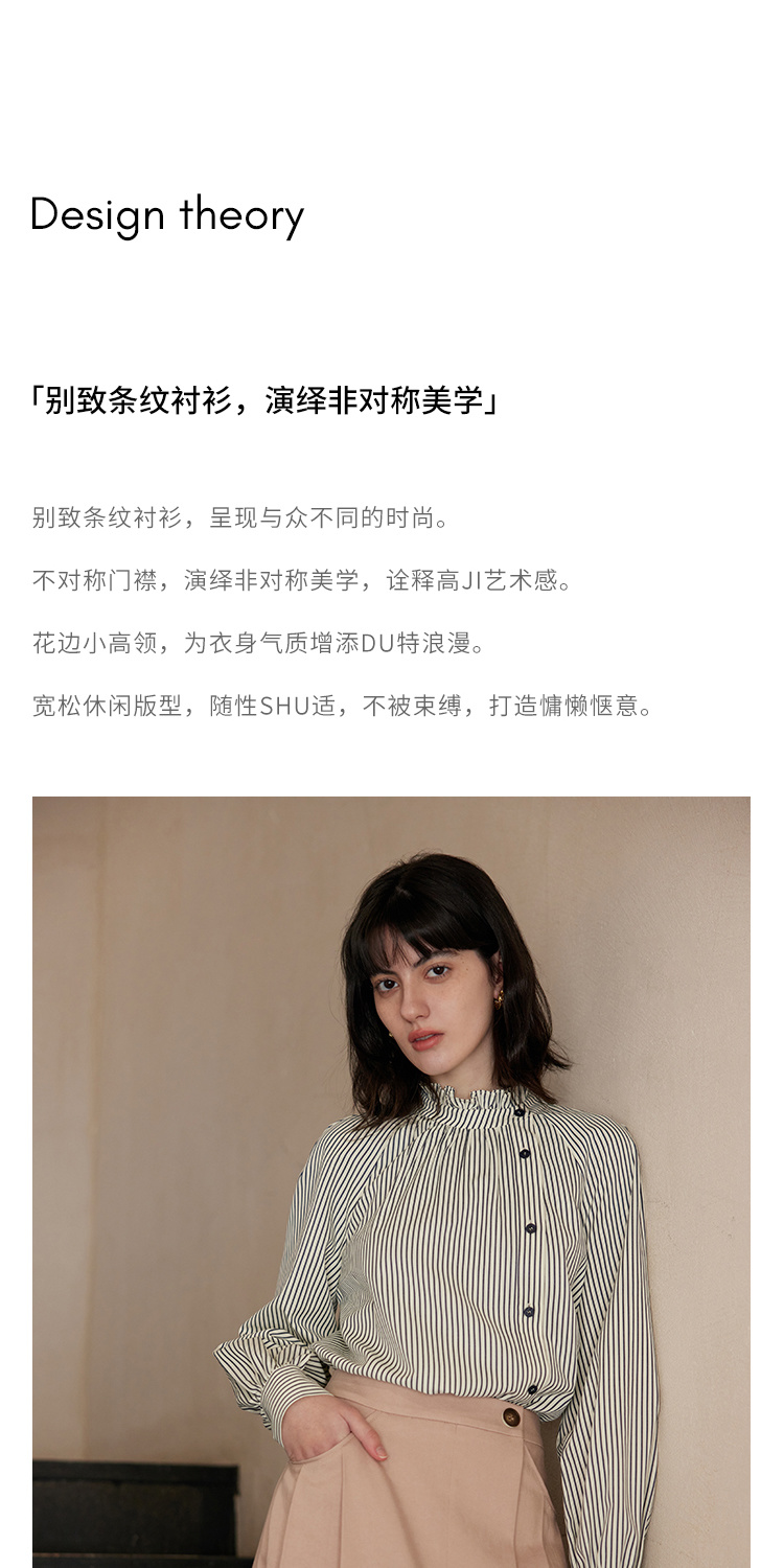 HeyDress法式花边领条纹衬衫女春秋宽松休闲侧门襟衬衣复古感上衣