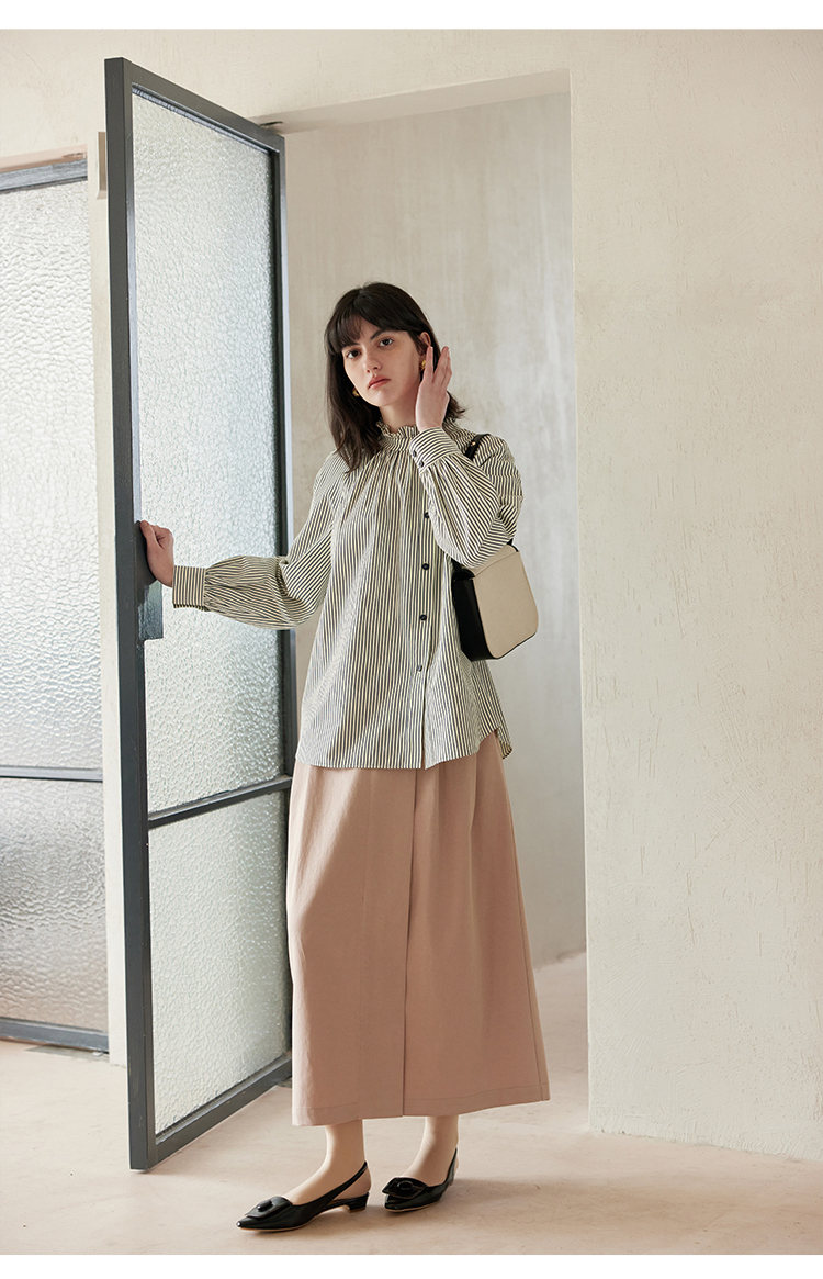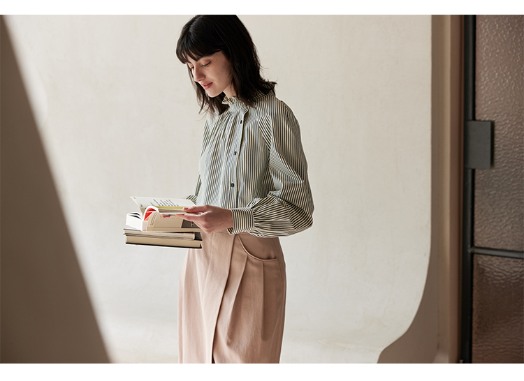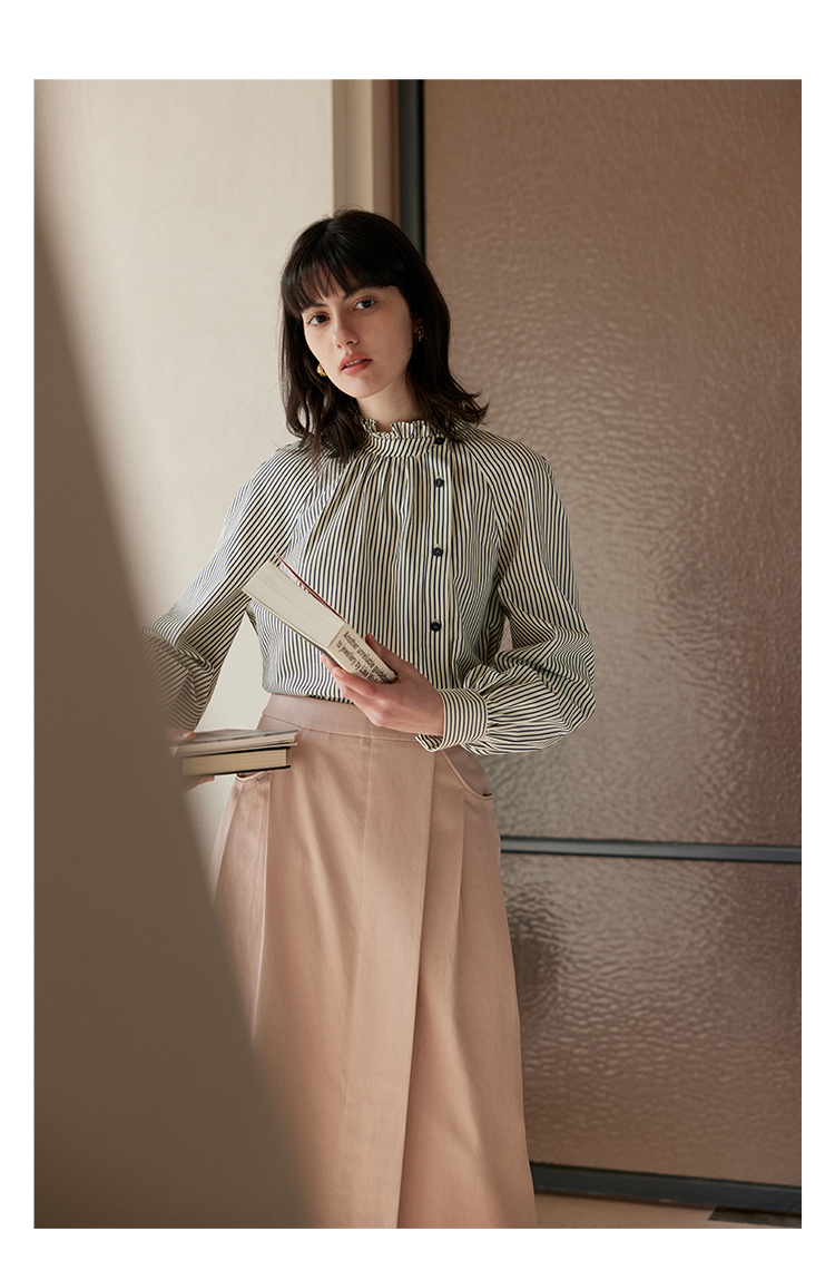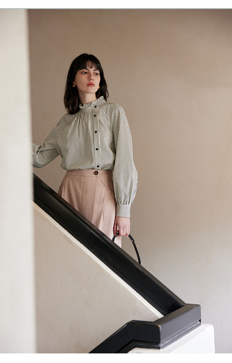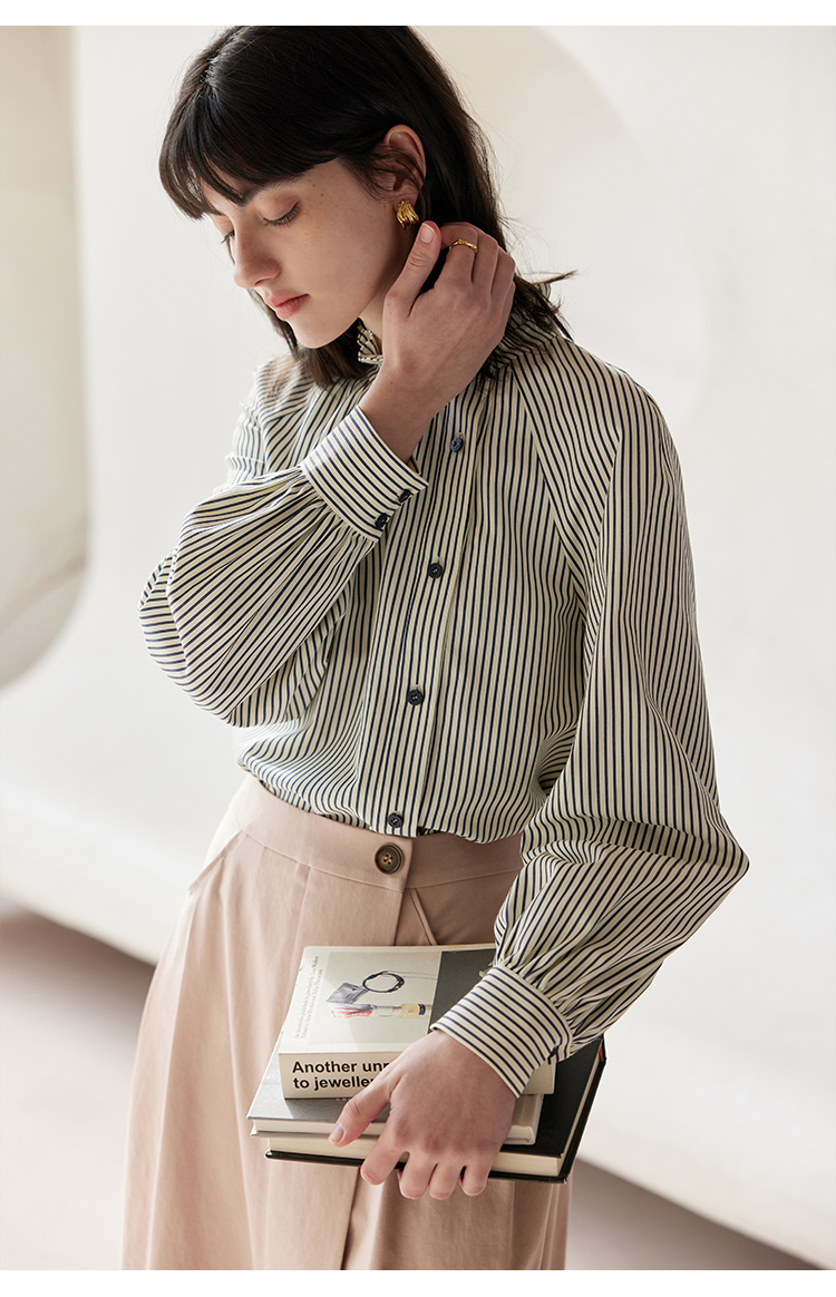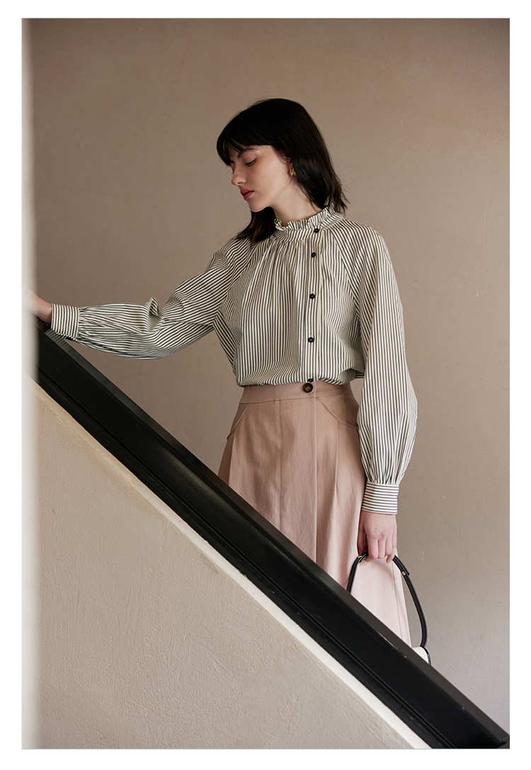 HeyDress法式花边领条纹衬衫女春秋宽松休闲侧门襟衬衣复古感上衣
