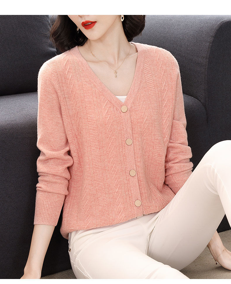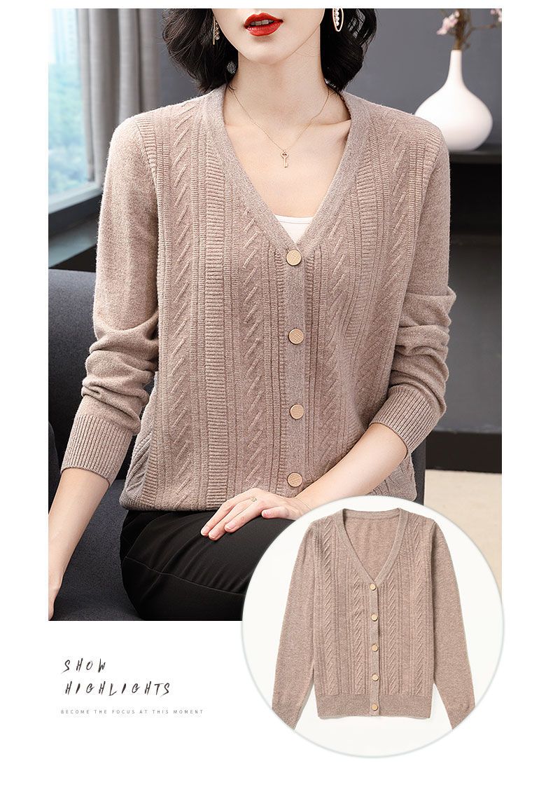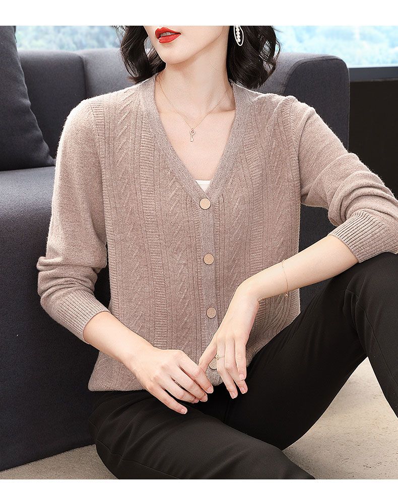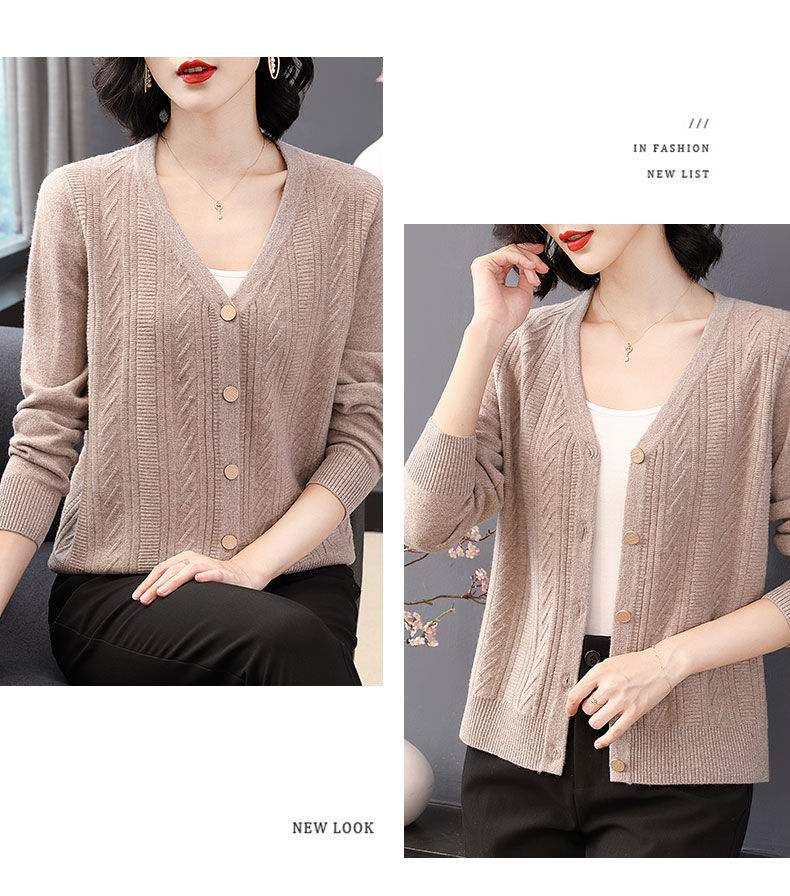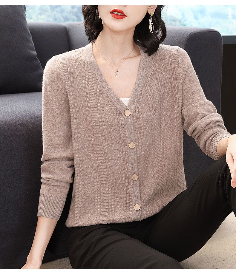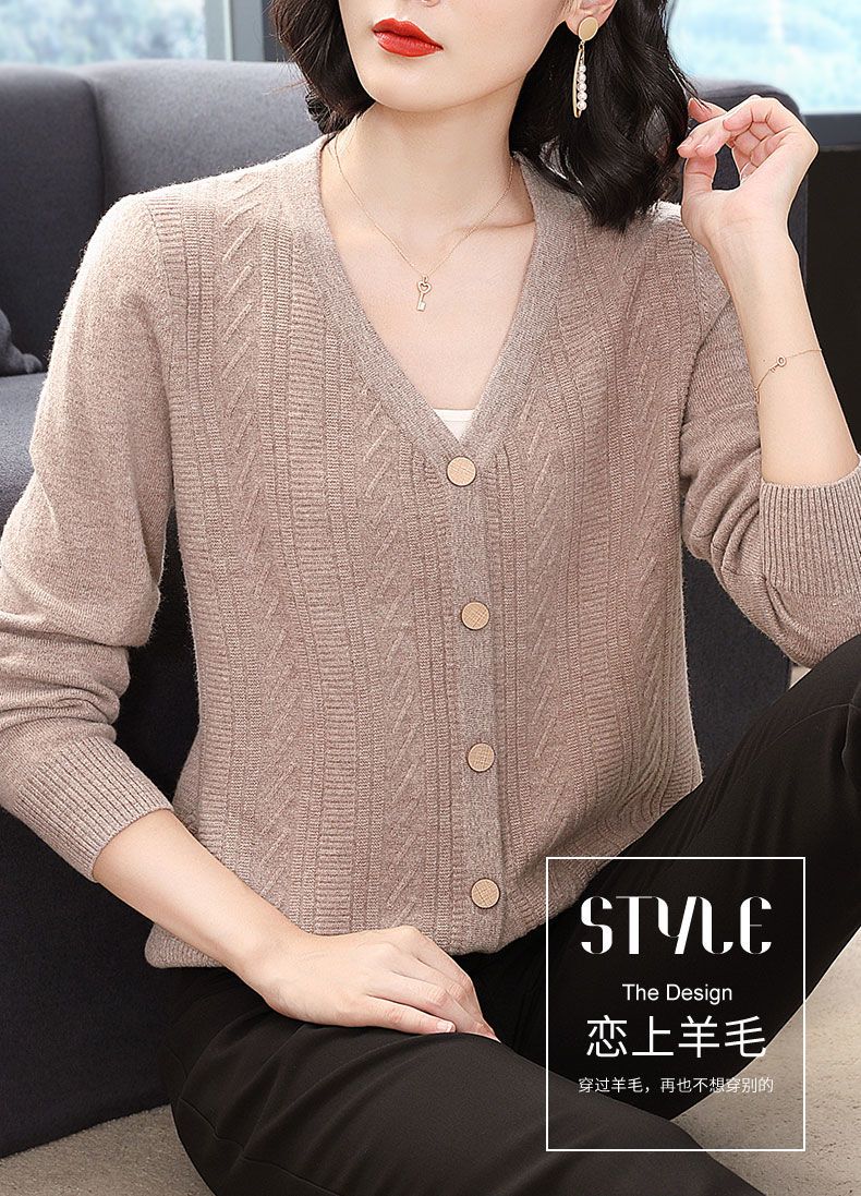 TZW-2024年高档V领羊绒开衫女外搭上衣秋季提花羊毛外套