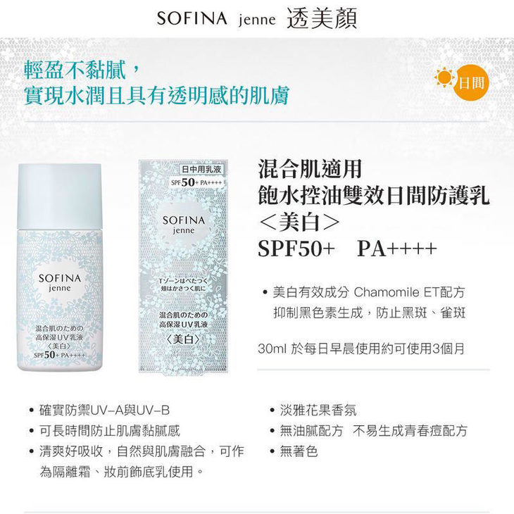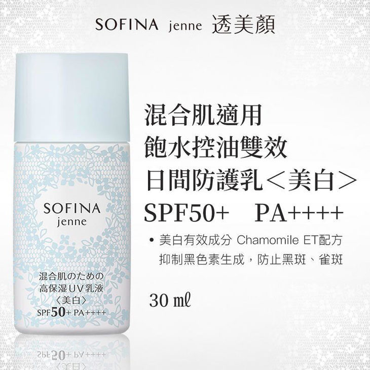 BX👑SOFIN 蘇菲娜🔆日間美白防護乳30ml 🍒 sofina藍蕾絲透美顏防曬乳🍬藍蕾絲屬於物理+化學相結合的防曬霜🍒質地輕盈,不油膩配方,比較不容易起痘痘,清爽不粘膩,防曬必備佳品 🔆有效美白,深層保濕,以水潤打底,綻放白皙透亮感。 ☂️隔離紫外線,有效改善暗沉、抑制黑色素,肌膚水嫩透白! ㊙️早晨化妝水後一瓶就OK! 💦适合肤质:混合皮,油皮,,和白蕾丝相比多了美白功效。
