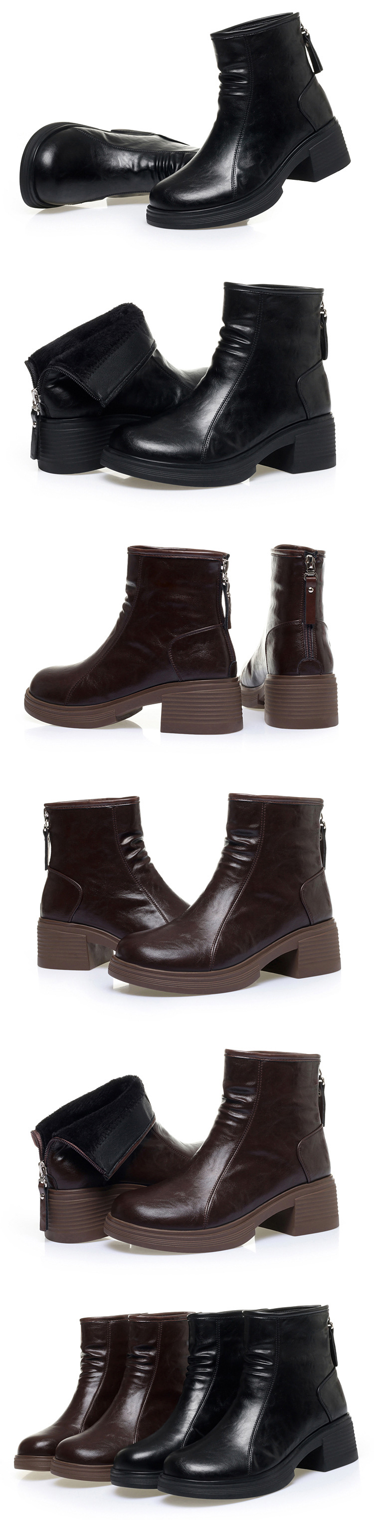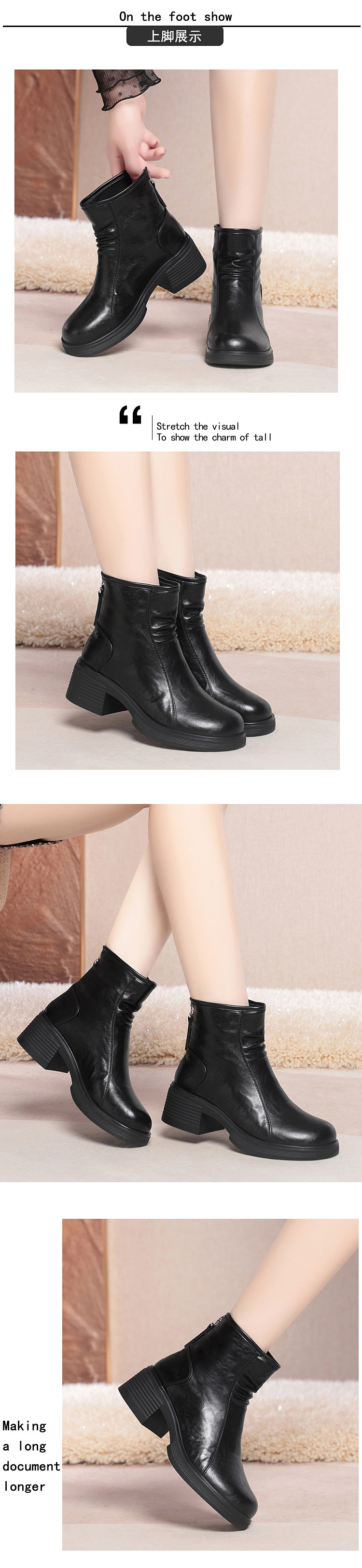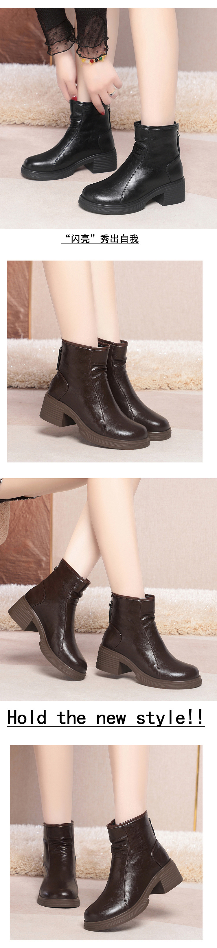 加厚棉靴粗跟圆头防水台后拉链骑士靴