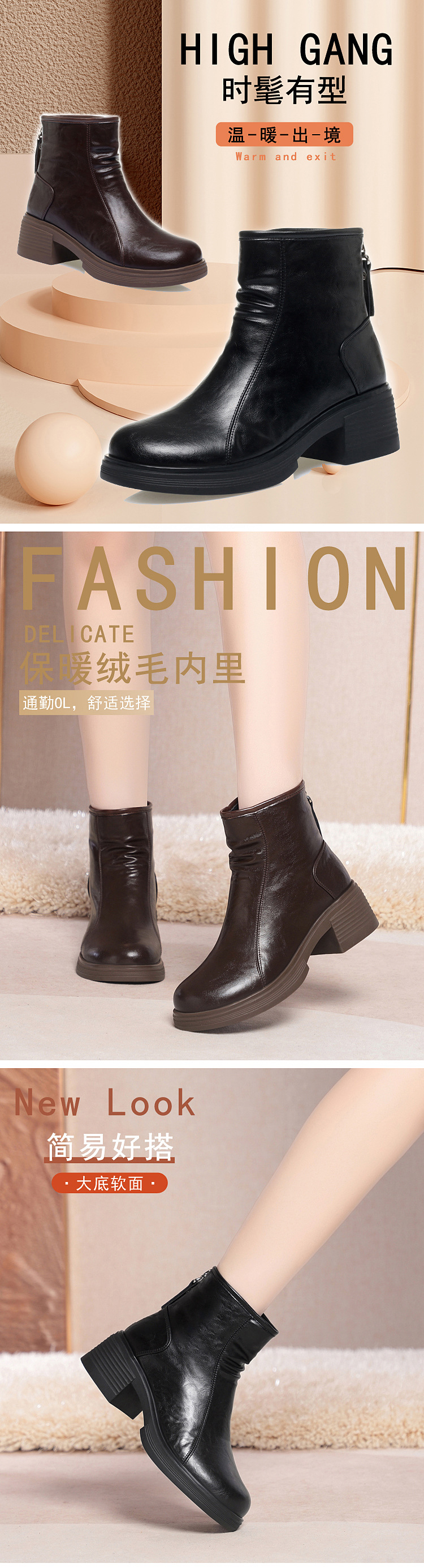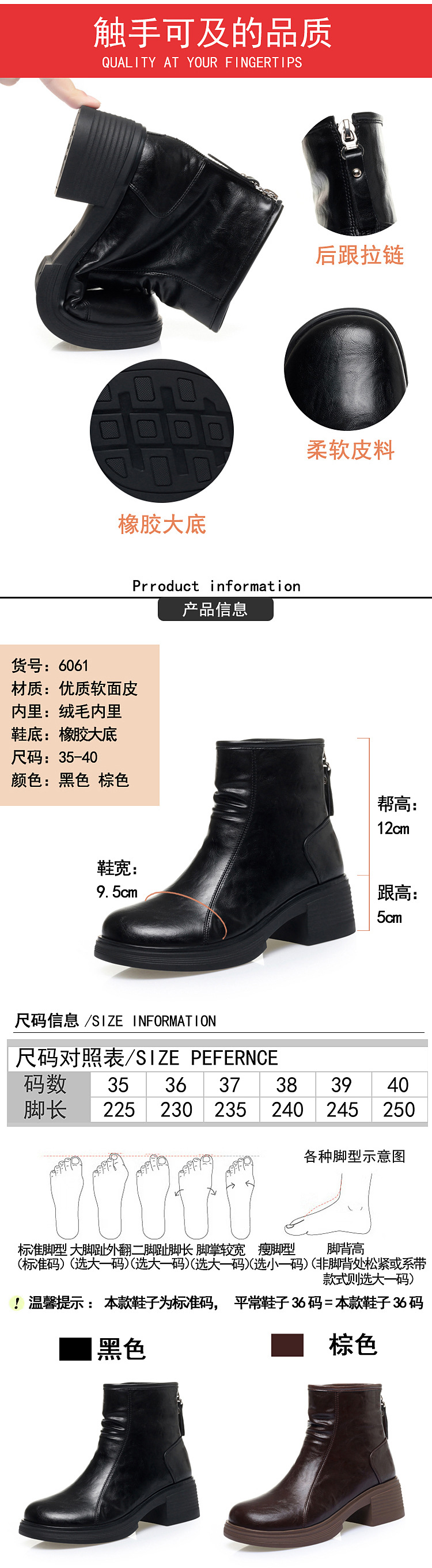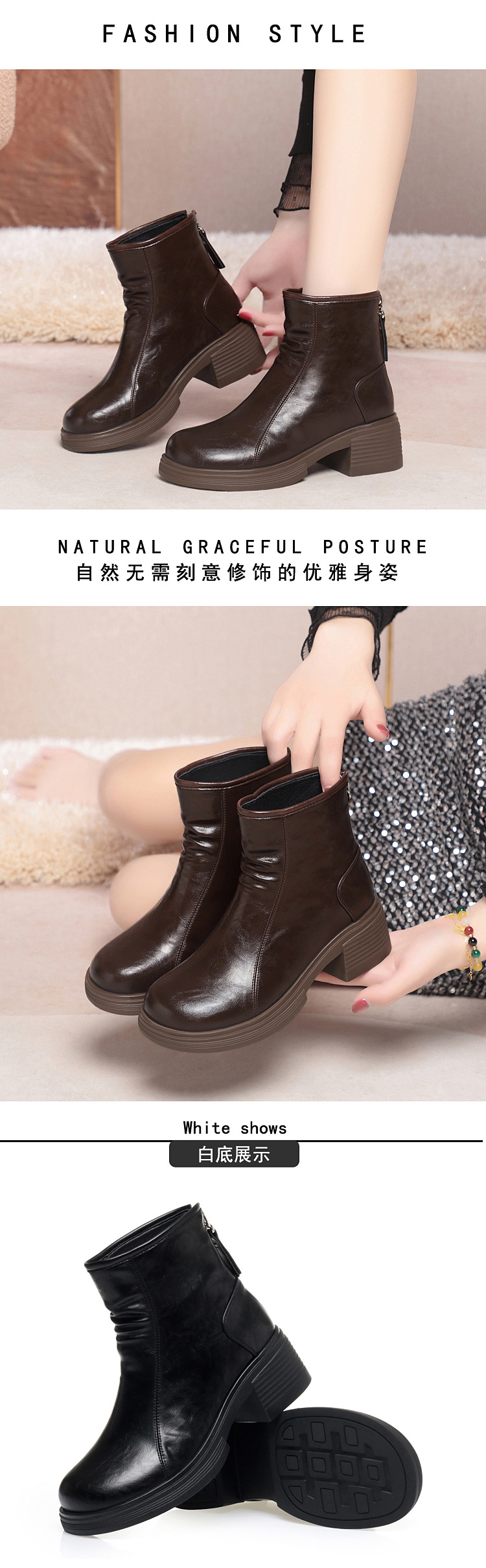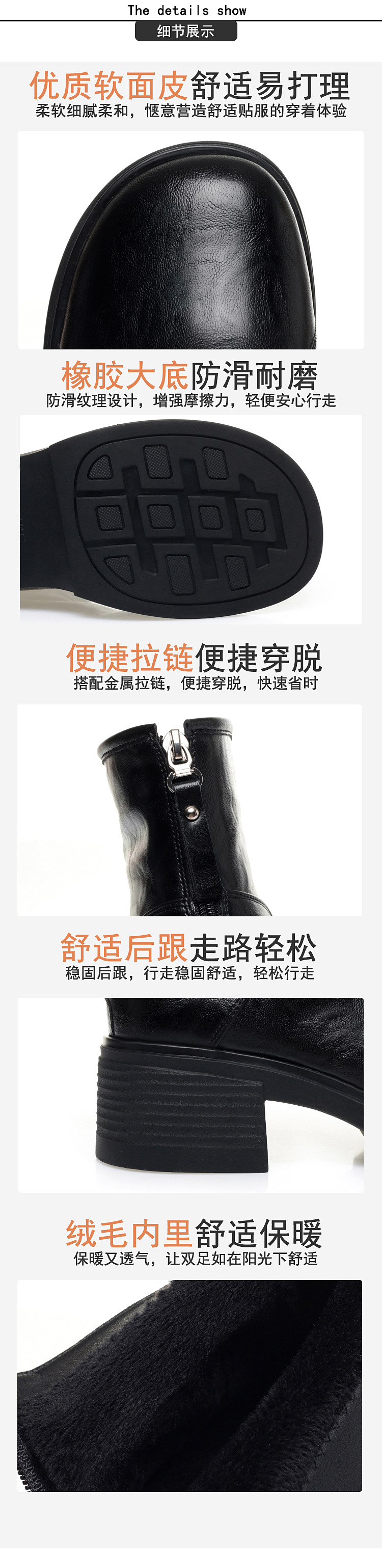 加厚棉靴粗跟圆头防水台后拉链骑士靴