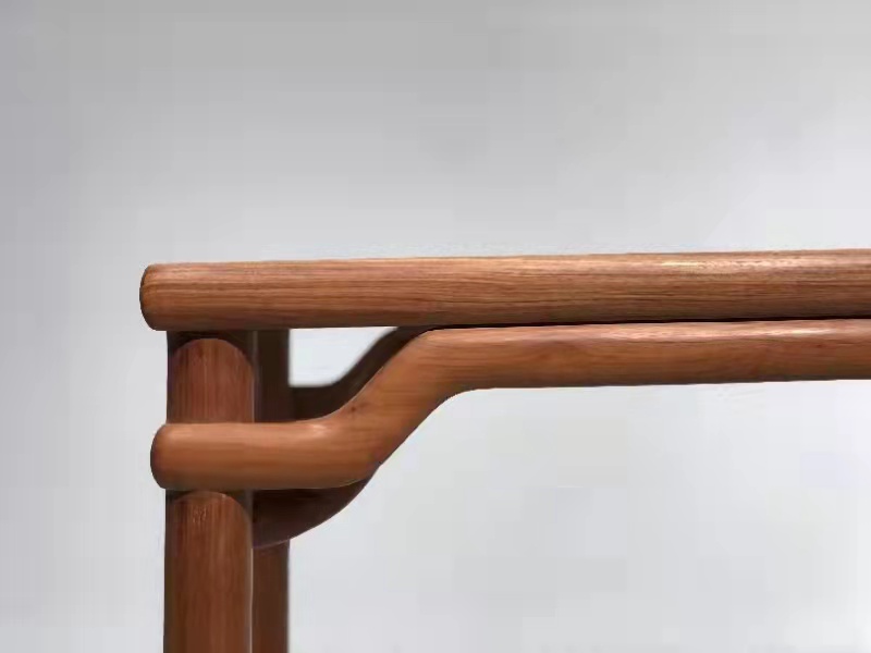 但这种造法使腿足与其他构件的联结过分集中于上端,牢固性和稳定性不足,故又使用霸王枨作为辅助。一头安在腿足内侧的罗锅枨裹腿微下位置,另一头安于面下厚实的穿带位置。其半隐半现的状态,既强化了结构强度,也保持了画桌看面的完整性。