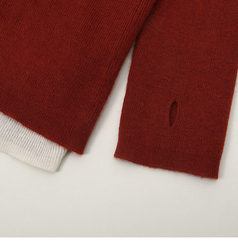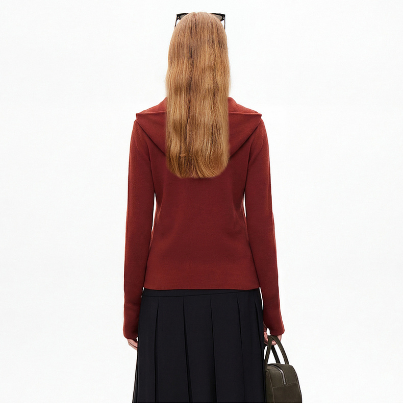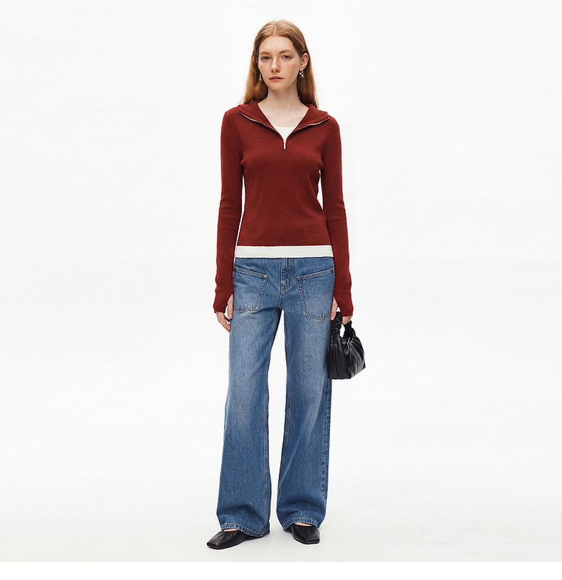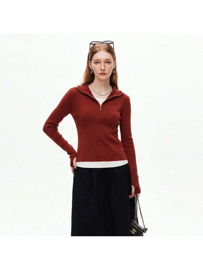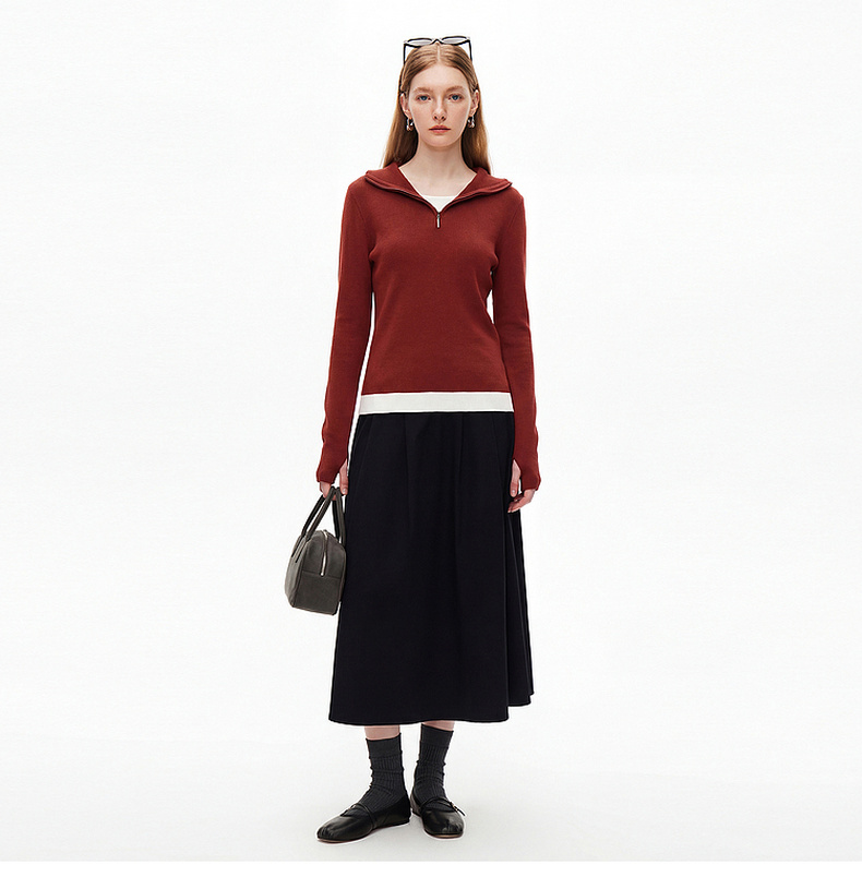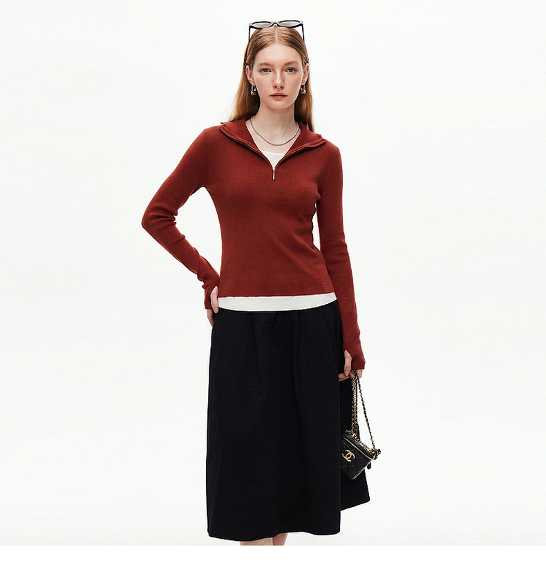 天猫同步【复古明艳港风】拉夏贝尔/La Chapelle连帽半拉链撞色拼接假两件针织衫修身显瘦打底衫内外搭
