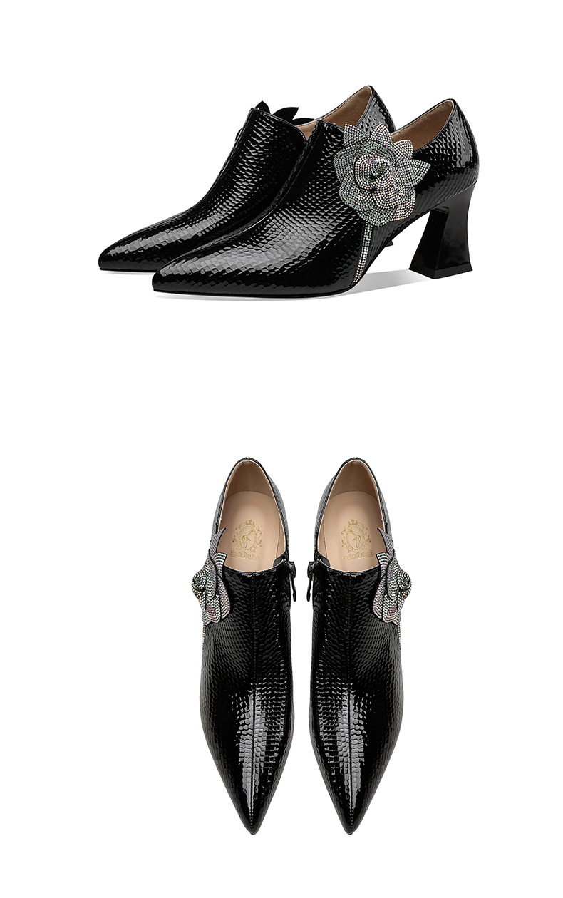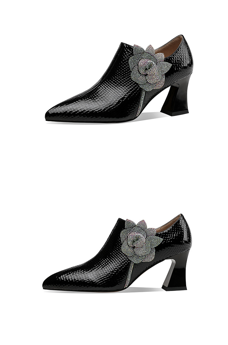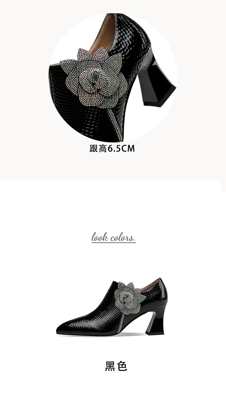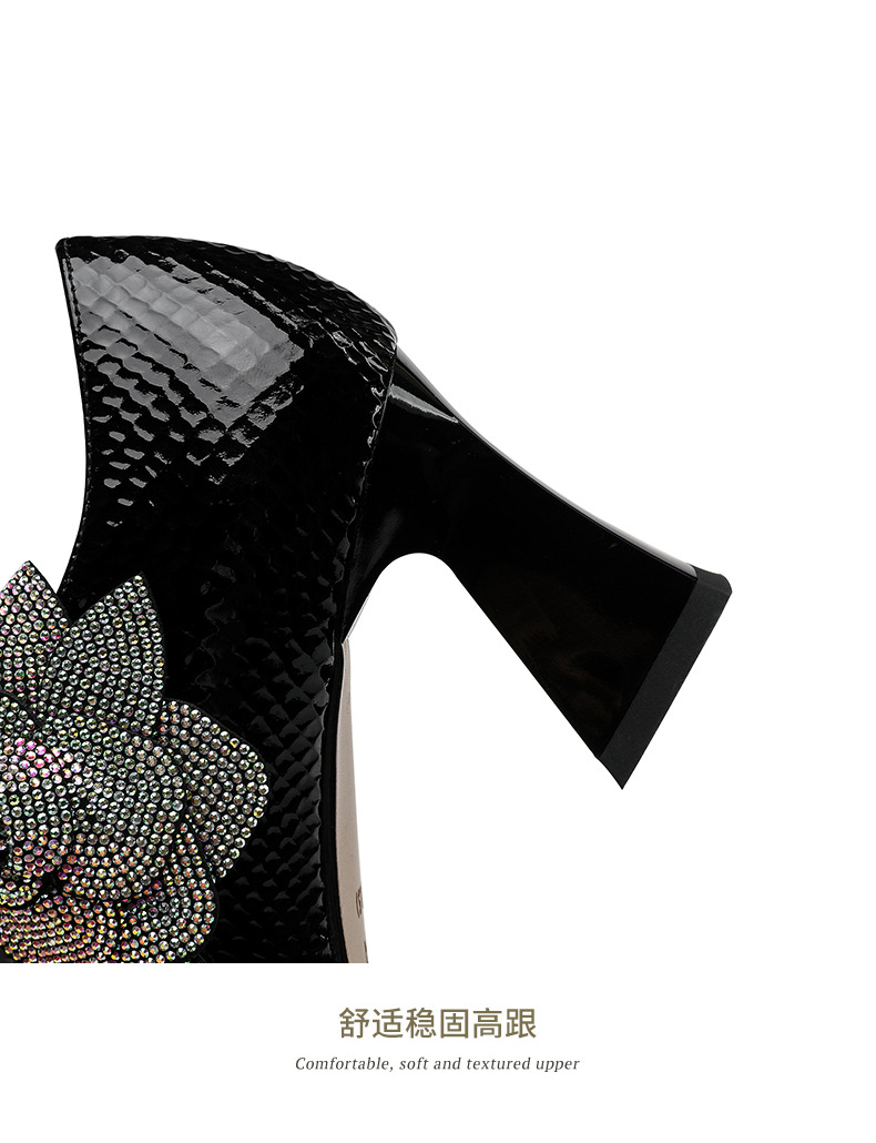 法式高跟鞋,新款时尚花朵水钻女鞋尖头漆皮粗跟深口单鞋SSZP-1911