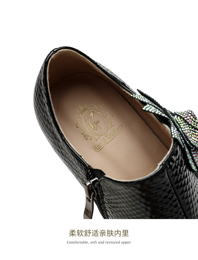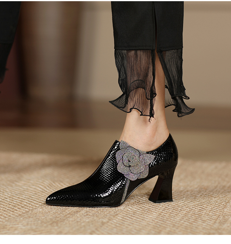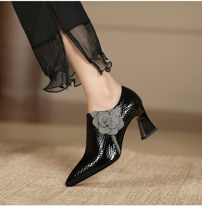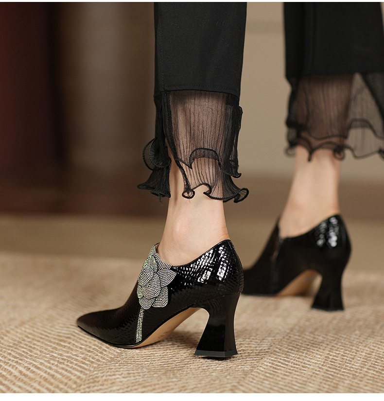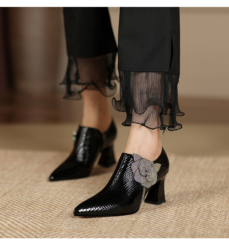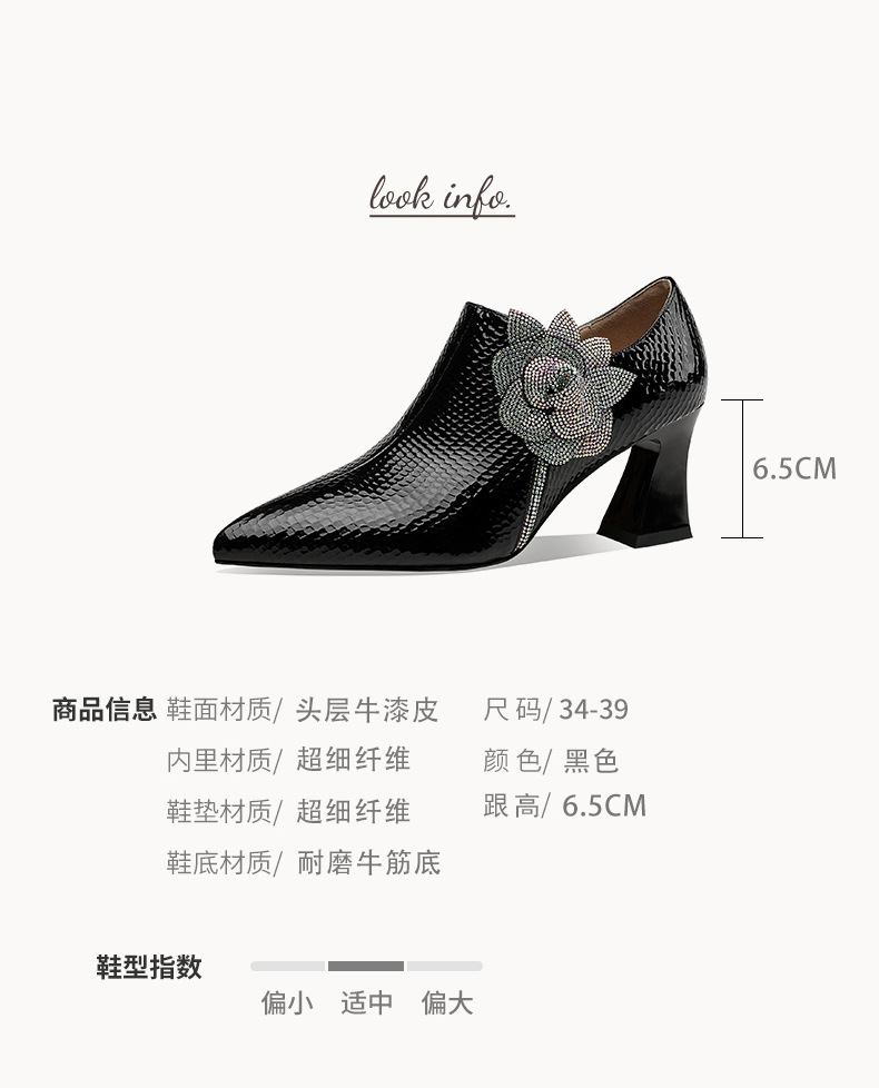 法式高跟鞋,新款时尚花朵水钻女鞋尖头漆皮粗跟深口单鞋SSZP-1911