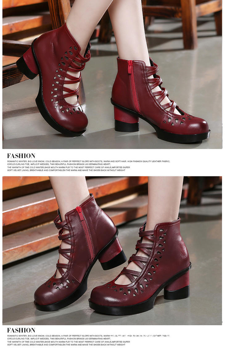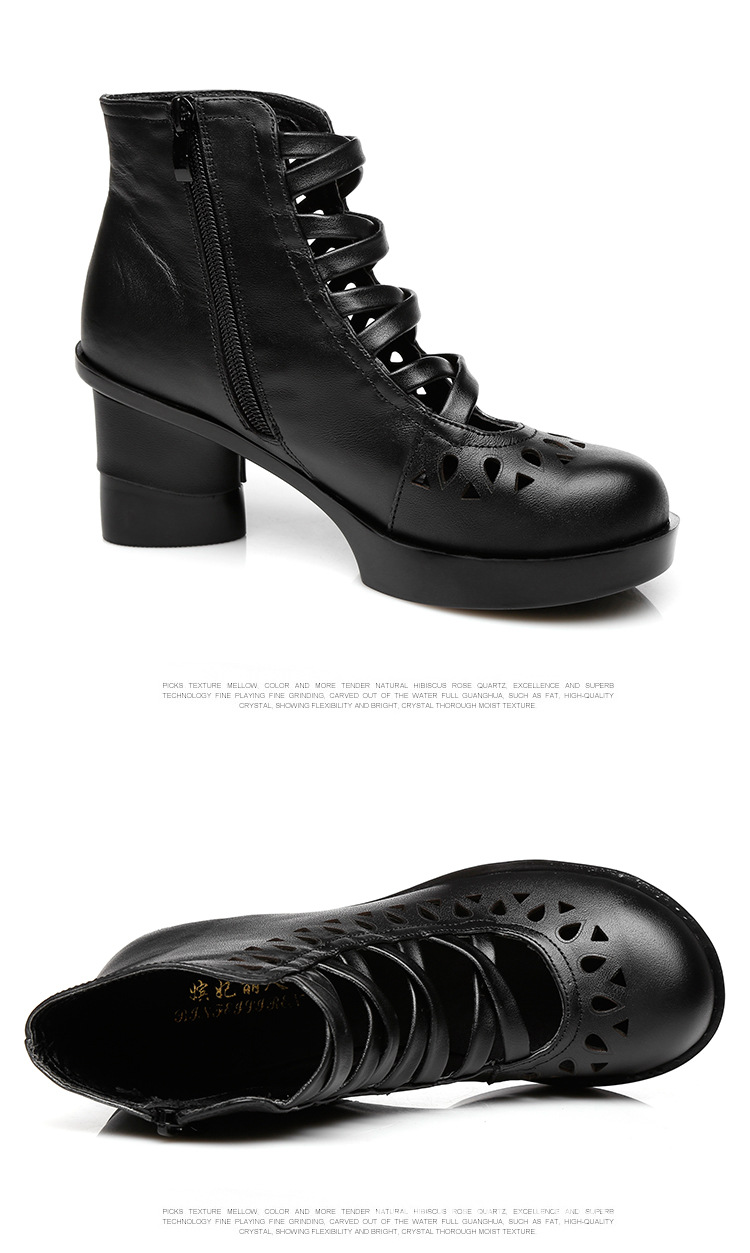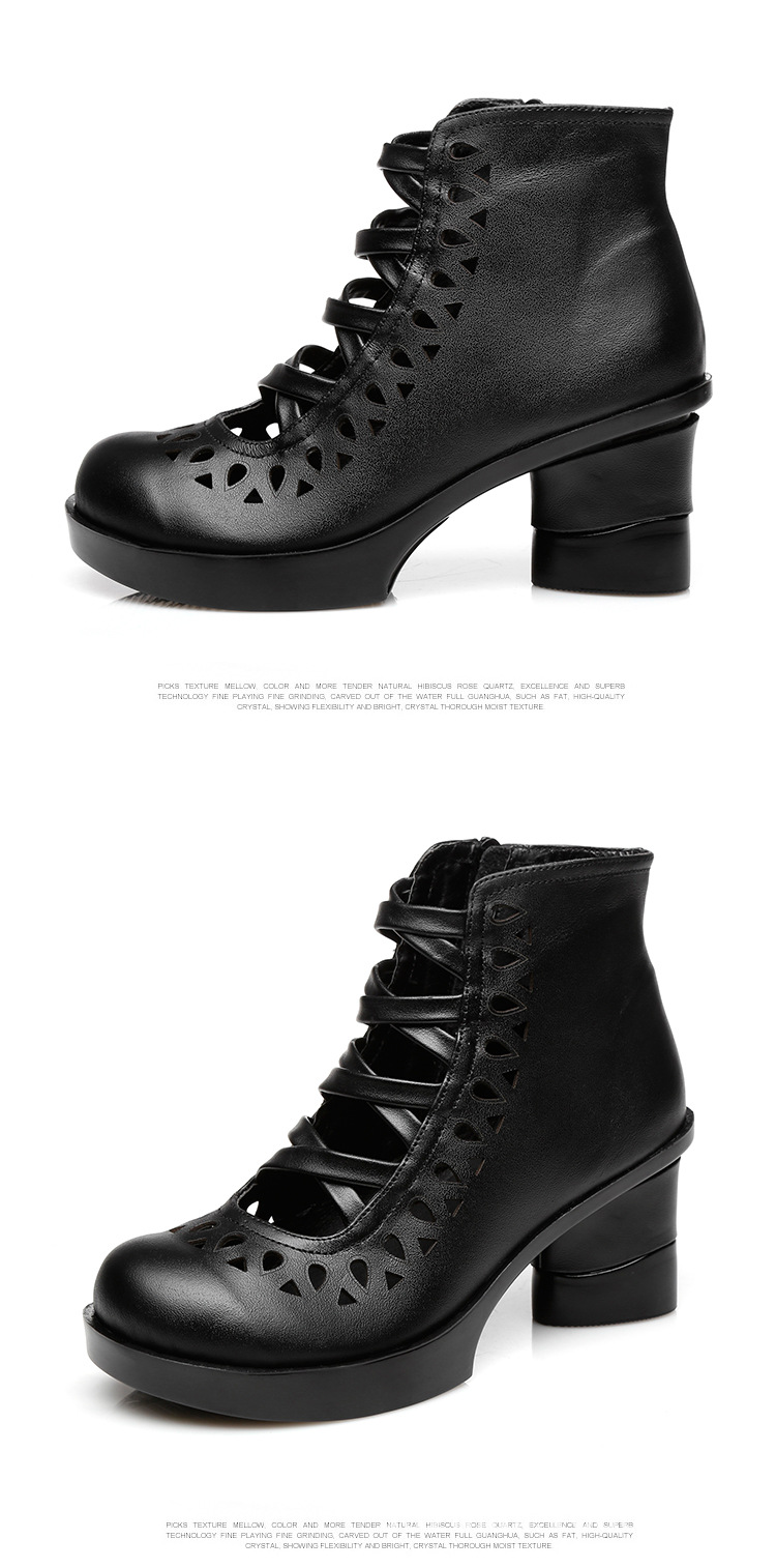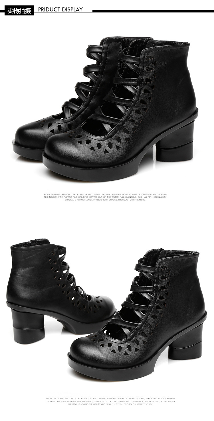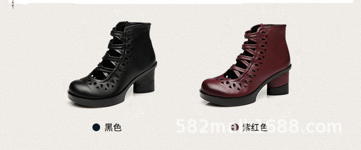 ZYFS0254新款民族风真皮缕空交叉绑带高帮粗跟凉靴