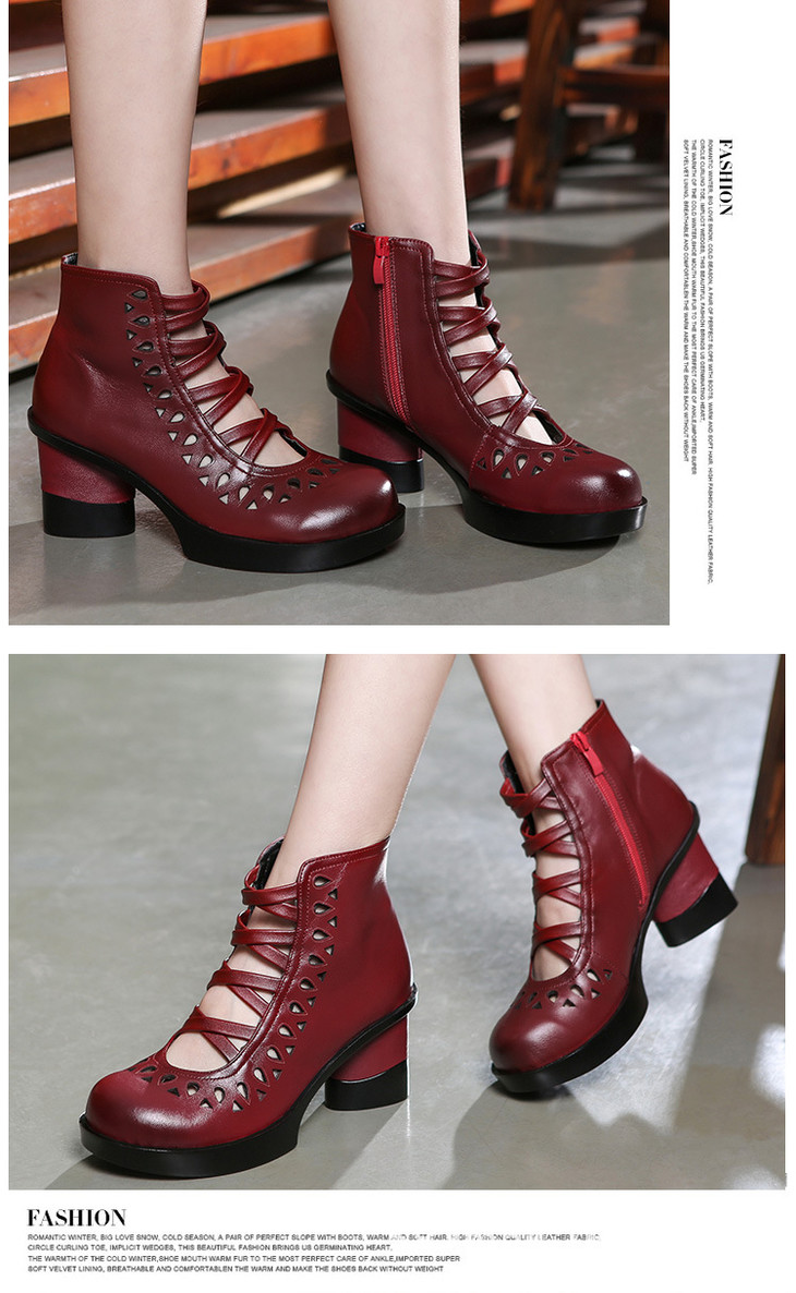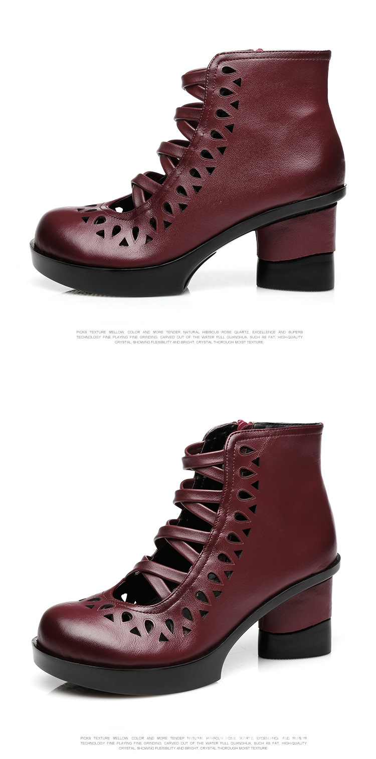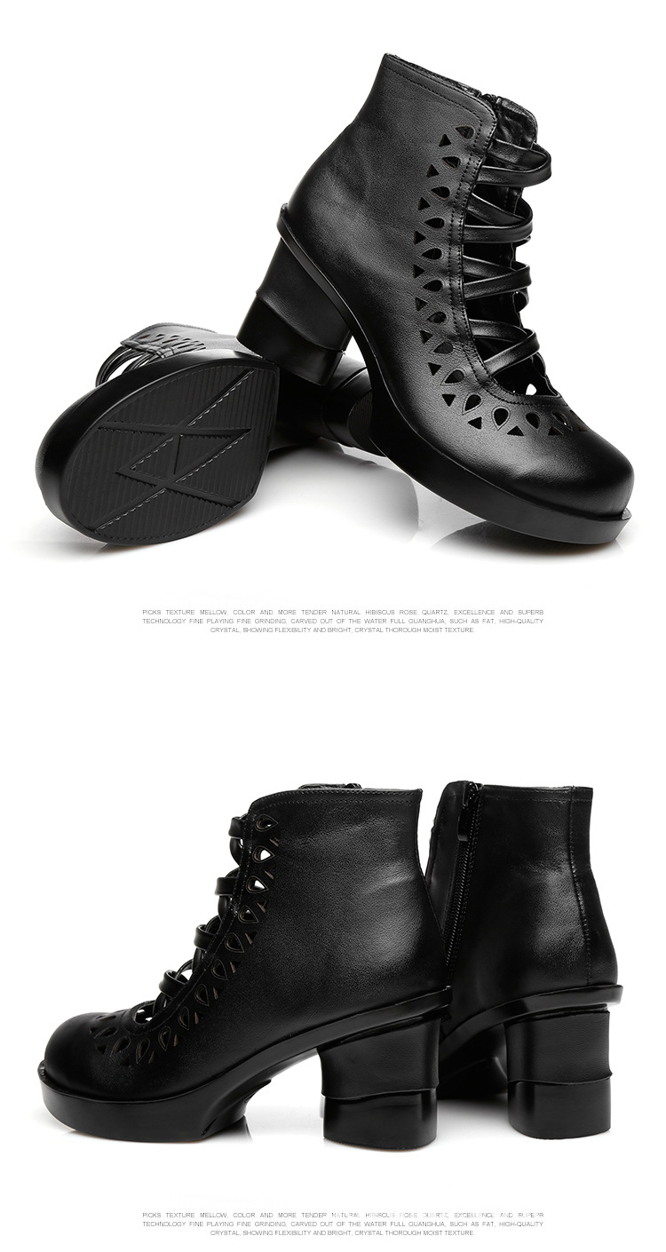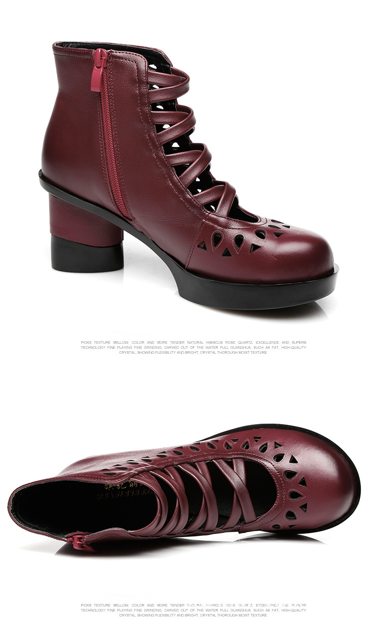 ZYFS0254新款民族风真皮缕空交叉绑带高帮粗跟凉靴