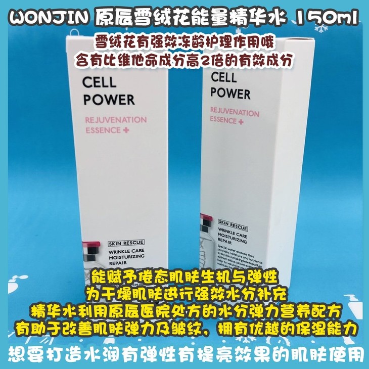 WONJIN 原辰雪绒花能量精华水 150ml👍雪绒花有强效冻龄护理作用哦😎,含有比维他命成分高2倍的有效成分,能赋予倦态肌肤生机与弹性💪,为干燥肌肤进行强效水分补充💦。精华水利用原辰医院处方的水分弹力营养配方,有助于改善肌肤弹力及皱纹,拥有优越的保湿能力,长效维持肌肤水润😝。推荐皮肤干燥,想要打造水润有弹性有提亮效果的肌肤使用。
