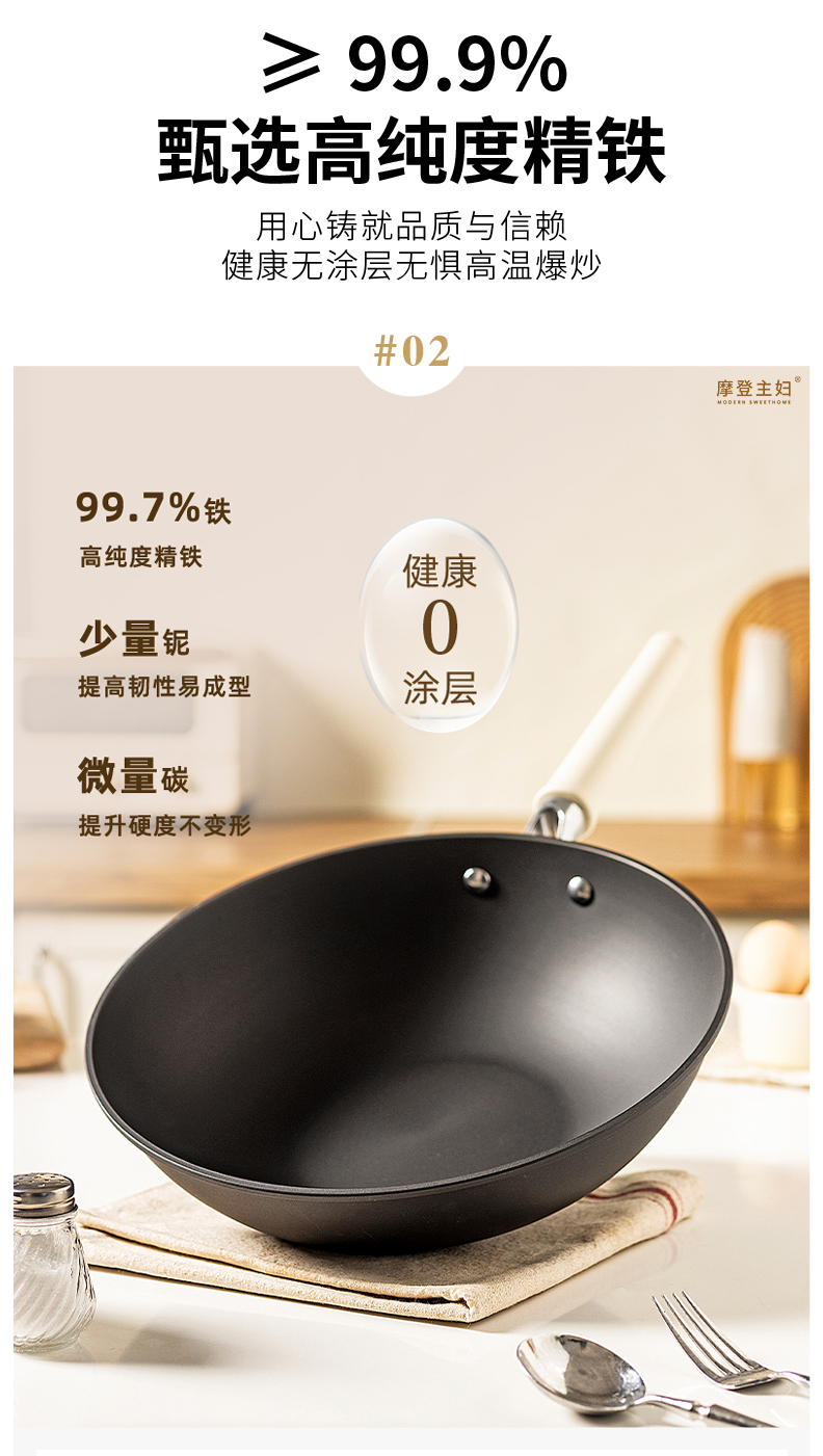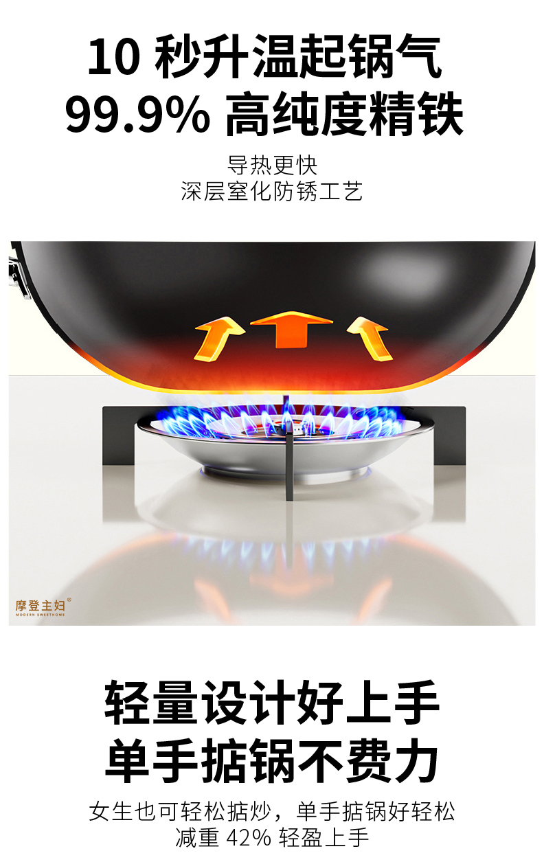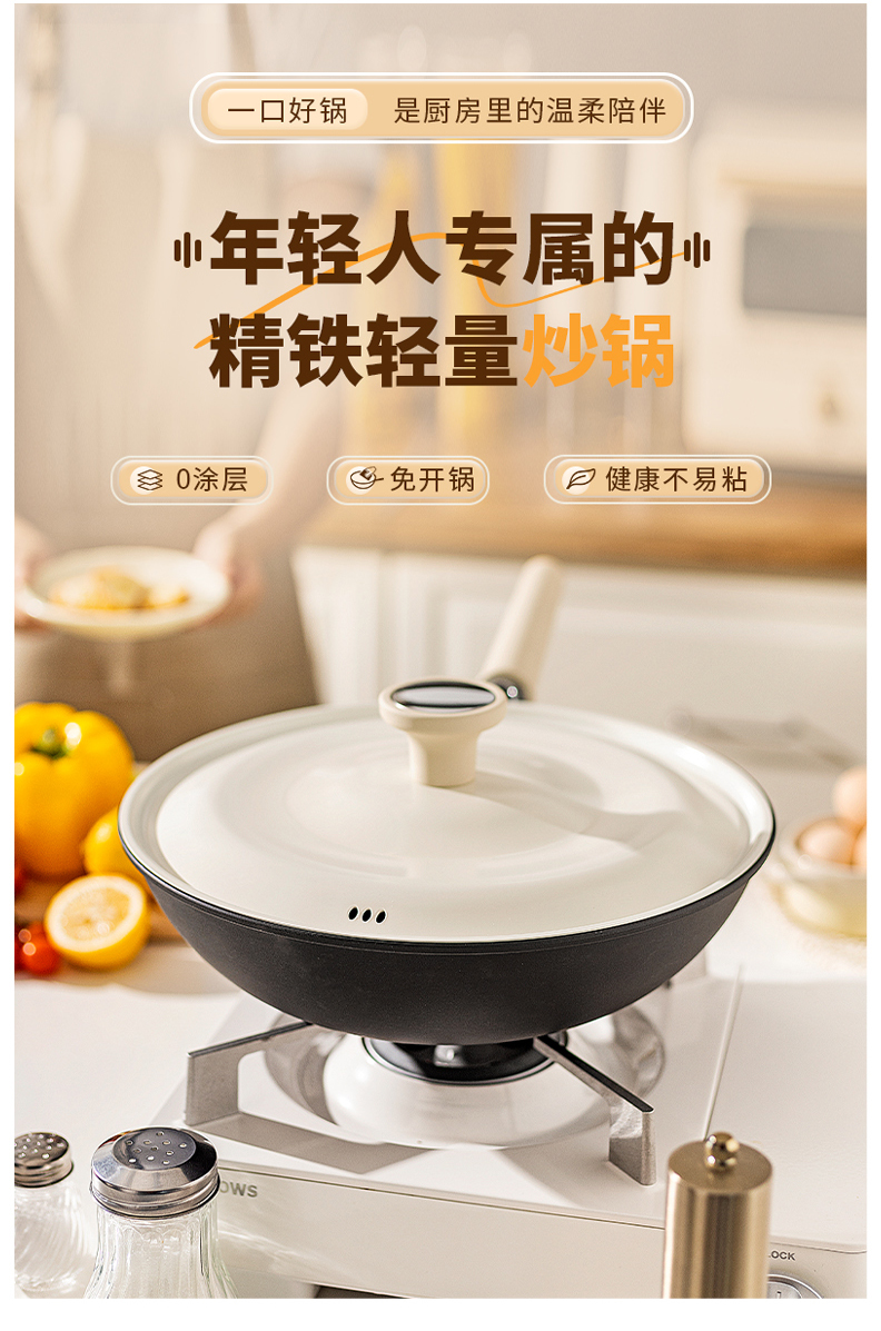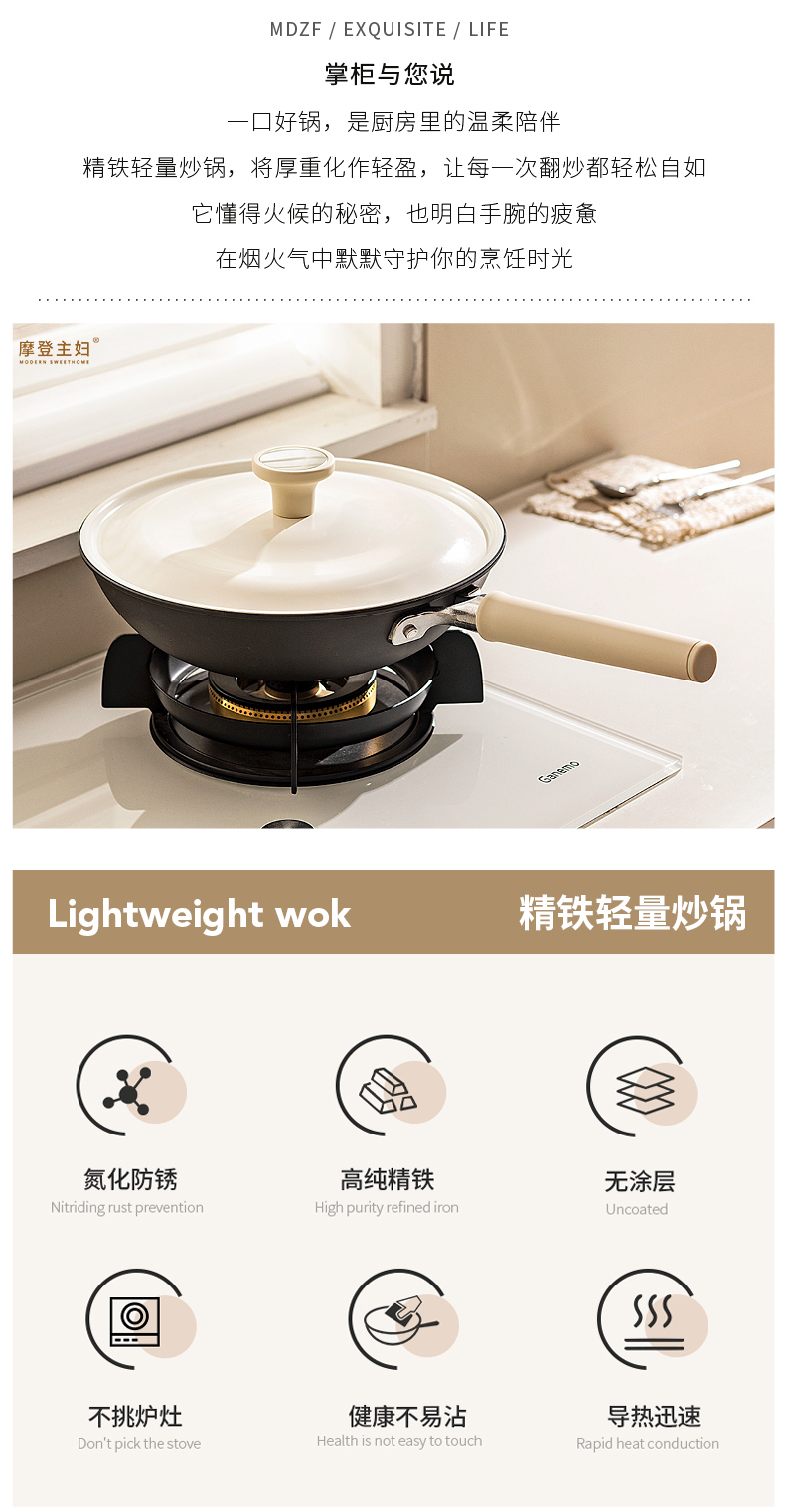 摩登主妇女士轻量铁锅炒菜锅家用电磁炉煤气灶专用无涂层不粘炒锅