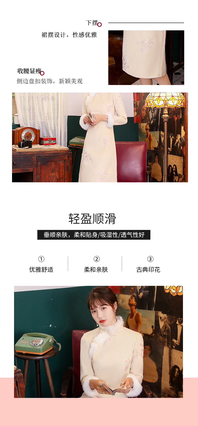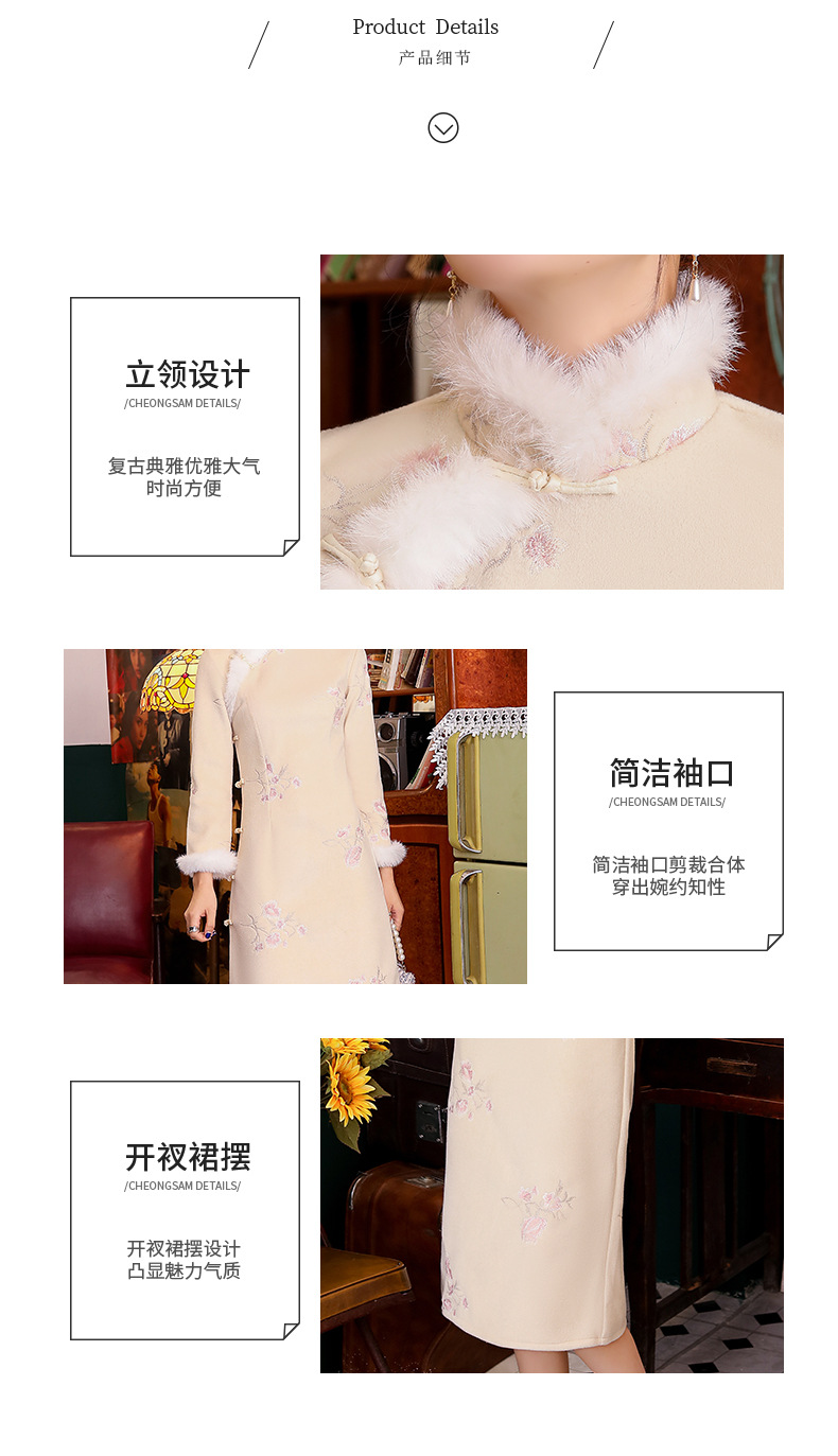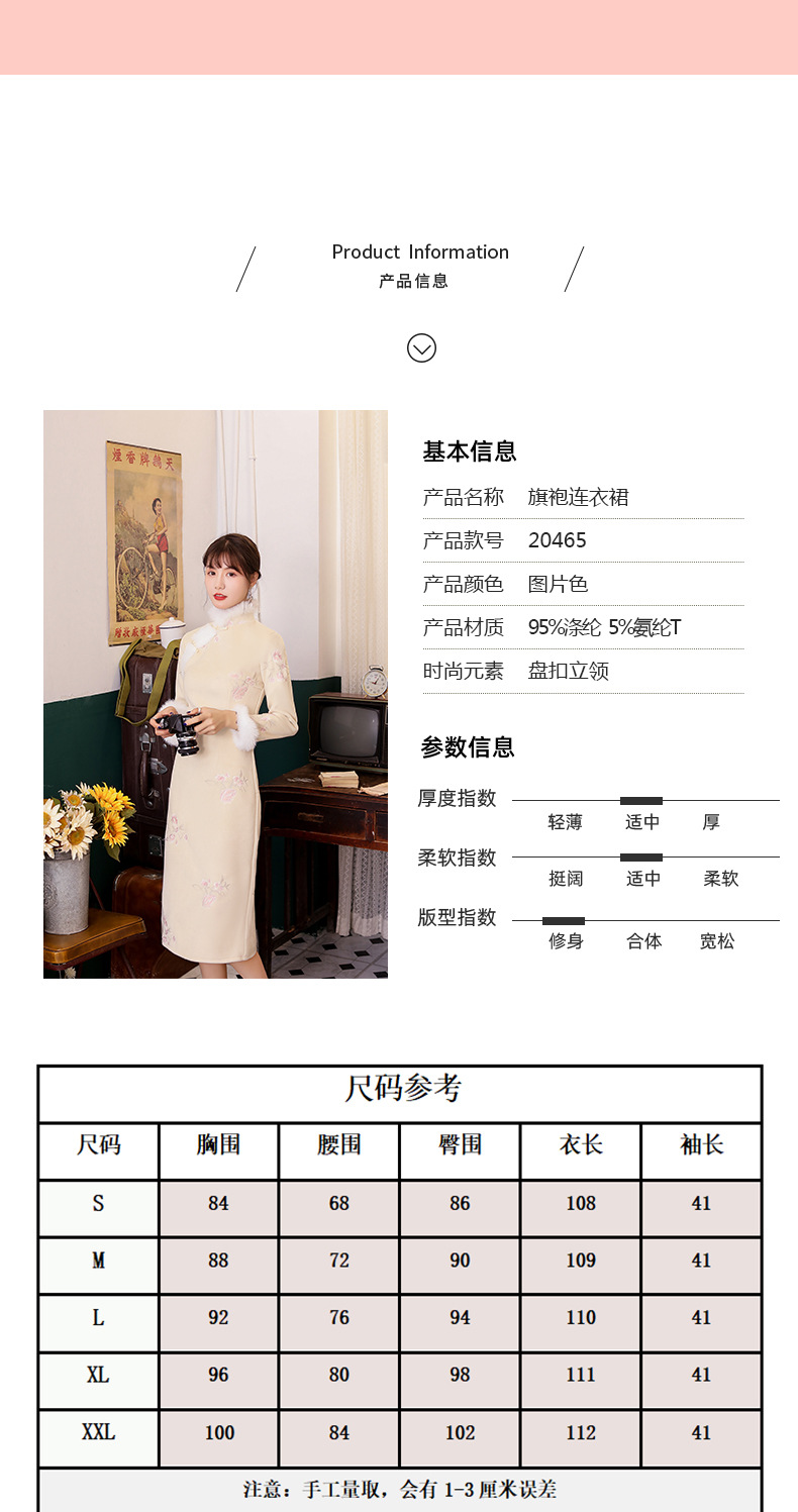 YZY-20465秋冬款旗袍粉花兔可爱少女旗袍修身素色加厚连衣裙旗袍