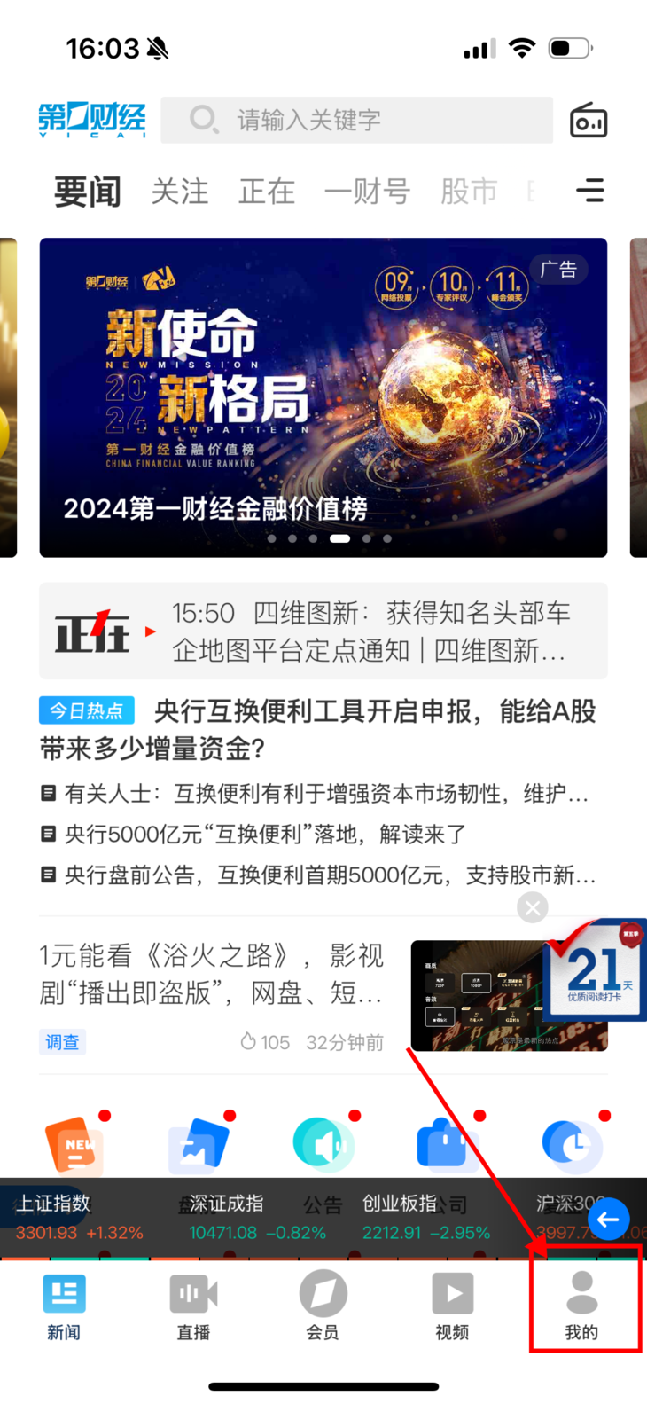 1、打开【第一财经】旗舰APP点击右下角"我的"