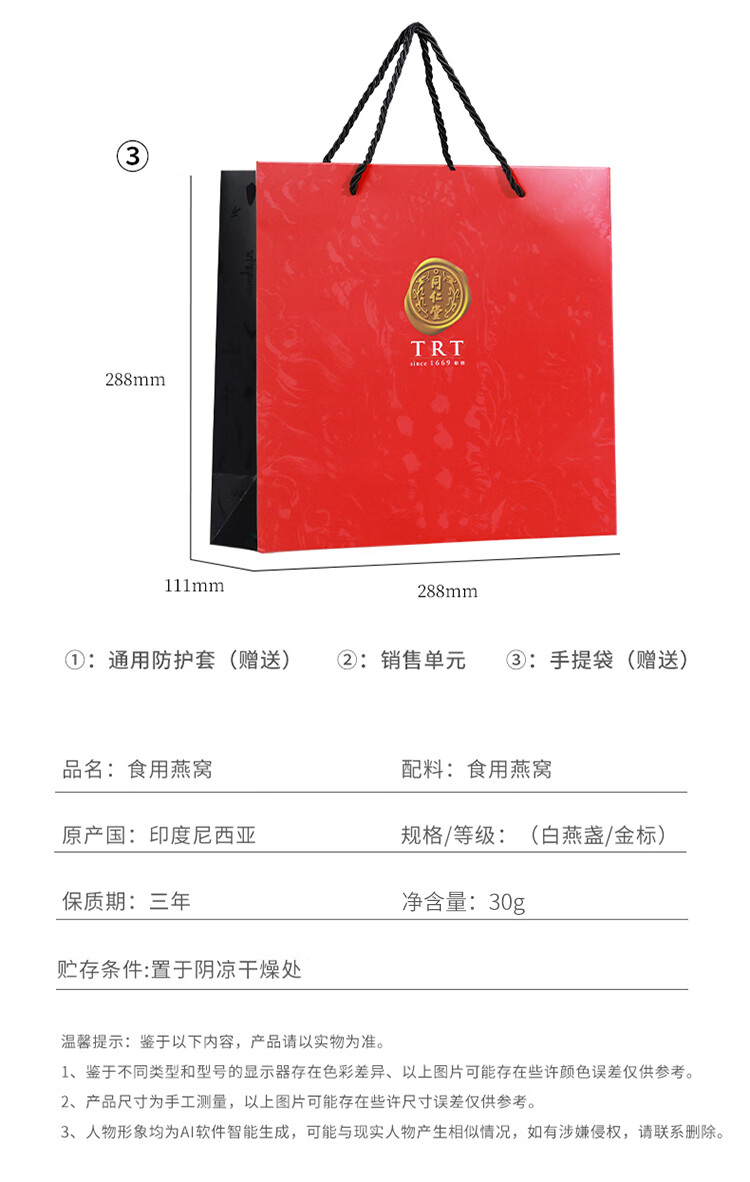 【正宗同仁堂品牌】北京同仁堂 干燕窝(金标款)印尼-30克 燕窝干盏 孕妇滋补 可溯源 送礼盒SY