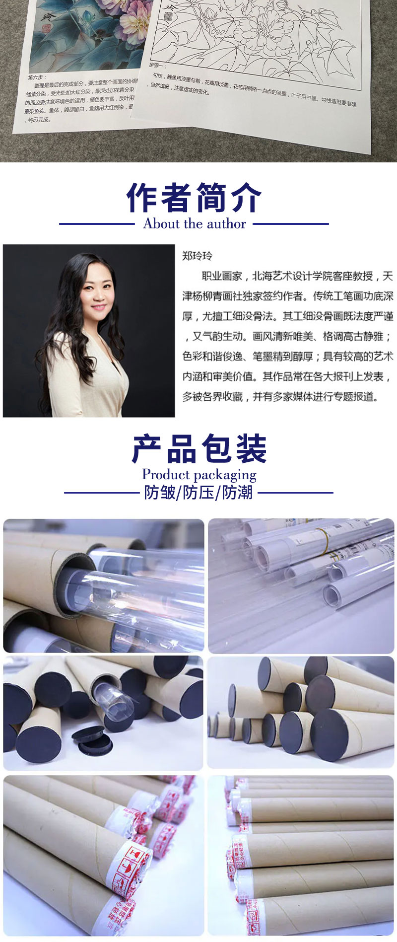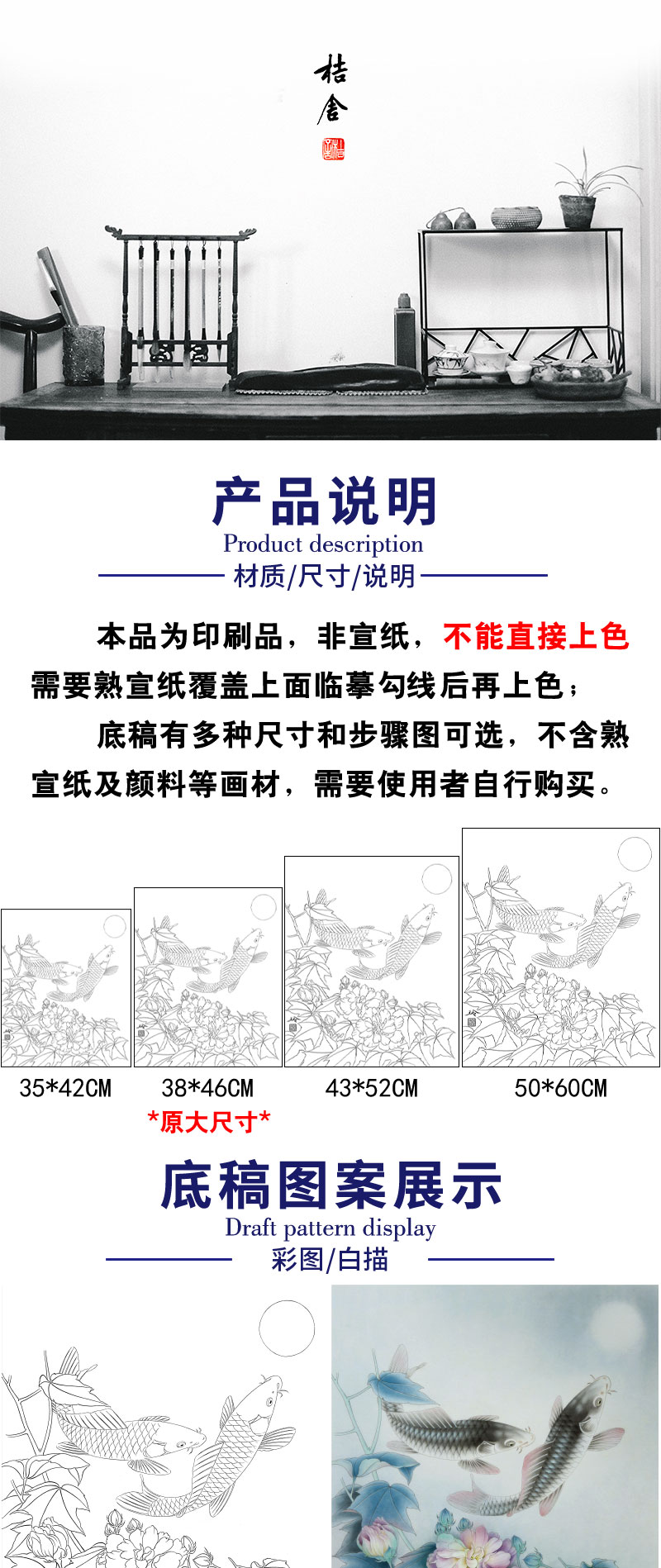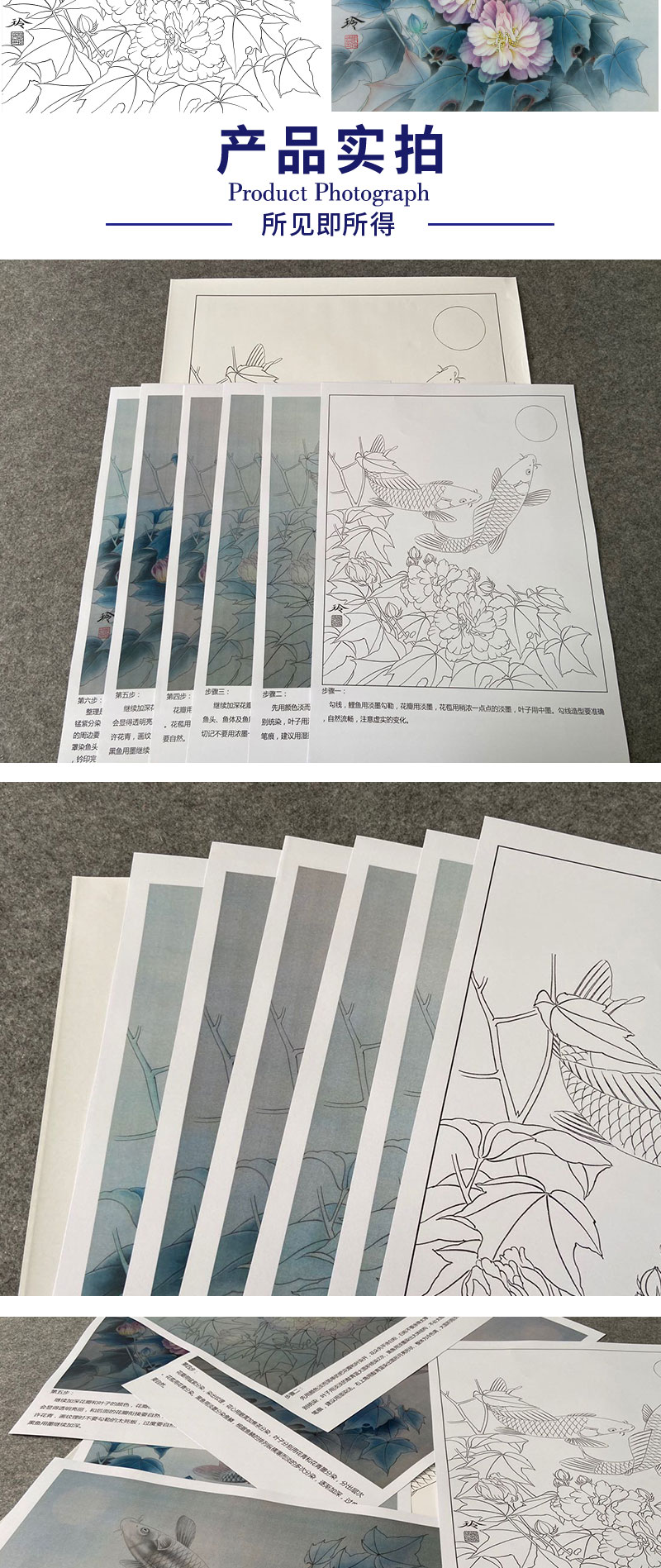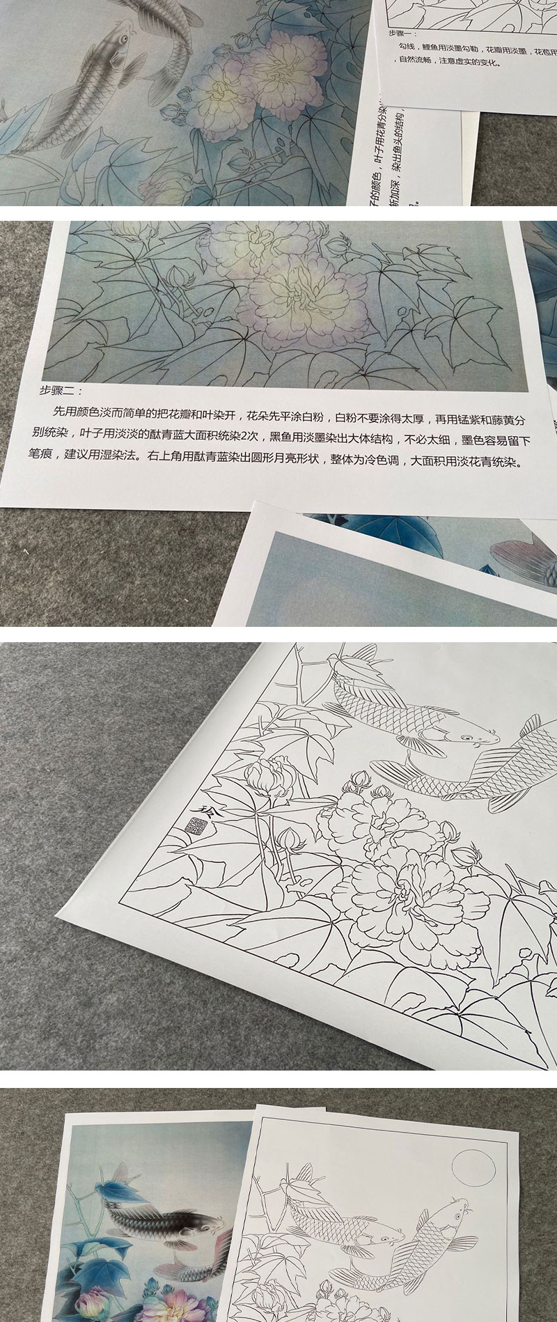 【有步骤、大彩图】郑玲玲工笔画白描底稿《花月同醉》牡丹鲤鱼初学者临摹花鸟线稿ZL34