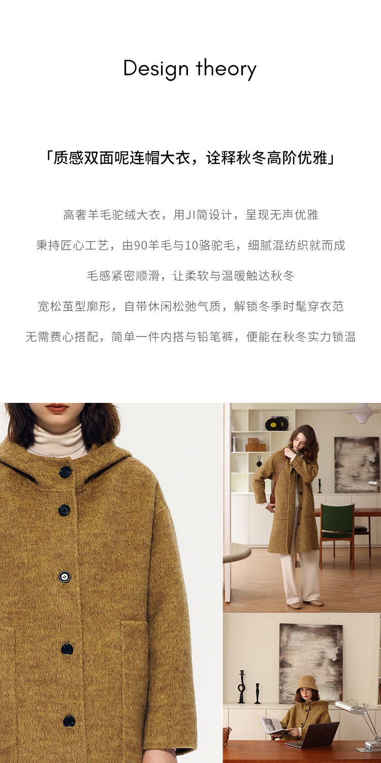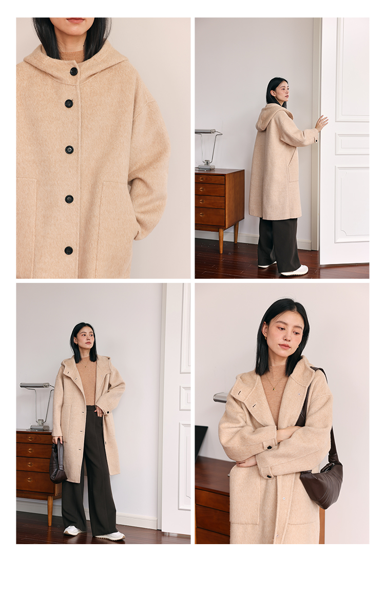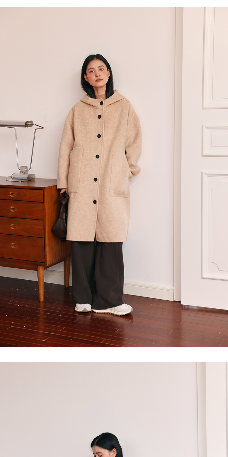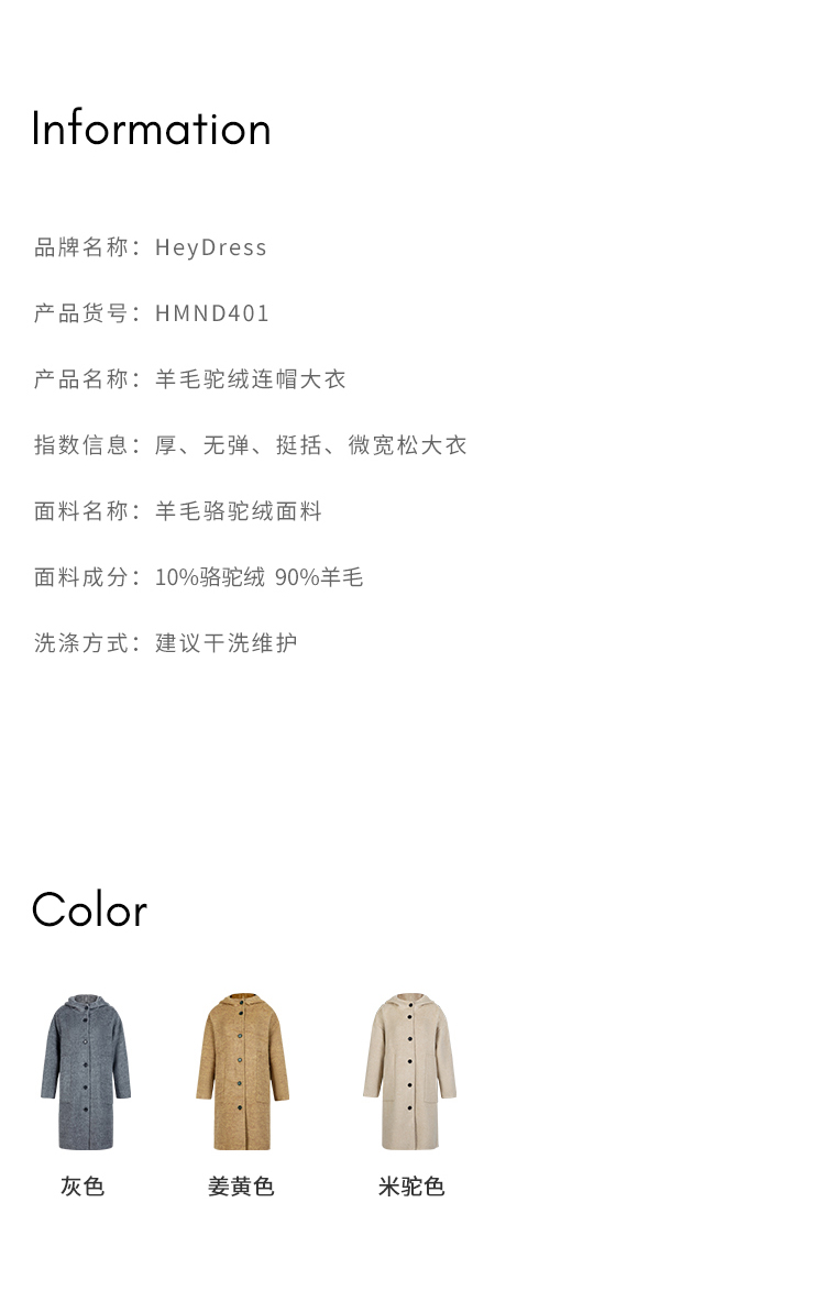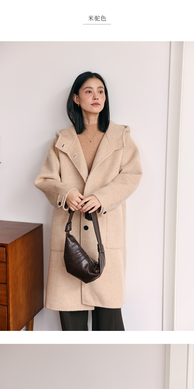 HeyDress连帽毛呢外套女秋冬宽松休闲羊毛长大衣骆驼绒气质双面呢